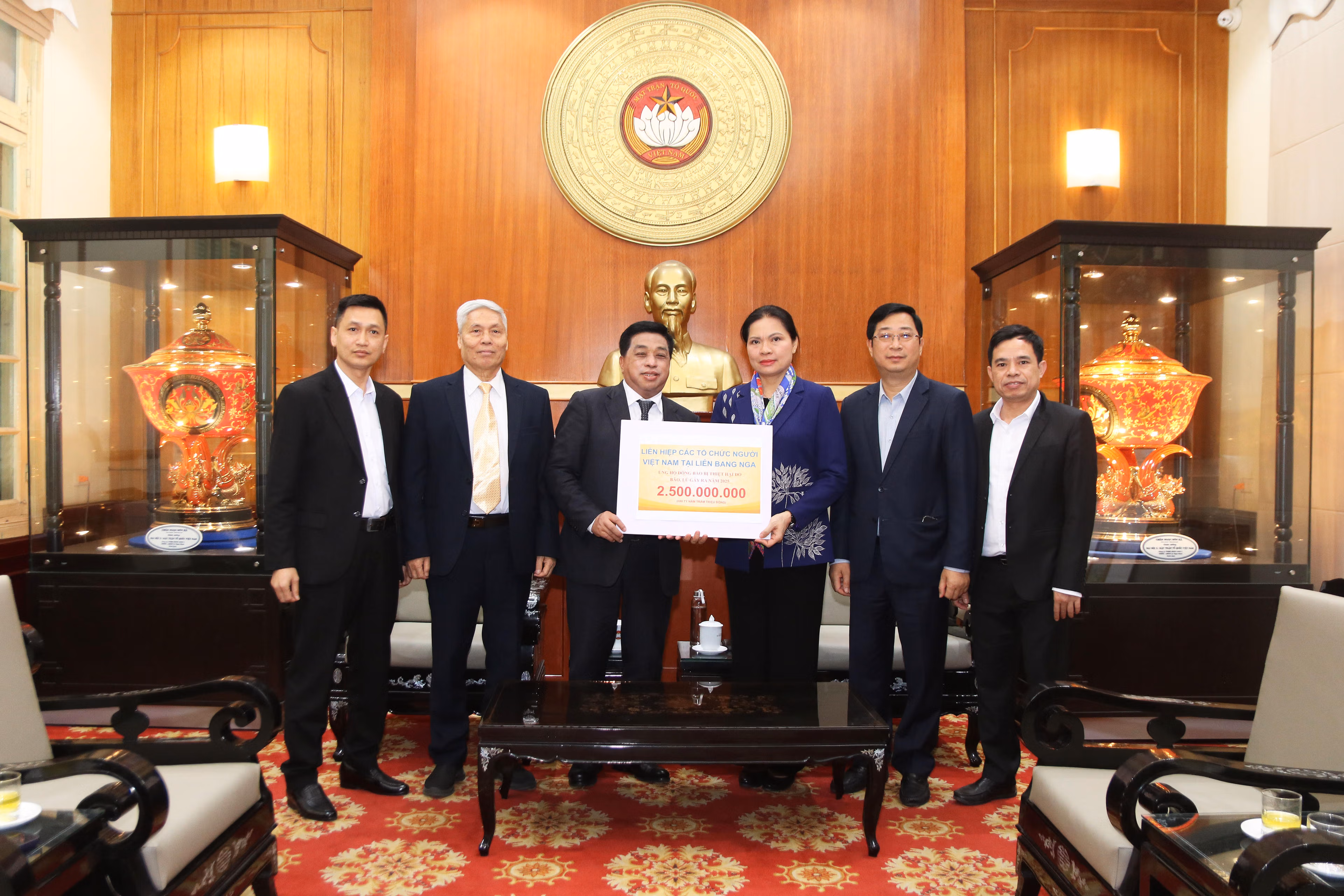 Sáng 30/12, tại Hà Nội, bà Hà Thị Nga, Ủy viên Trung ương Đảng, Phó Chủ tịch UBTƯ MTTQ Việt Nam đã tiếp nhận số tiền 2,5 tỷ đồng từ Liên hiệp các tổ chức người Việt Nam tại Liên bang Nga ủng hộ đồng bào bị thiệt hại do bão lũ gây ra.