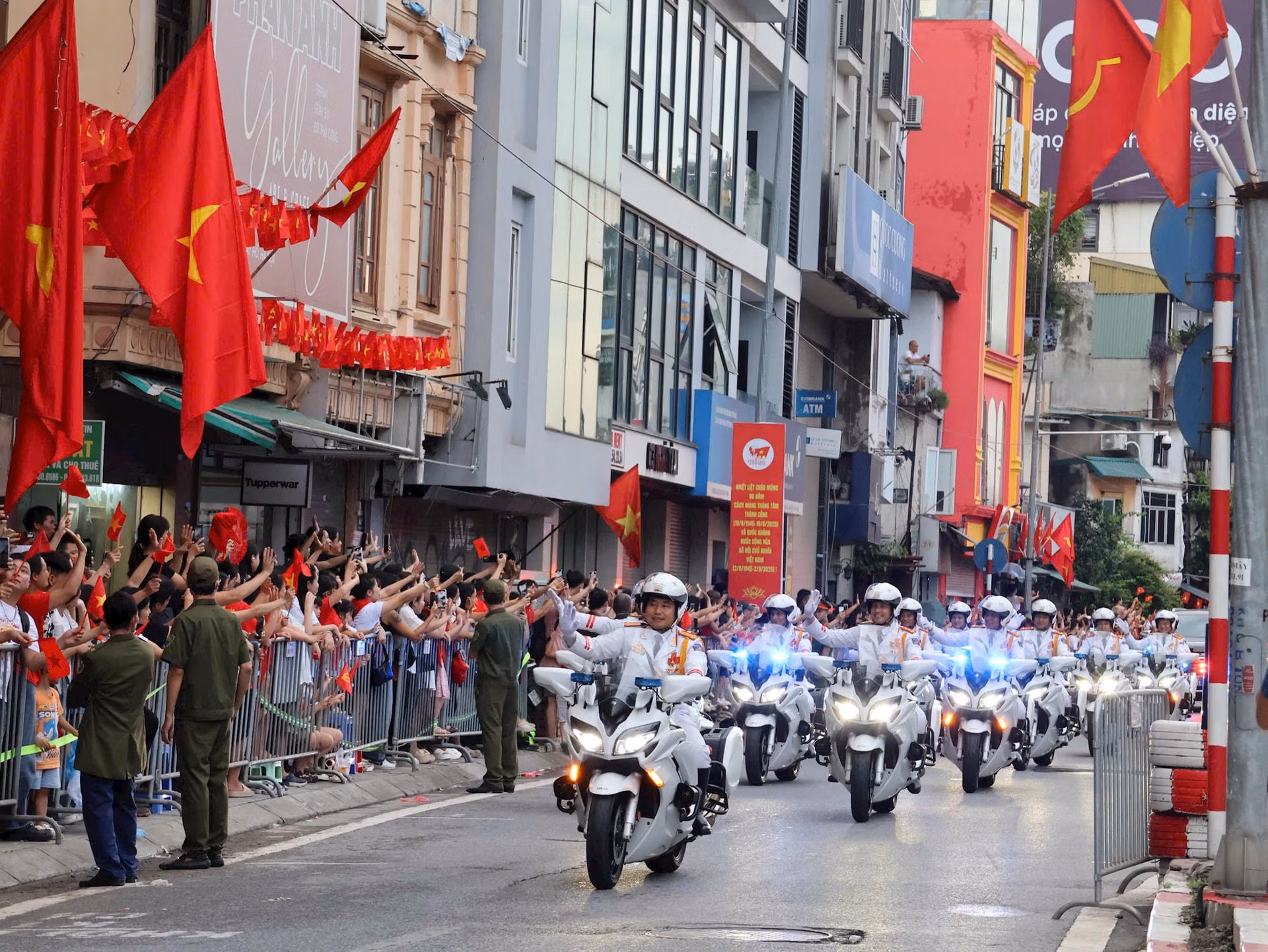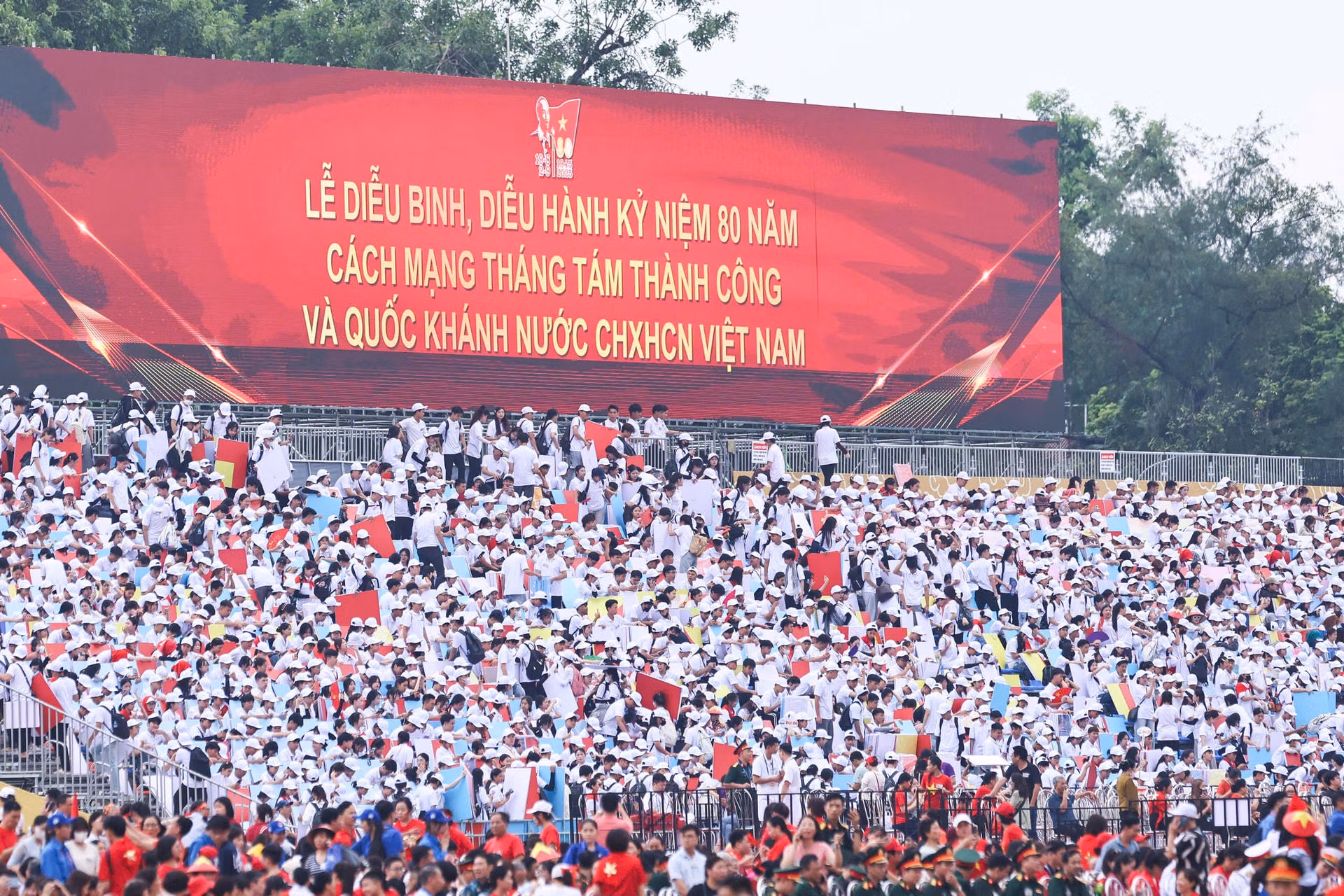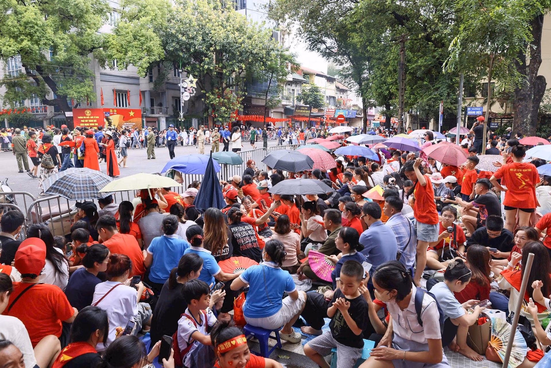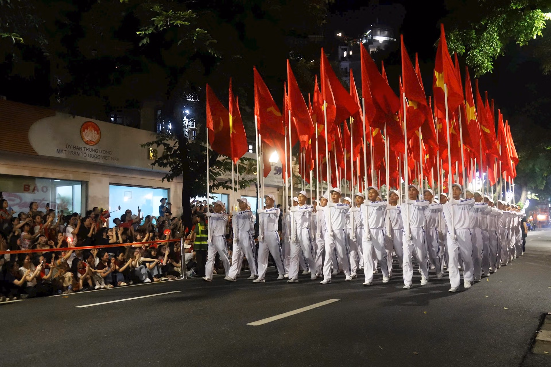 19h15: Hàng nghìn người đứng kín hai bên đường, tất cả đều háo hức, chờ đợi đoàn diễu binh tại Quảng trường Ba Đình. Sắc đỏ của áo, cờ kết hợp với tiếng reo hò tạo nên không khí tưng bừng, tràn đầy niềm tự hào. Cả khu vực như một biển người rực rỡ, sẵn sàng chào đón Lễ Sơ duyệt chính thức diễn ra.