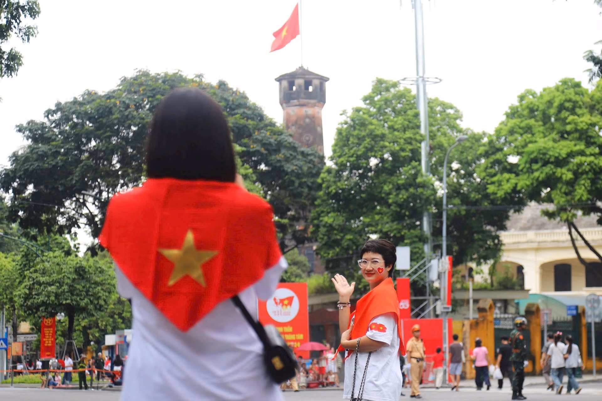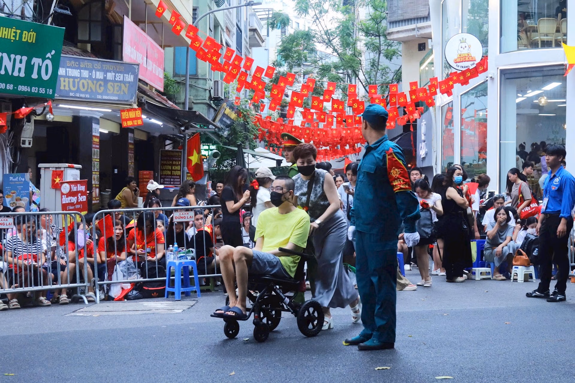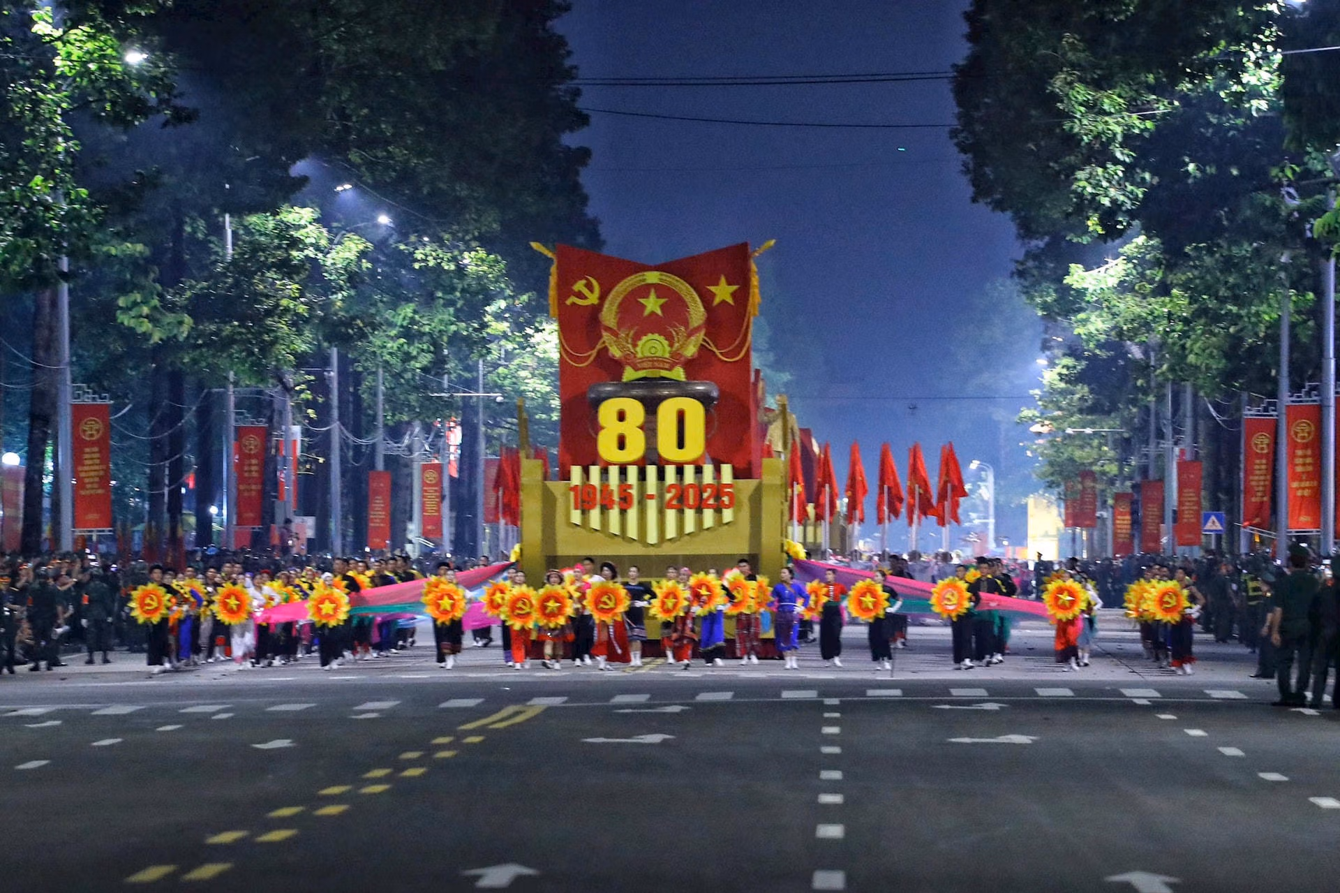 19h15: Hàng nghìn người đứng kín hai bên đường, tất cả đều háo hức, chờ đợi đoàn diễu binh tại Quảng trường Ba Đình. Sắc đỏ của áo, cờ kết hợp với tiếng reo hò tạo nên không khí tưng bừng, tràn đầy niềm tự hào. Cả khu vực như một biển người rực rỡ, sẵn sàng chào đón Lễ Sơ duyệt chính thức diễn ra.