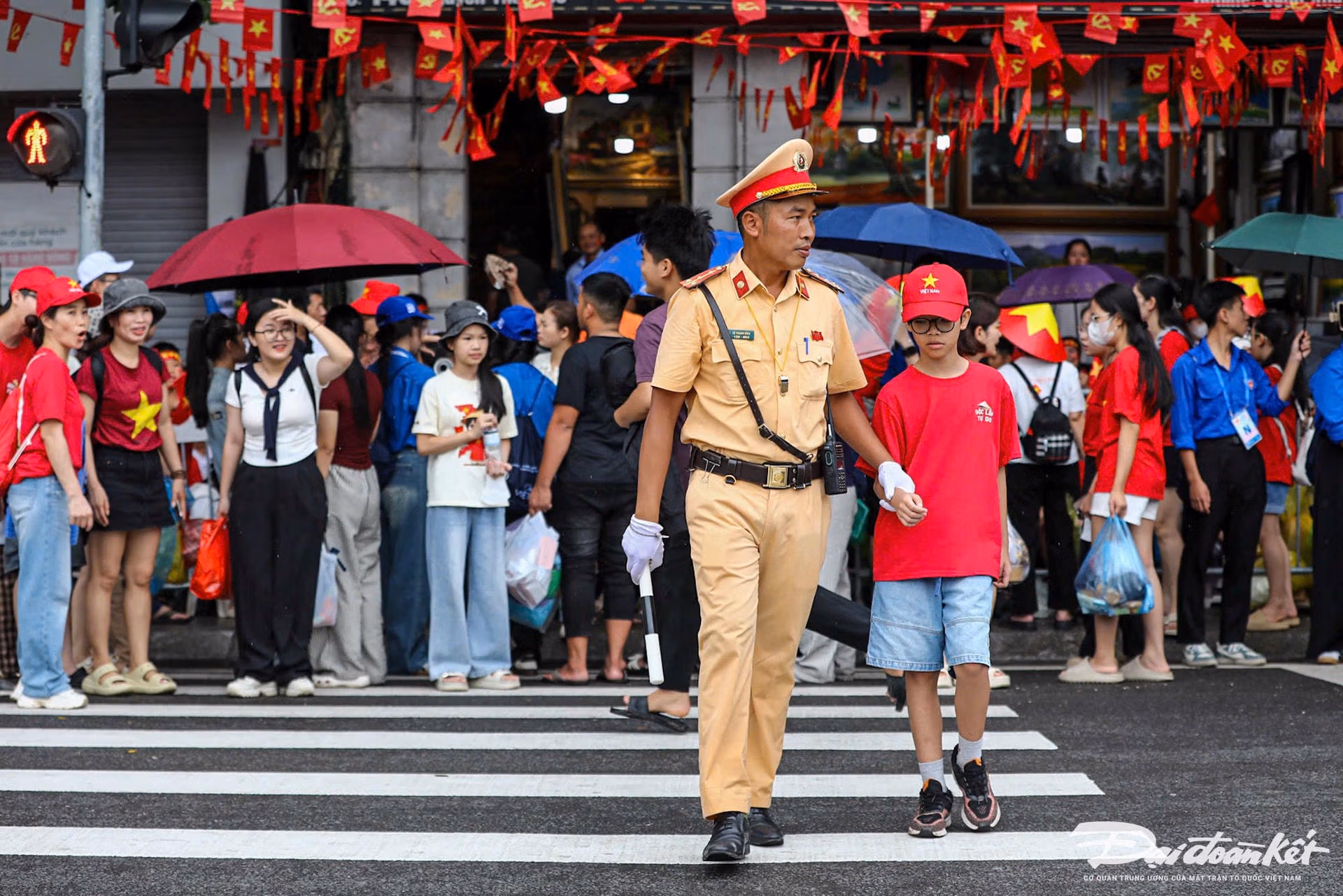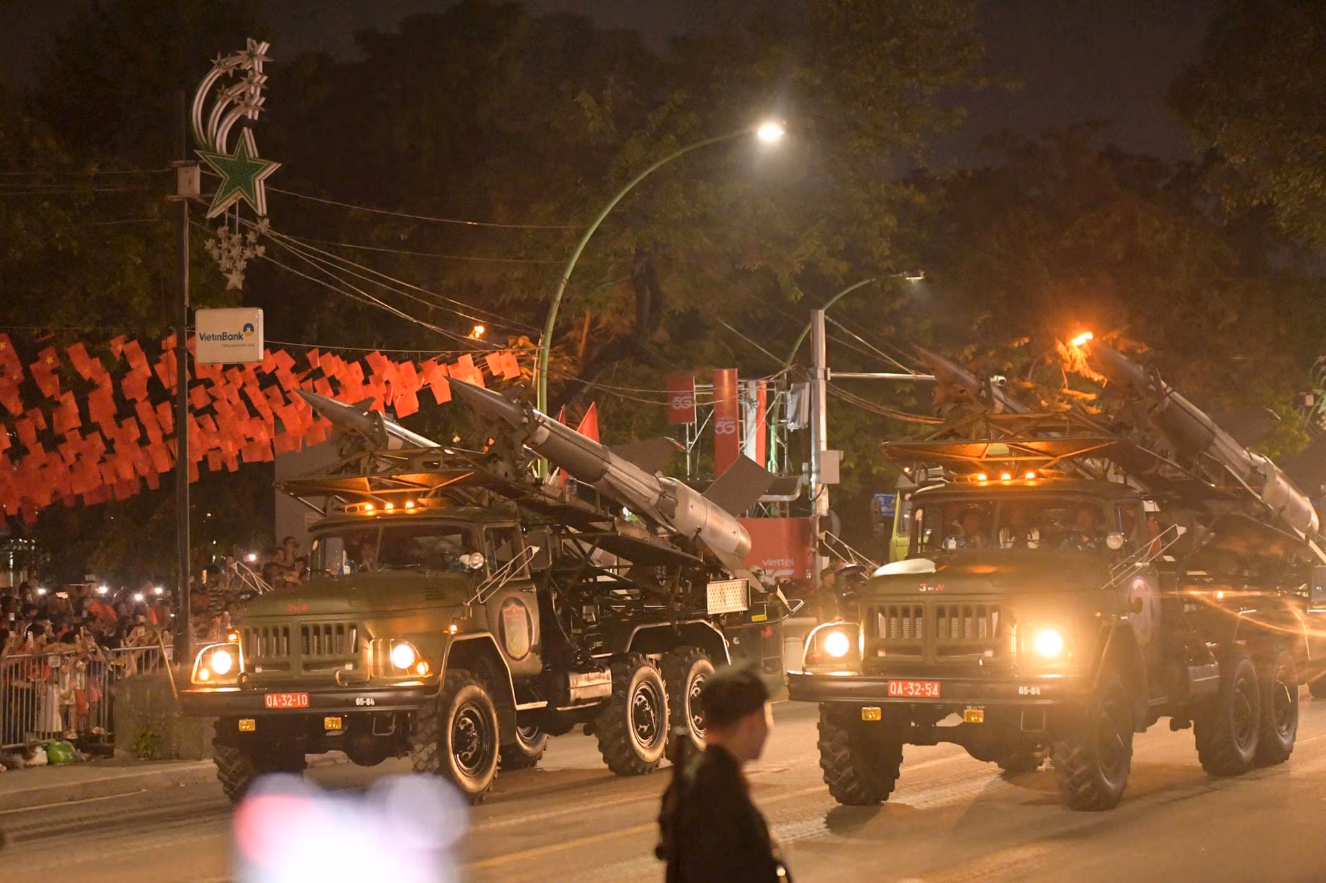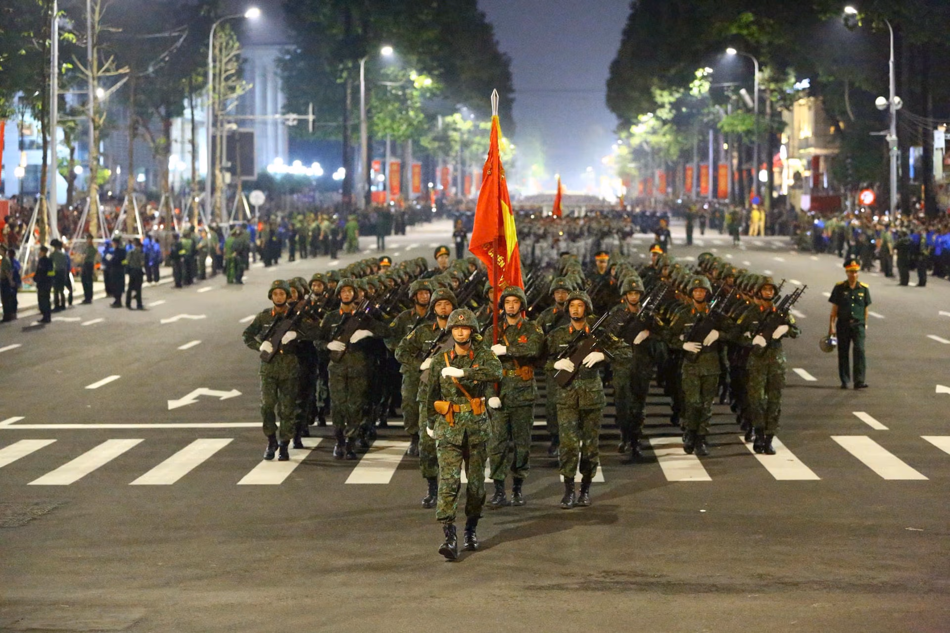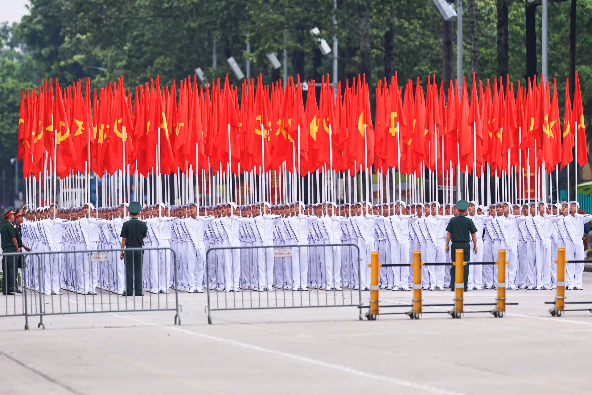 19h15: Hàng nghìn người đứng kín hai bên đường, tất cả đều háo hức, chờ đợi đoàn diễu binh tại Quảng trường Ba Đình. Sắc đỏ của áo, cờ kết hợp với tiếng reo hò tạo nên không khí tưng bừng, tràn đầy niềm tự hào. Cả khu vực như một biển người rực rỡ, sẵn sàng chào đón Lễ Sơ duyệt chính thức diễn ra.