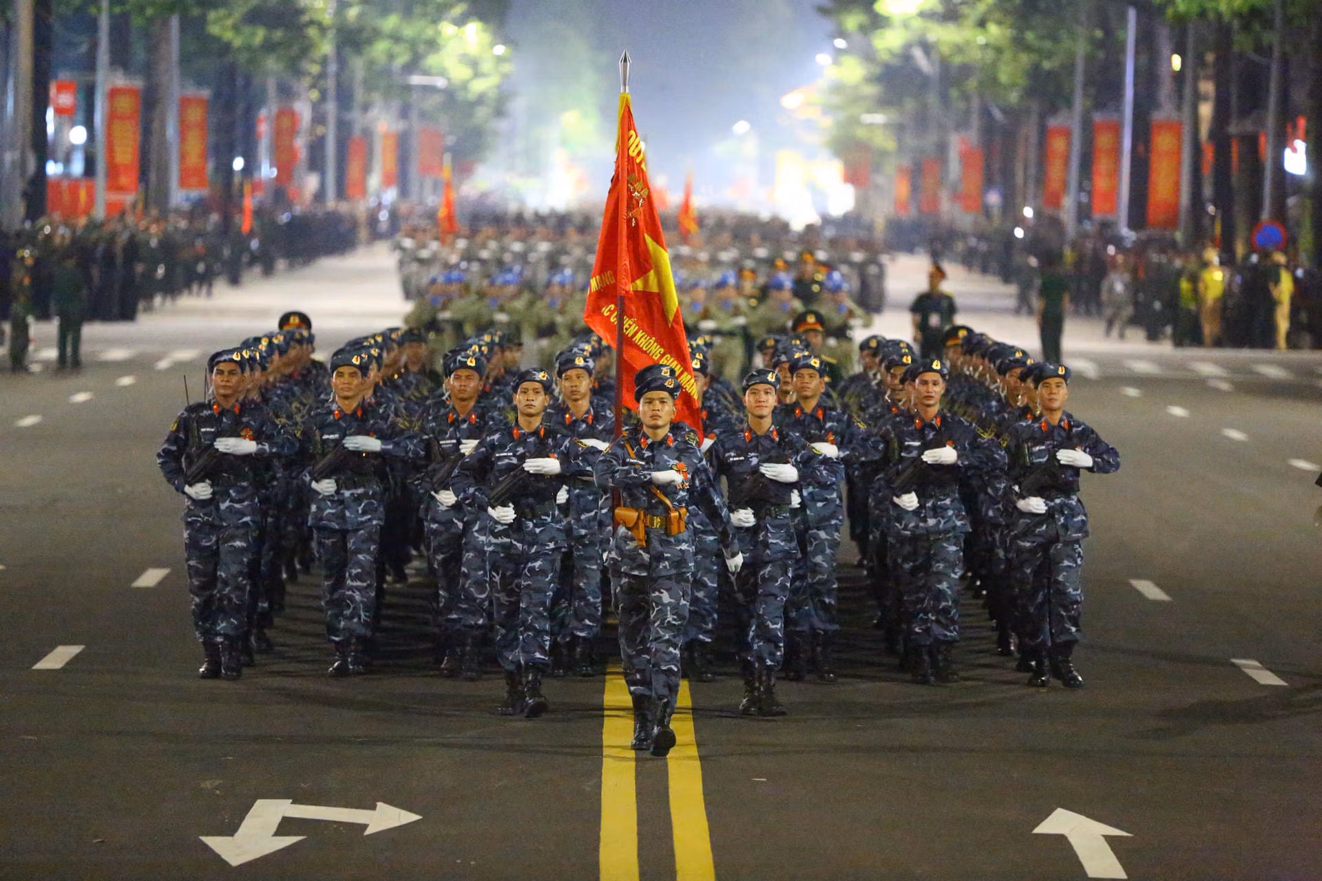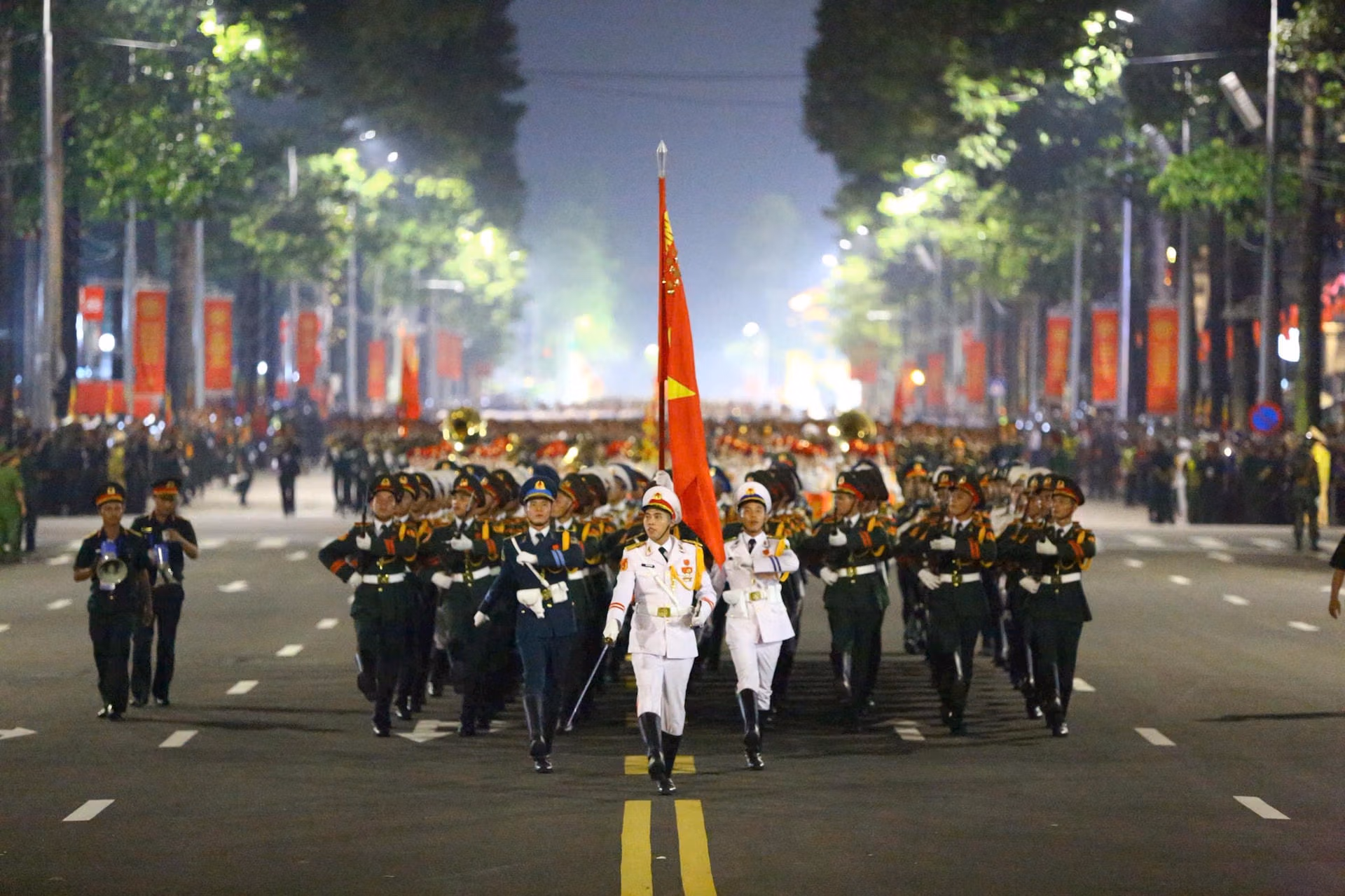 20h30: Sau xe biểu tượng 80 năm Cách mạng tháng Tám và Quốc khánh 2/9, khối Quân kỳ và khối Danh dự 3 quân chủng tiến vào Lễ đài.