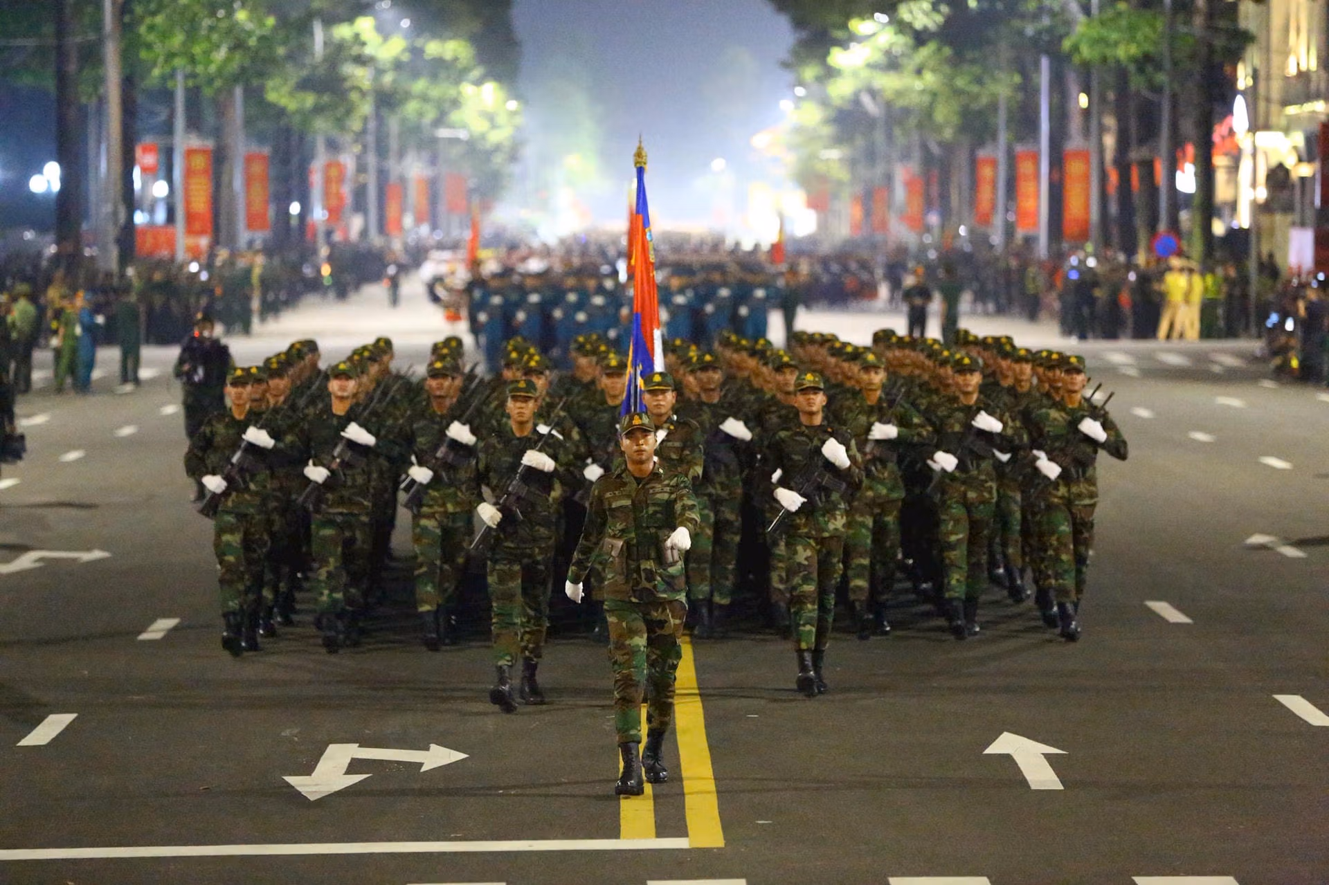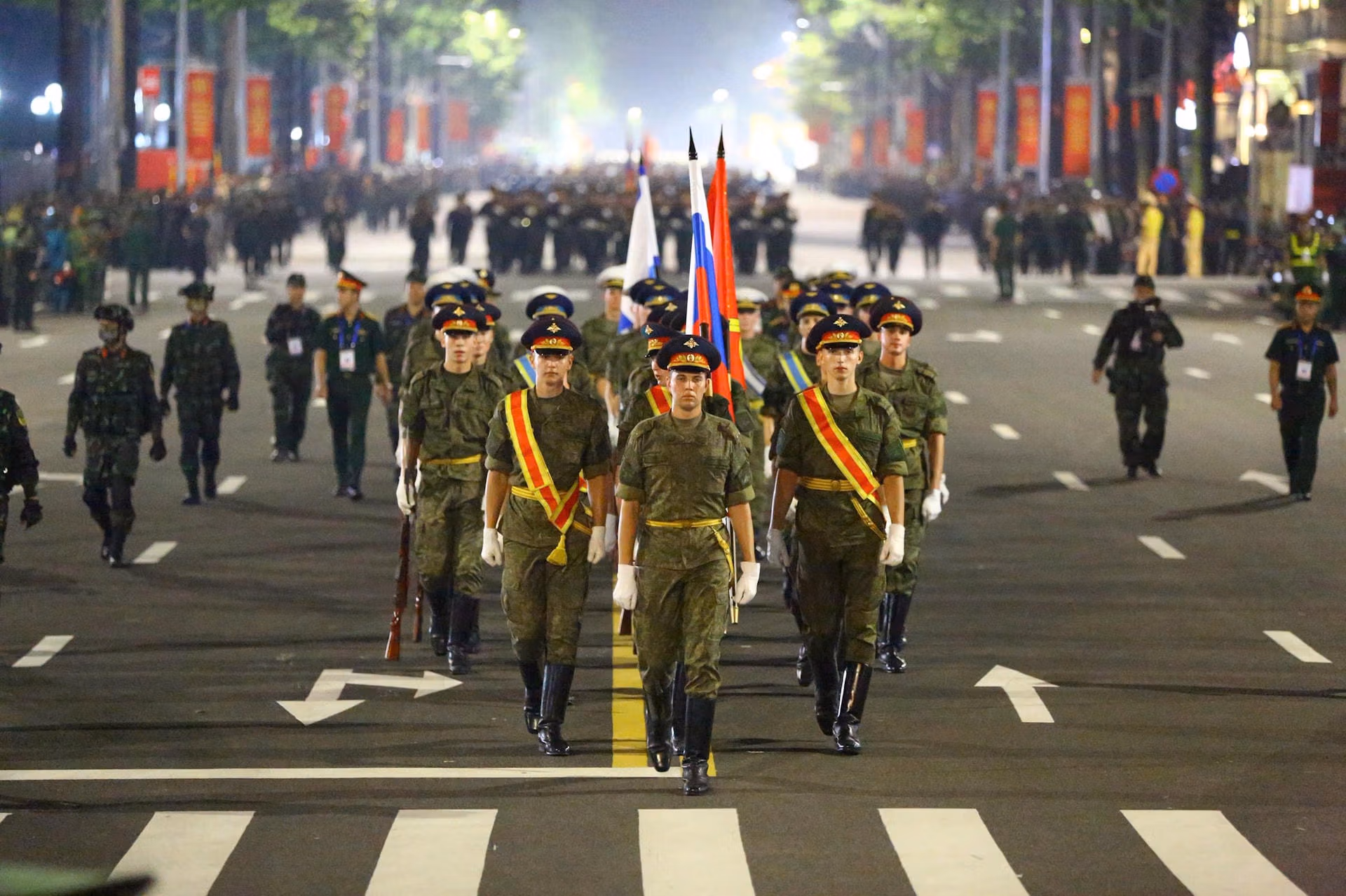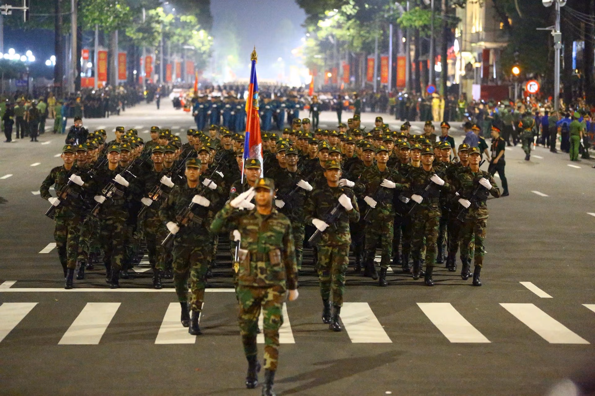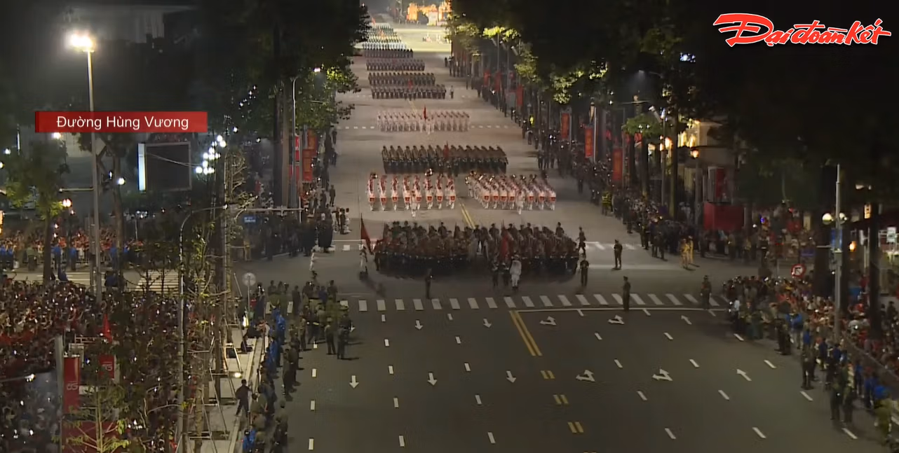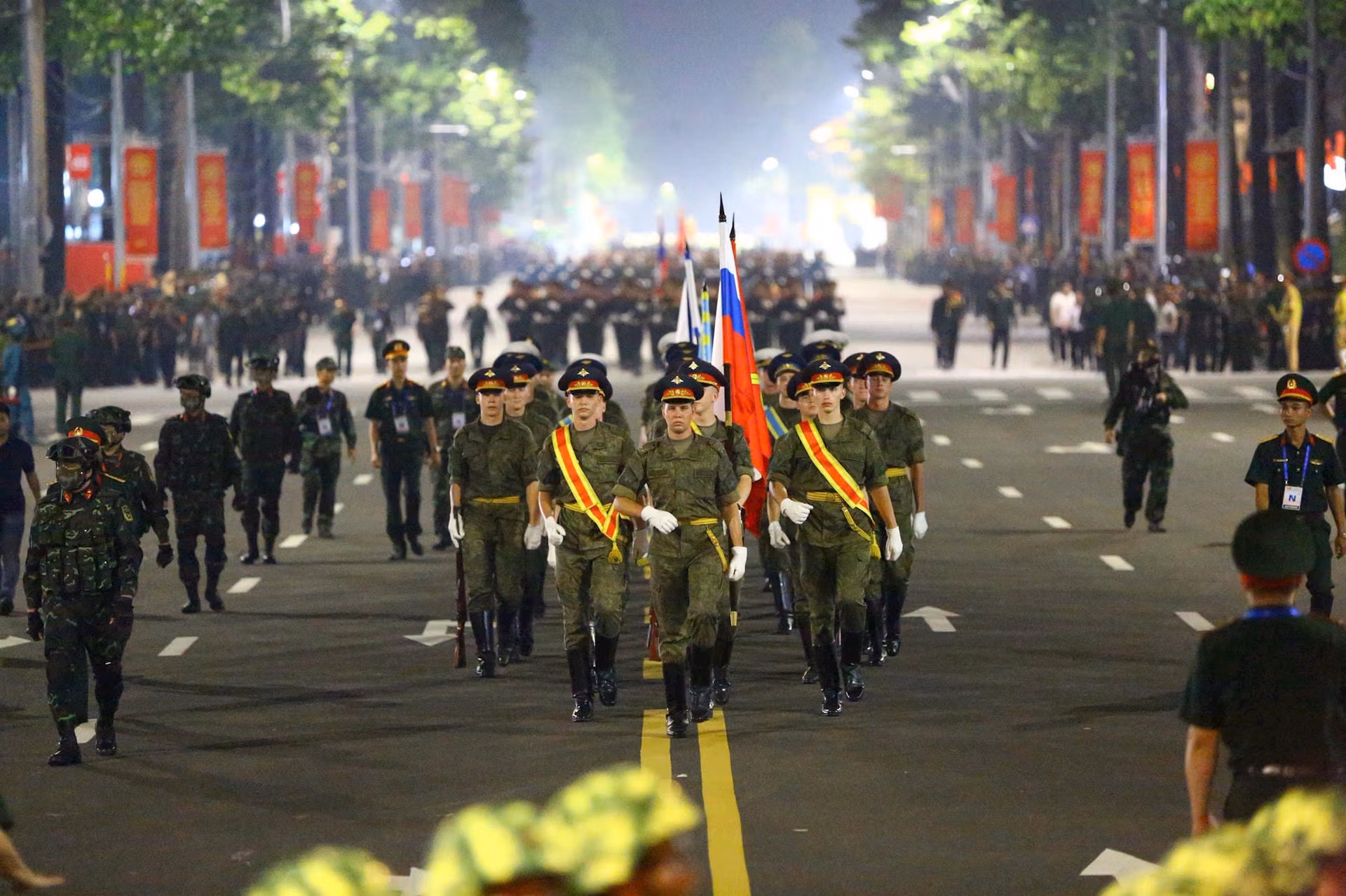 20h35: Khối Quân đội nước ngoài tiến vào lễ đài. Sự hiện diện của các Khối quân đội nước ngoài đến từ lực lượng vũ trang Liên bang Nga, Quân đội Nhân dân Lào và Quân đội Hoàng gia Campuchia tại buổi sơ duyệt diễu binh mang ý nghĩa sâu sắc, là biểu tượng sống động của tình hữu nghị và sự hợp tác quốc tế của Việt Nam. Tình đoàn kết này không chỉ thể hiện qua các sự kiện trang trọng mà còn được xây dựng từ những mối quan hệ bền chặt trong suốt chiều dài lịch sử.