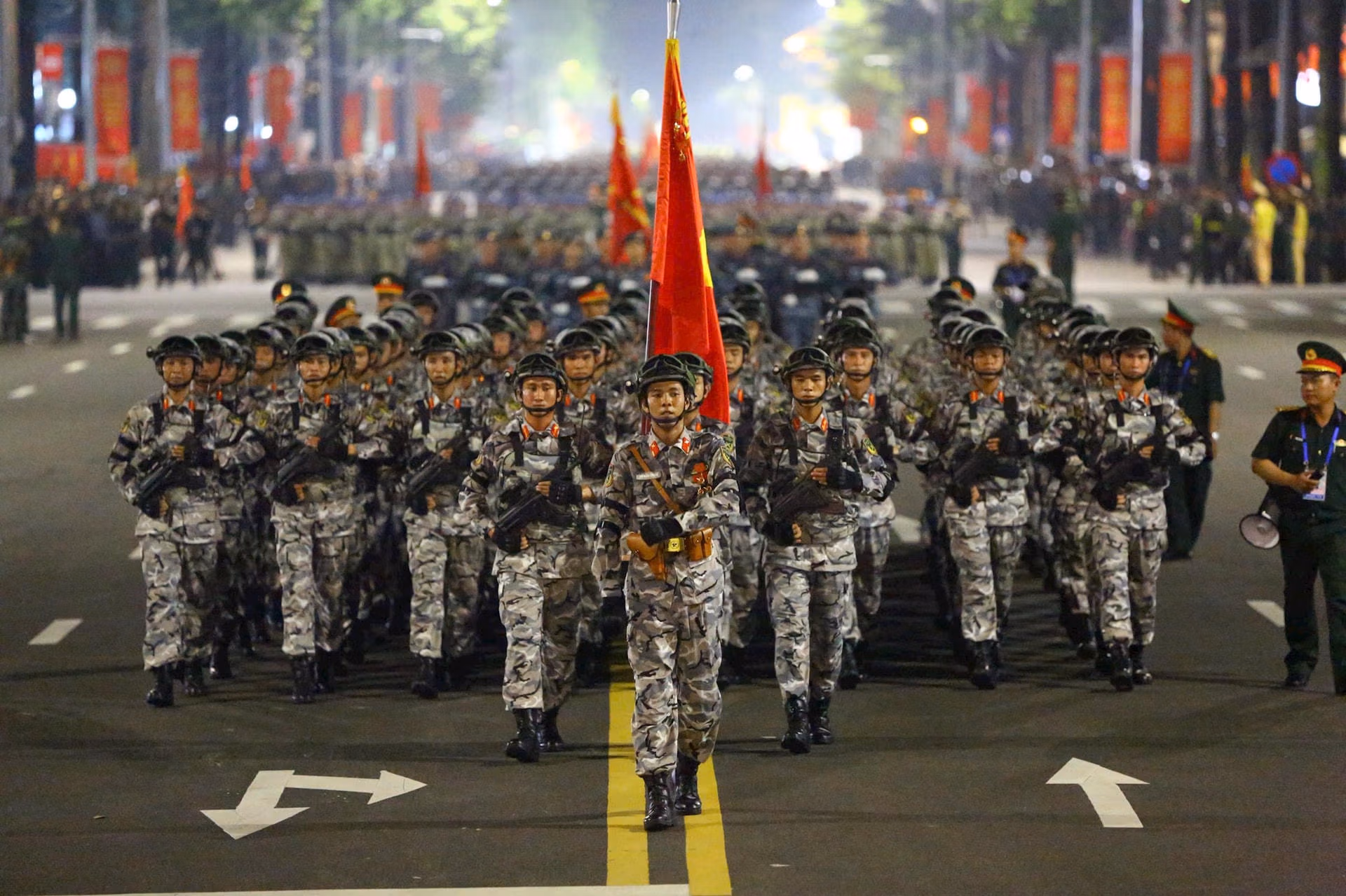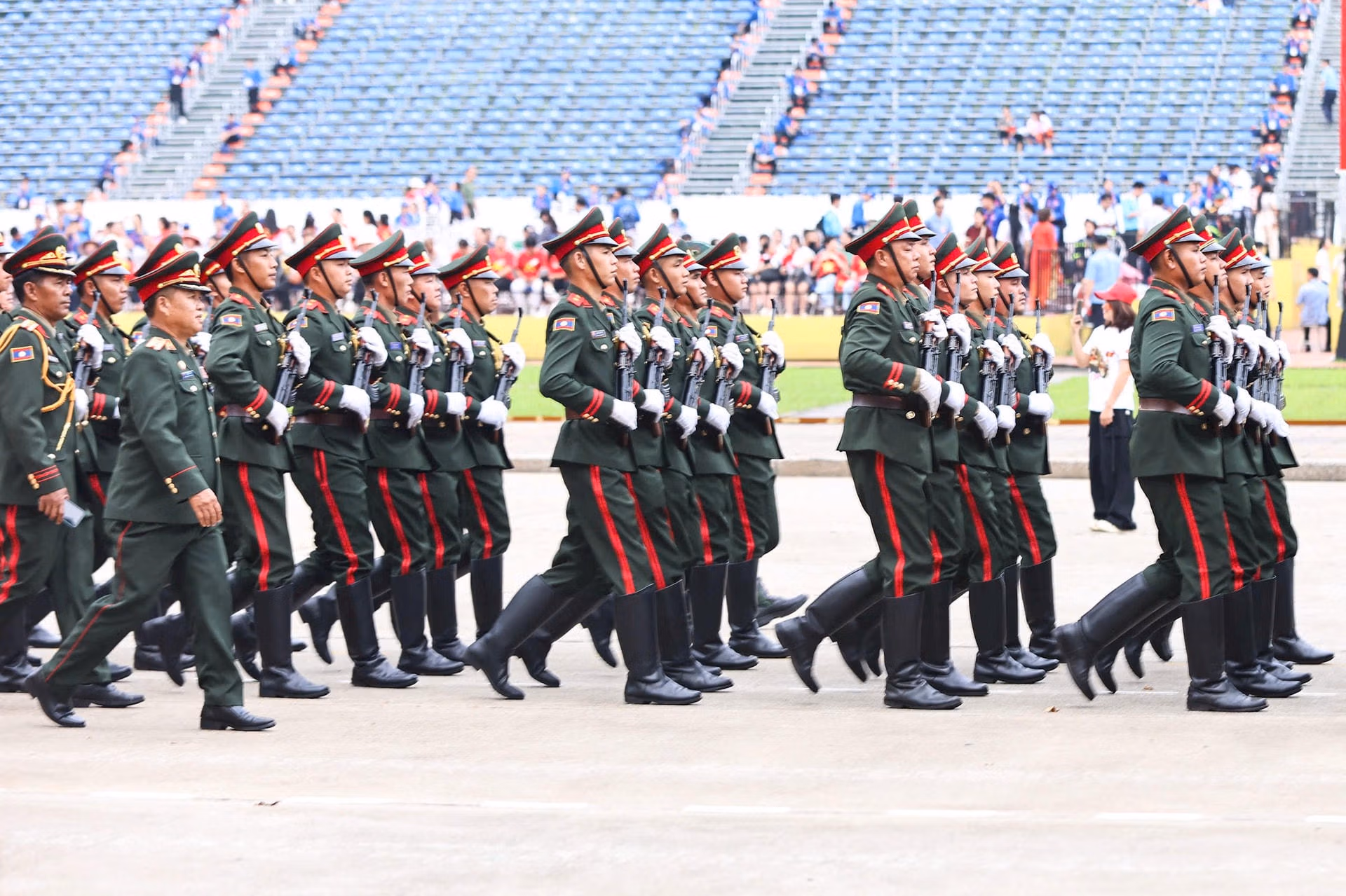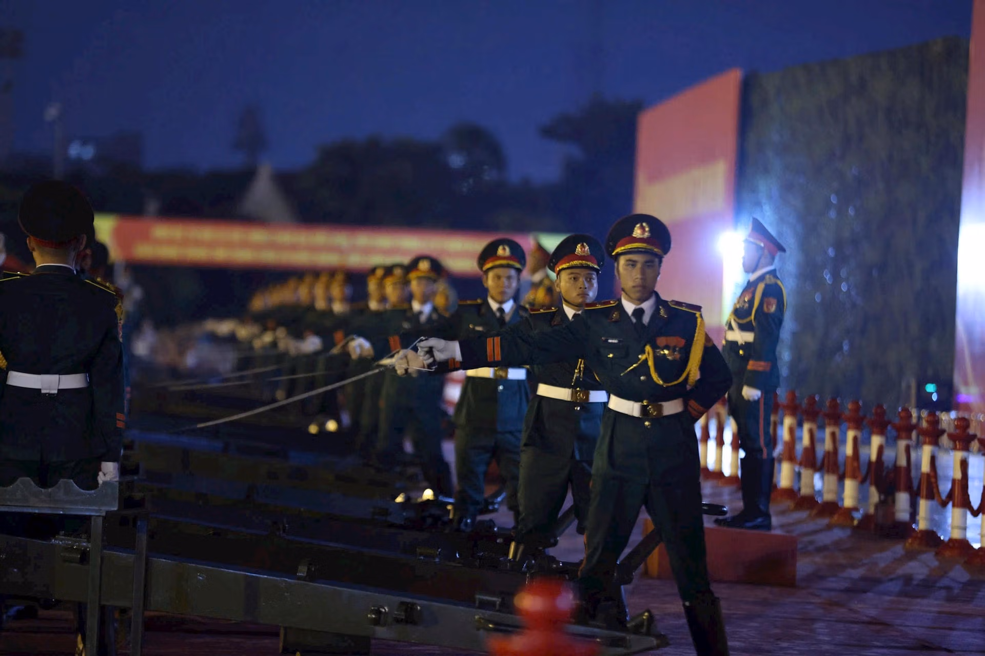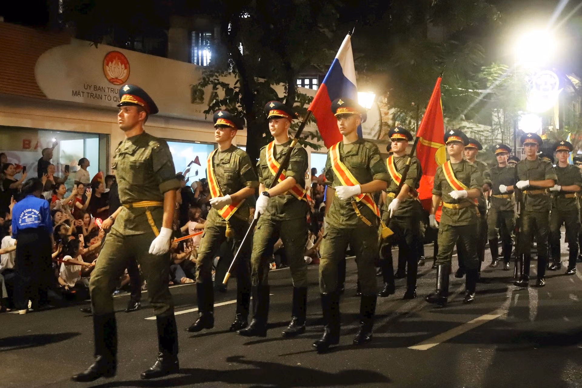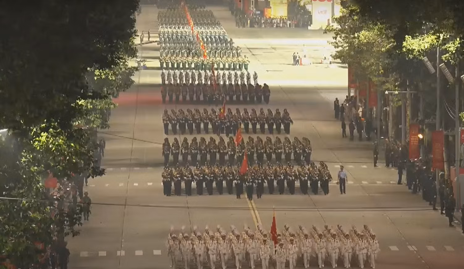 20h35: Khối Quân đội nước ngoài tiến vào lễ đài. Sự hiện diện của các Khối quân đội nước ngoài đến từ lực lượng vũ trang Liên bang Nga, Quân đội Nhân dân Lào và Quân đội Hoàng gia Campuchia tại buổi sơ duyệt diễu binh mang ý nghĩa sâu sắc, là biểu tượng sống động của tình hữu nghị và sự hợp tác quốc tế của Việt Nam. Tình đoàn kết này không chỉ thể hiện qua các sự kiện trang trọng mà còn được xây dựng từ những mối quan hệ bền chặt trong suốt chiều dài lịch sử.