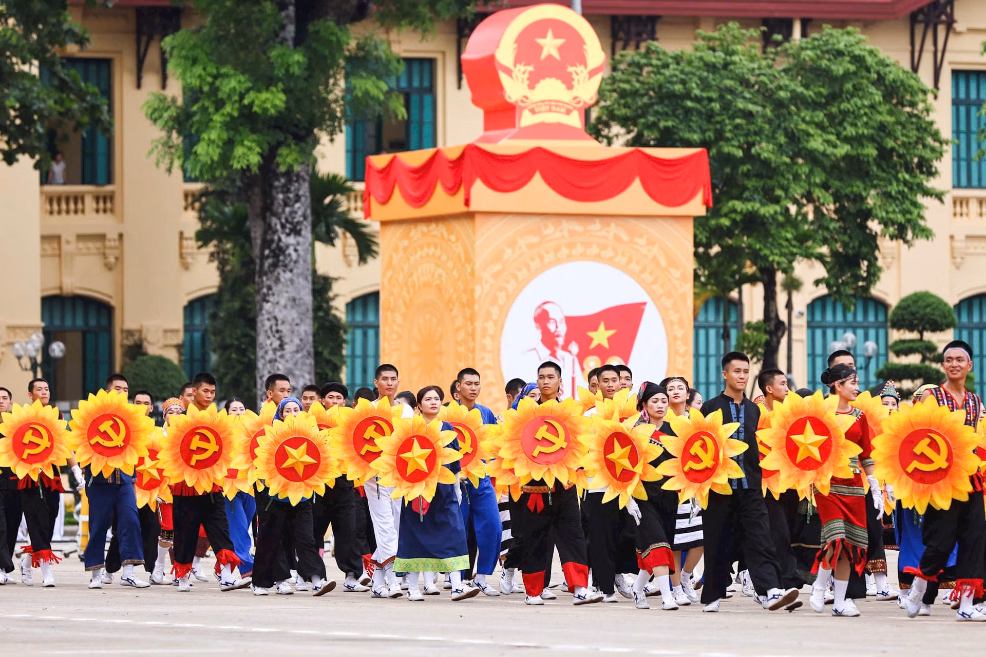 Lực lượng đứng làm nền gồm tiêu binh lễ đài và 29 khối đứng; 11 khối quần chúng.