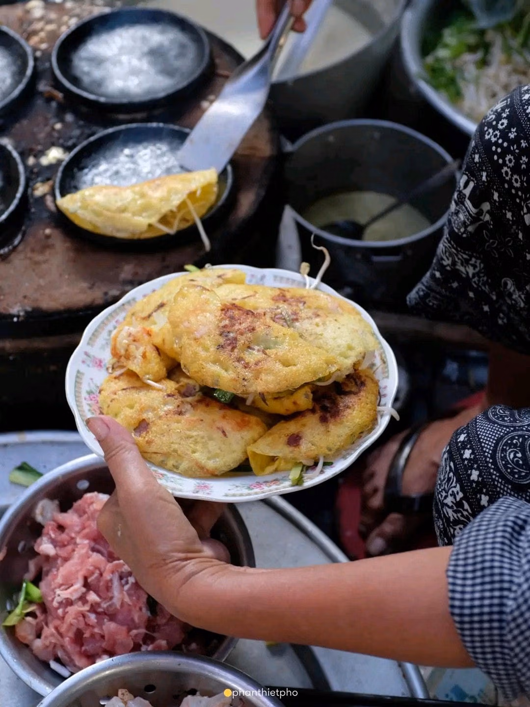 Người đàn bà ngồi đổ bánh xèo có đôi mắt sâu hóm, đượm buồn. Thân hình mảnh khảnh. Vết chân chim hằn sâu nơi khóe mắt. Có phải vì mưu sinh đã tạo nên dáng vẻ ấy chăng? Dẫu thực khách có giục giã yêu cầu mang bánh ra ăn cho đỡ đói nhưng bà vẫn chậm rãi, từ tốn làm từng khâu rất tròn vai. Bà nâng niu gấp miếng thịt ba rọi ngấn mỡ đến từng con tôm, miếng mực xào đều cho chín kĩ dưới bếp than hồng đang hừng hực cháy. Trước khi đổ bột vào từng khuôn bánh bà đảo đều xô bột bằng chiếc vá hình tròn, nhanh tay trán một lớp bột mỏng như giấy bóng, một tiếng xèo vang lên làm chiếc bụng đói của tôi kêu sùng sục, tiếp đến là cho giá, hành và sau cùng là đậy nắp khuôn. Để cho ra một chiếc bánh đòi hỏi phải trải qua nhiều công đoạn. Nhìn đôi bàn tay khéo léo, tỉ mĩ ấy chứng tỏ bà là người rành nghề và quán bánh xèo nơi đây đã tồn tại lâu năm nơi góc phố thân thương.
