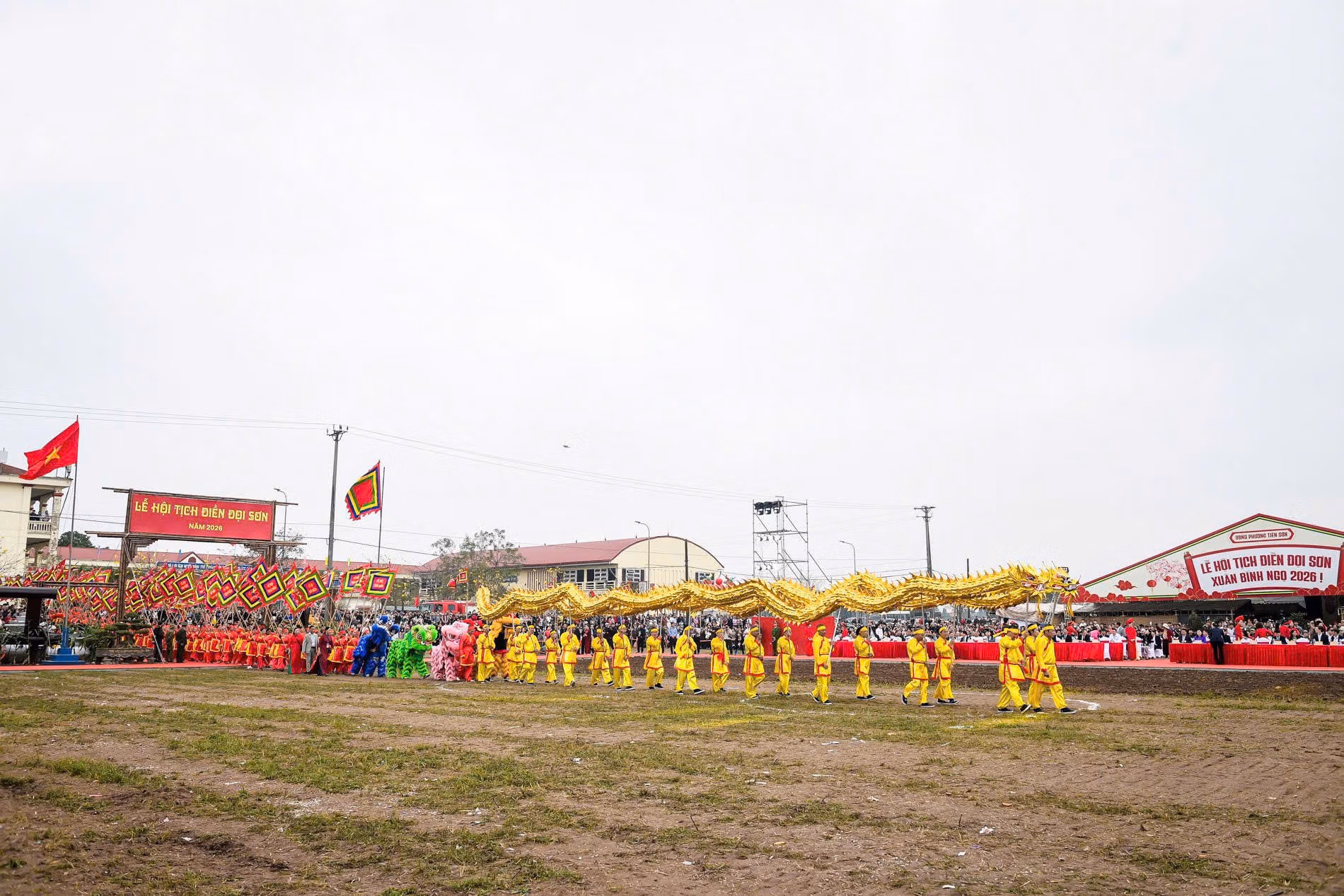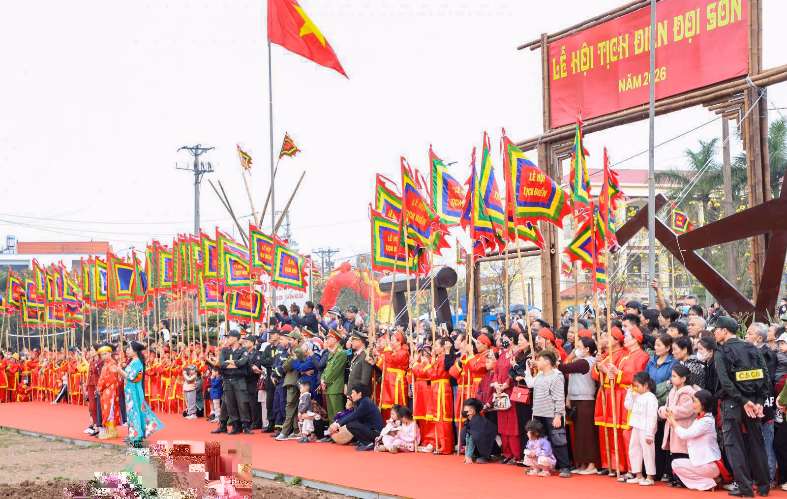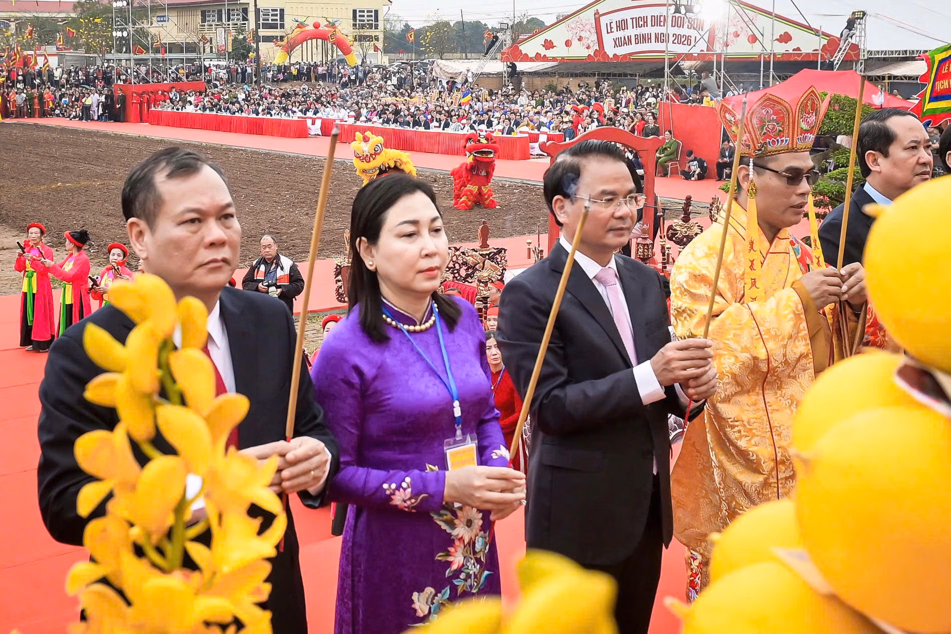 Ninh Bình: Tái hiện điển tích nghìn năm trong lễ hội tịch điền Đọi Sơn Thứ Hai 23/02/2026 21:31 (GMT+7) Giữa không gian linh thiêng của lễ tịch điền, nghi thức nhà vua cày ruộng đầu xuân được tái hiện, tôn vinh giá trị lao động và truyền thống văn minh lúa nước ngàn đời. Sáng 23/2 (tức mùng 7 tháng Giêng), tại chân núi Đọi, phường Tiên Sơn (Ninh Bình), lễ hội tịch điền Đọi Sơn được tổ chức trang trọng, tái hiện nghi thức vua xuống đồng cày ruộng, cầu cho một năm mưa thuận gió hòa, mùa màng bội thu. Ảnh: X.LNgay từ sáng sớm, hàng nghìn người dân và du khách đã đổ về dự lễ, tạo nên không khí rộn ràng, trang trọng trong những ngày đầu xuân. Ảnh: X.LTheo UBND phường Tiên Sơn, lễ hội tịch điền Đọi Sơn có nguồn gốc từ mùa xuân năm 987, khi vua Lê Đại Hành đích thân về cánh đồng dưới chân núi Đọi cày ruộng. Ảnh: X.LTừ sự kiện mang ý nghĩa chính trị - kinh tế và văn hóa sâu sắc ấy, nghi lễ 'vua xuống đồng” trở thành biểu tượng của tinh thần trọng nông, đề cao lao động sản xuất trong truyền thống dân tộc. Ảnh: Trung DũngTại lễ khai mạc sáng nay, phần nghi lễ được tổ chức trang nghiêm với các nghi thức dâng hương, tế thần Nông, cáo yết trời đất và tưởng nhớ công lao của vua Lê Đại Hành. Ảnh: Đình MinhSau phần tế lễ, nghi thức tái hiện cảnh nhà vua xuống đồng đi cày được thực hiện công phu. Người đóng vai vua trong trang phục hoàng bào, đầu đội mũ cửu long, thực hiện những đường cày đầu tiên trên thửa ruộng trong tiếng trống hội rộn ràng và sự chứng kiến của đông đảo nhân dân. Ảnh: X.LTiếp đó, các đại biểu Trung ương và địa phương cùng nông dân thực hiện nghi thức cày ruộng đầu năm. Ảnh: X.LCác hạt giống được gieo xuống, tượng trưng cho một mùa vụ mới tốt tươi. Ảnh: X.LBên cạnh phần nghi lễ chính, nhiều hoạt động văn hóa - thể thao dân gian cũng diễn ra sôi nổi như múa lân - rồng, trống hội Đọi Tam. Ảnh: X.LHội thi giã bánh dày tại lễ hội tịch điền. Ảnh: X.LTrong lễ hội còn có phần thi trang trí trâu, thi cày, biểu diễn nghệ thuật truyền thống… Ảnh: X.LLễ hội năm nay tiếp tục được tổ chức quy mô, bài bản, bảo đảm giữ gìn yếu tố truyền thống song song với yêu cầu an ninh, an toàn. Ảnh: Trung DũngLực lượng chức năng tăng cường công tác phân luồng giao thông, bảo đảm trật tự, phòng cháy chữa cháy và vệ sinh môi trường, tạo điều kiện thuận lợi để người dân và du khách tham dự lễ hội trong không khí an toàn, văn minh. Ảnh: Trung Dũng. Đình Minh