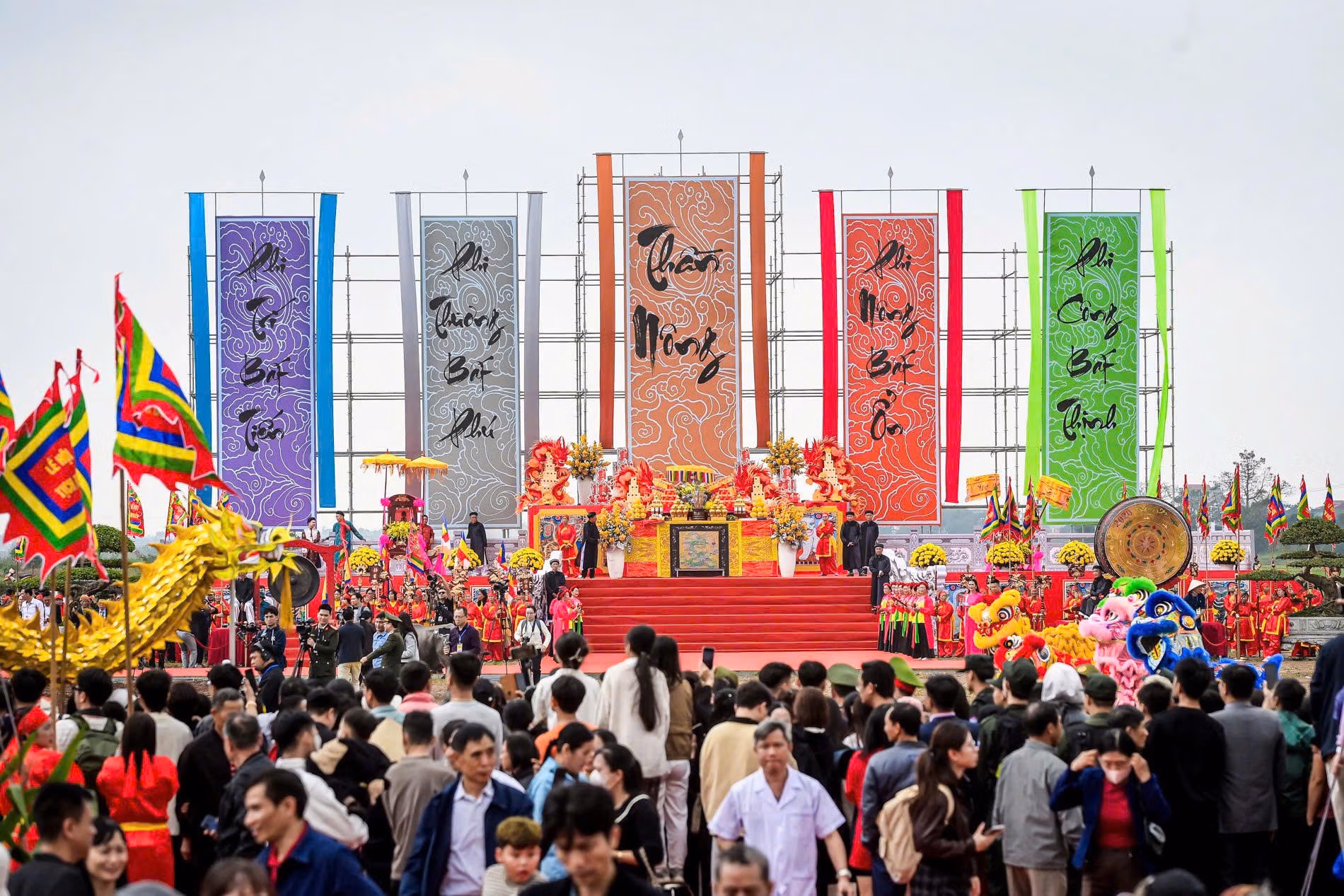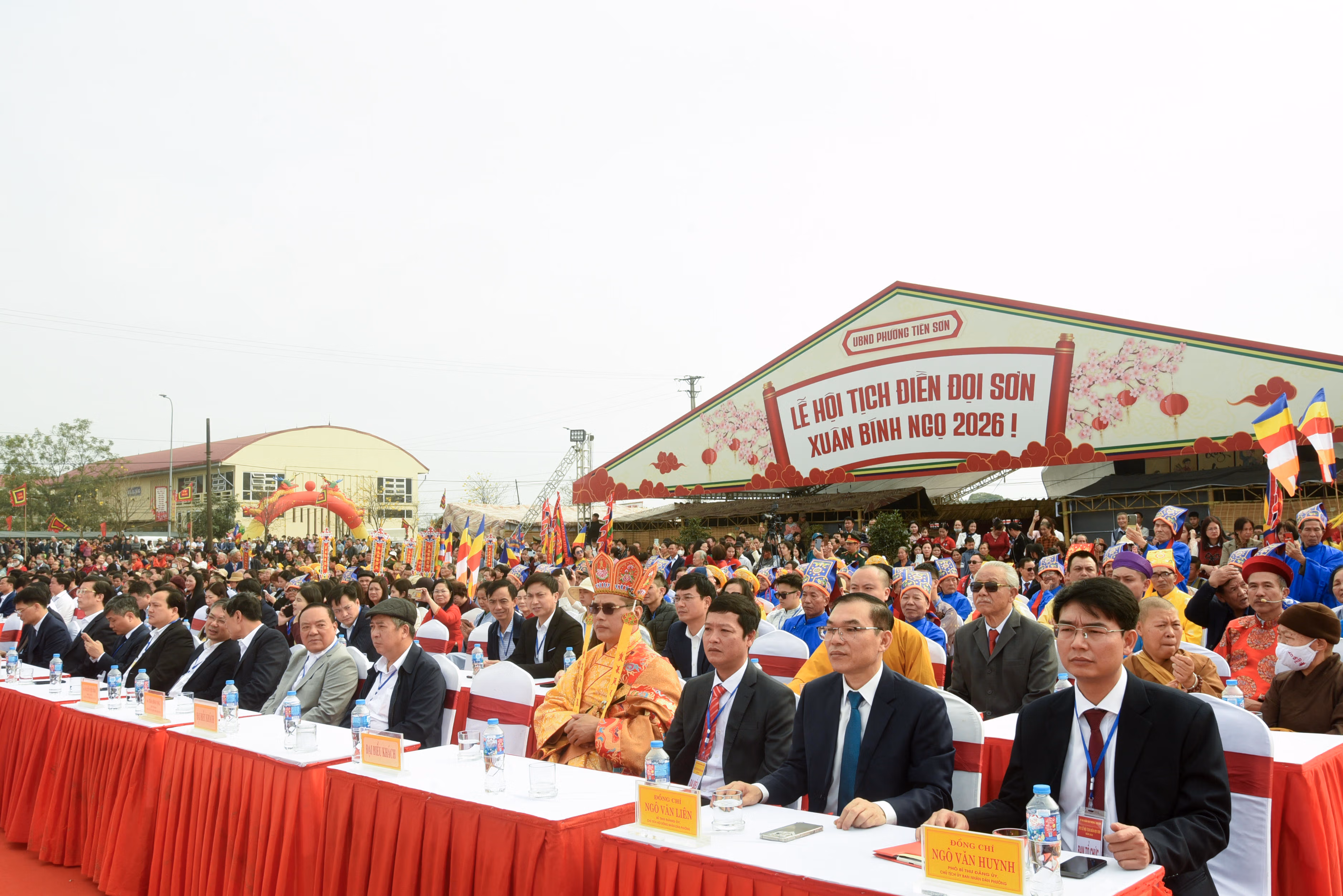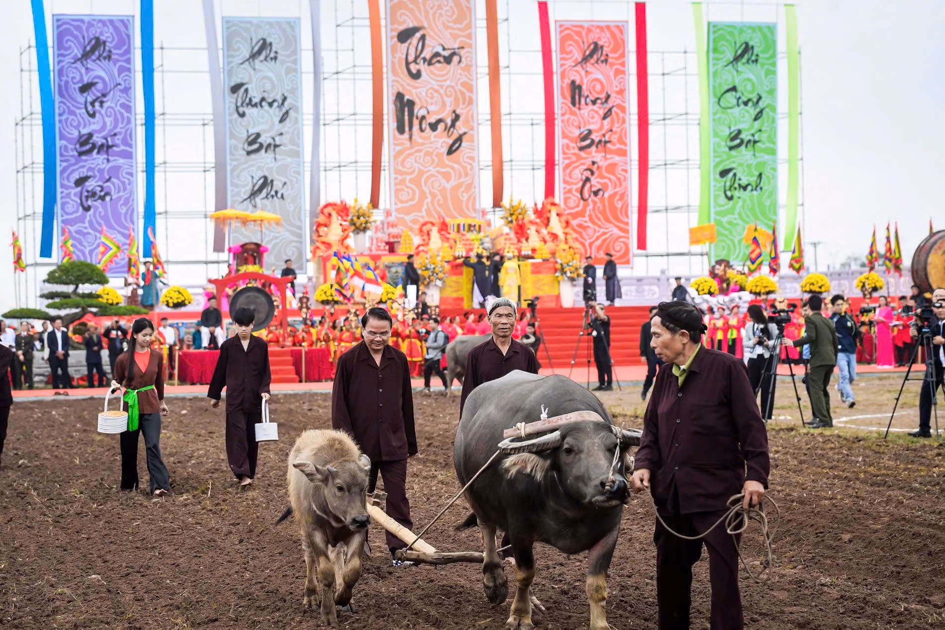 Ninh Bình: Tái hiện điển tích nghìn năm trong lễ hội tịch điền Đọi Sơn Thứ Hai 23/02/2026 21:31 (GMT+7) Giữa không gian linh thiêng của lễ tịch điền, nghi thức nhà vua cày ruộng đầu xuân được tái hiện, tôn vinh giá trị lao động và truyền thống văn minh lúa nước ngàn đời. Sáng 23/2 (tức mùng 7 tháng Giêng), tại chân núi Đọi, phường Tiên Sơn (Ninh Bình), lễ hội tịch điền Đọi Sơn được tổ chức trang trọng, tái hiện nghi thức vua xuống đồng cày ruộng, cầu cho một năm mưa thuận gió hòa, mùa màng bội thu. Ảnh: X.LNgay từ sáng sớm, hàng nghìn người dân và du khách đã đổ về dự lễ, tạo nên không khí rộn ràng, trang trọng trong những ngày đầu xuân. Ảnh: X.LTheo UBND phường Tiên Sơn, lễ hội tịch điền Đọi Sơn có nguồn gốc từ mùa xuân năm 987, khi vua Lê Đại Hành đích thân về cánh đồng dưới chân núi Đọi cày ruộng. Ảnh: X.LTừ sự kiện mang ý nghĩa chính trị - kinh tế và văn hóa sâu sắc ấy, nghi lễ 'vua xuống đồng” trở thành biểu tượng của tinh thần trọng nông, đề cao lao động sản xuất trong truyền thống dân tộc. Ảnh: Trung DũngTại lễ khai mạc sáng nay, phần nghi lễ được tổ chức trang nghiêm với các nghi thức dâng hương, tế thần Nông, cáo yết trời đất và tưởng nhớ công lao của vua Lê Đại Hành. Ảnh: Đình MinhSau phần tế lễ, nghi thức tái hiện cảnh nhà vua xuống đồng đi cày được thực hiện công phu. Người đóng vai vua trong trang phục hoàng bào, đầu đội mũ cửu long, thực hiện những đường cày đầu tiên trên thửa ruộng trong tiếng trống hội rộn ràng và sự chứng kiến của đông đảo nhân dân. Ảnh: X.LTiếp đó, các đại biểu Trung ương và địa phương cùng nông dân thực hiện nghi thức cày ruộng đầu năm. Ảnh: X.LCác hạt giống được gieo xuống, tượng trưng cho một mùa vụ mới tốt tươi. Ảnh: X.LBên cạnh phần nghi lễ chính, nhiều hoạt động văn hóa - thể thao dân gian cũng diễn ra sôi nổi như múa lân - rồng, trống hội Đọi Tam. Ảnh: X.LHội thi giã bánh dày tại lễ hội tịch điền. Ảnh: X.LTrong lễ hội còn có phần thi trang trí trâu, thi cày, biểu diễn nghệ thuật truyền thống… Ảnh: X.LLễ hội năm nay tiếp tục được tổ chức quy mô, bài bản, bảo đảm giữ gìn yếu tố truyền thống song song với yêu cầu an ninh, an toàn. Ảnh: Trung DũngLực lượng chức năng tăng cường công tác phân luồng giao thông, bảo đảm trật tự, phòng cháy chữa cháy và vệ sinh môi trường, tạo điều kiện thuận lợi để người dân và du khách tham dự lễ hội trong không khí an toàn, văn minh. Ảnh: Trung Dũng. Đình Minh