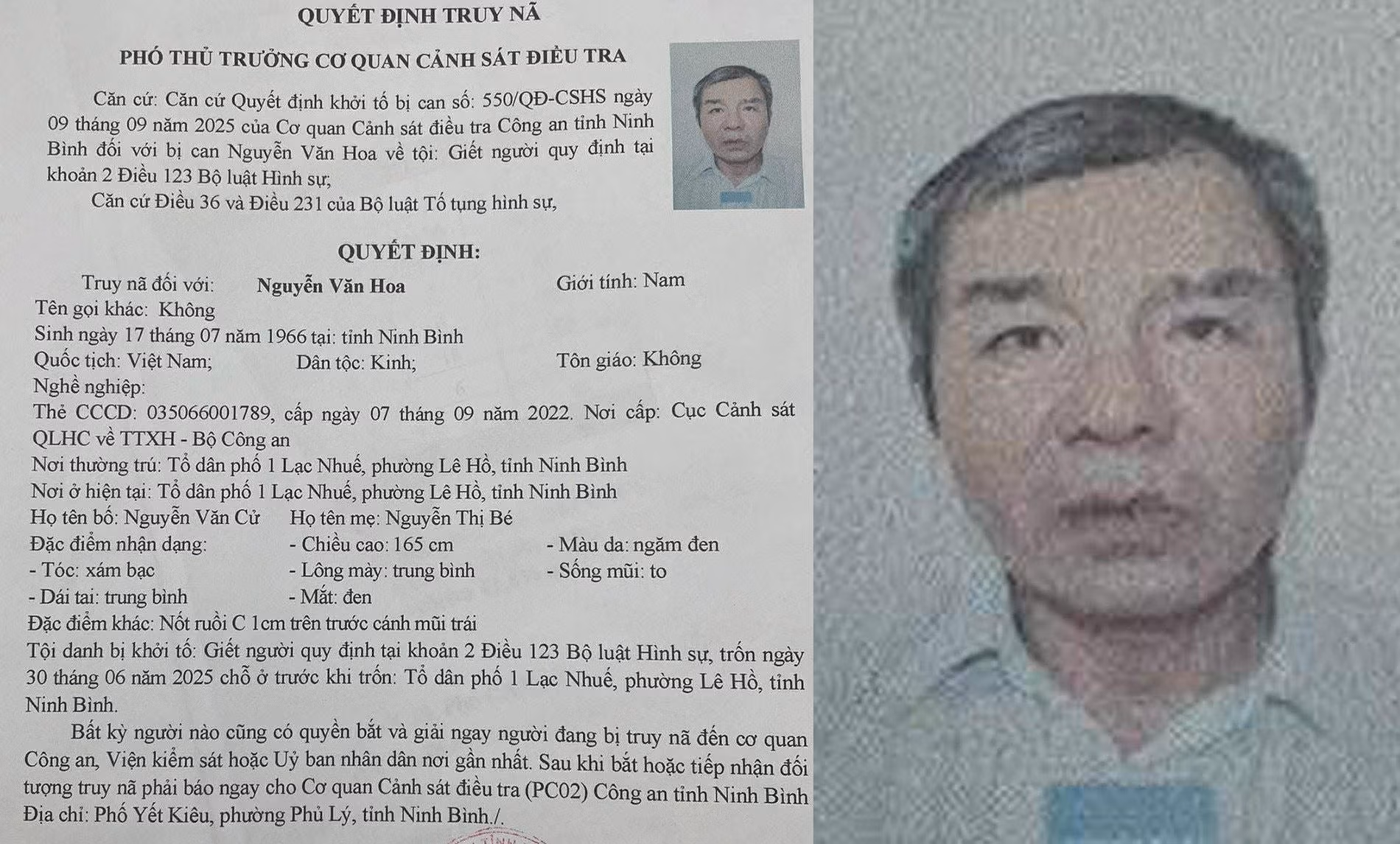 Cơ quan CSĐT, Công an tỉnh Ninh Bình vừa ra quyết định truy nã đối với Nguyễn Văn Hoa (SN 1966, trú tại Tổ dân phố 1 Lạc Nhuế, phường Lê Hồ, tỉnh Ninh Bình) về tội “Giết người”.