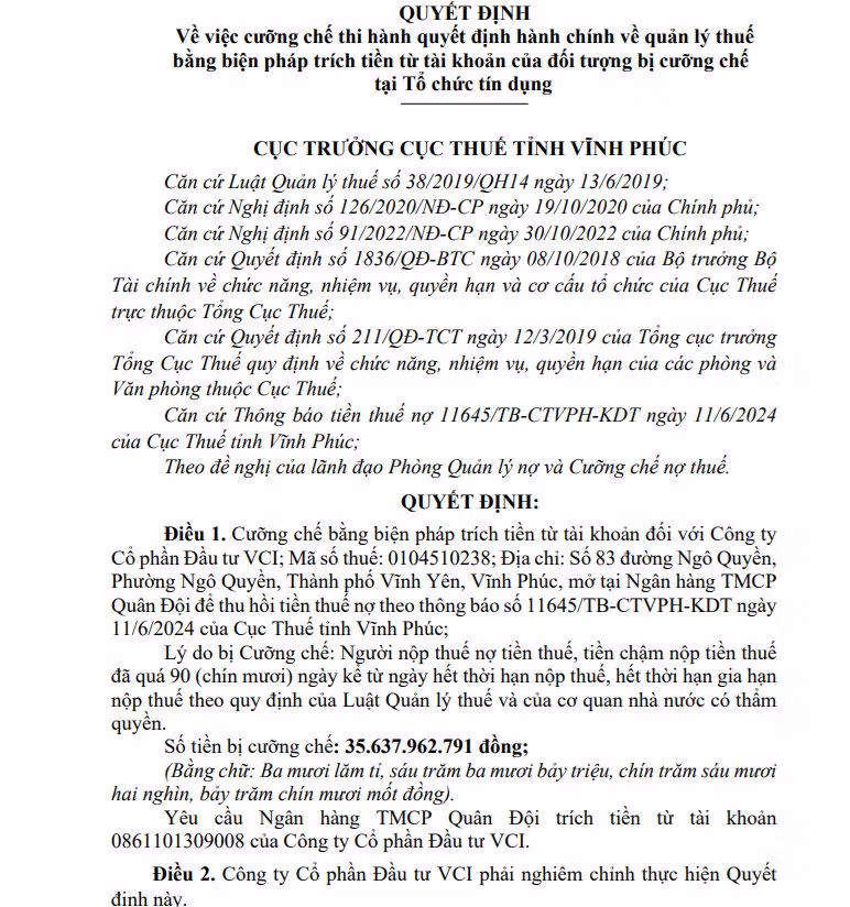 Theo đó, số tiền Công ty Cổ phần Đầu tư VCI bị cưỡng chế là 35 tỷ 637 triệu đồng. Ngân hàng TMCP Quân Đội có trách nhiệm trích tiền từ tài khoản đối với số tiền 35 tỷ 637 triệu đồng để nộp vào tài khoản mở tại Văn phòng Kho bạc nhà nước Vĩnh Phúc.