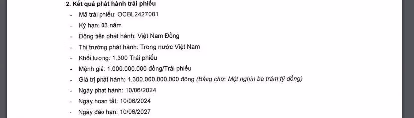 Theo đó, ngày 10/6/2024, OCB đã phát hành 1.300 trái phiếu mã OCBL2427001 với mệnh giá 1 tỷ đồng/trái phiếu. Giá trị phát hành là 1.300 tỷ đồng, kỳ hạn 3 năm. Lãi suất phát hành 5,4%/năm. Ngày đáo hạn là 10/6/2027.