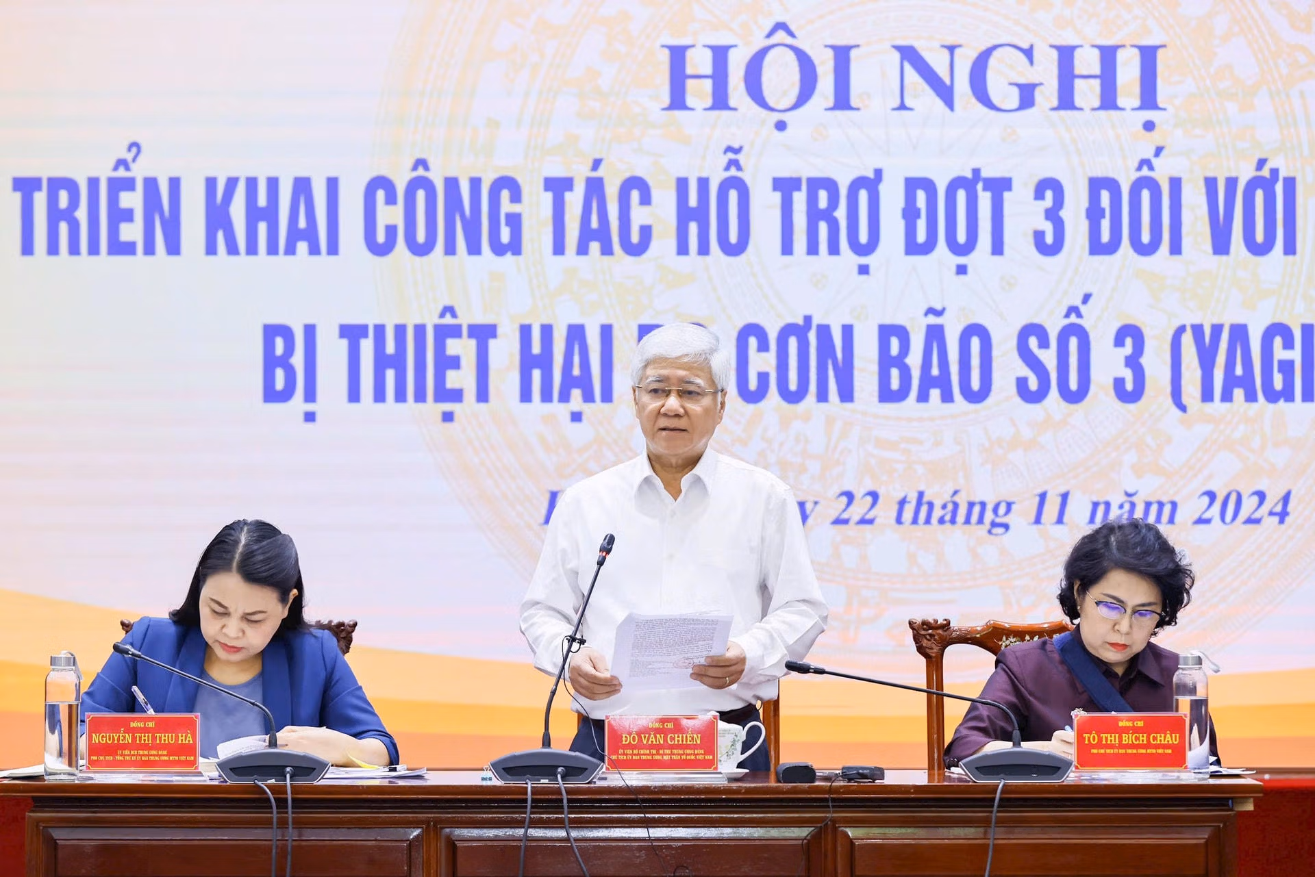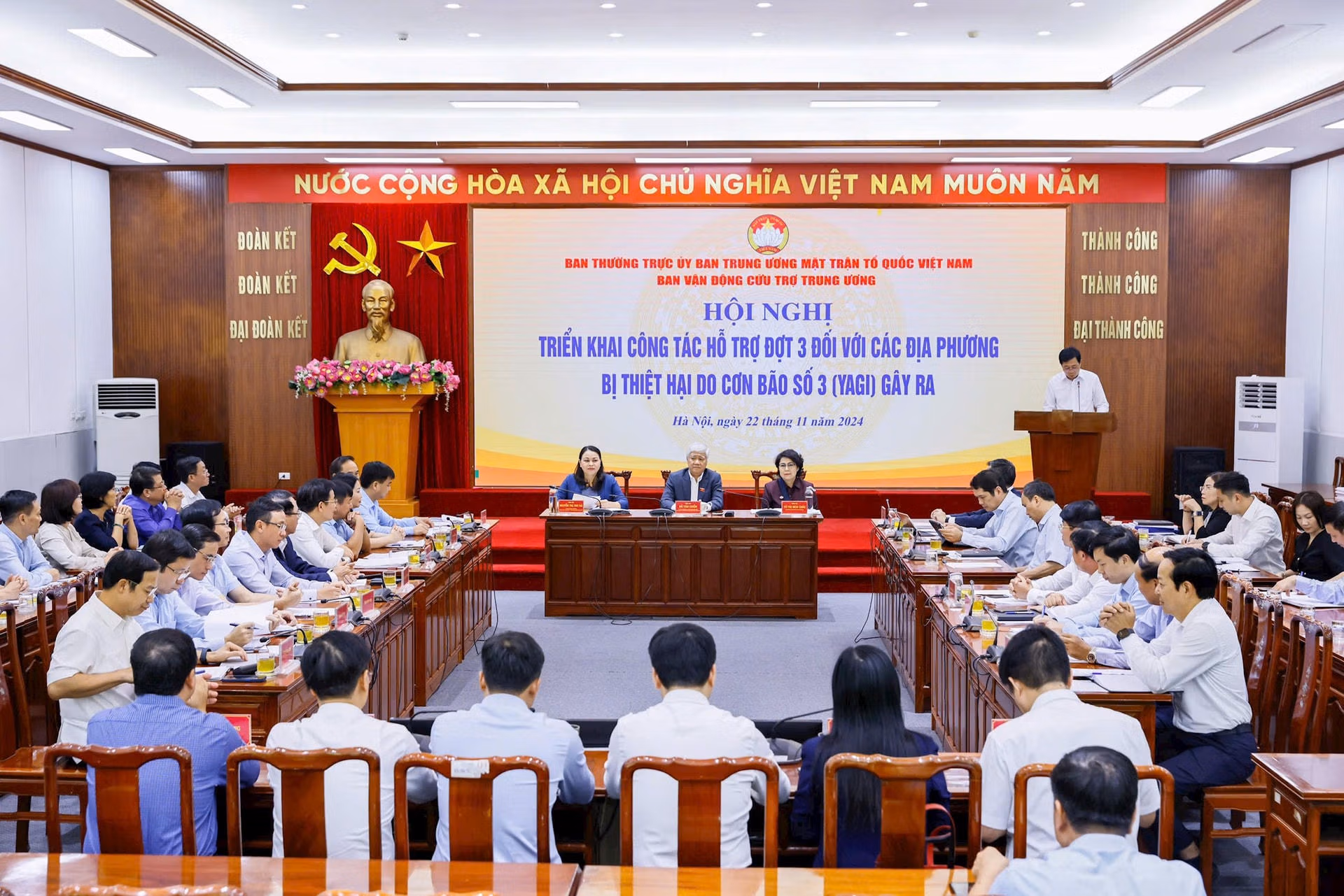 Chiều 22/11, tại Hà Nội, Ban Thường trực UBTƯ MTTQ Việt Nam - Ban Vận động Cứu trợ Trung ương tổ chức Hội nghị triển khai công tác hỗ trợ đợt 3 đối với các địa phương bị thiệt hại do cơn bão số 3 (Yagi) gây ra. Ông Đỗ Văn Chiến, Ủy viên Bộ Chính trị, Bí thư Trung ương Đảng, Bí thư Đảng đoàn, Chủ tịch UBTƯ MTTQ Việt Nam; bà Nguyễn Thị Thu Hà, Ủy viên Trung ương Đảng, Phó Chủ tịch - Tổng Thư ký UBTƯ MTTQ Việt Nam; bà Tô Thị Bích Châu, Phó Chủ tịch UBTƯ MTTQ Việt Nam chủ trì Hội nghị.