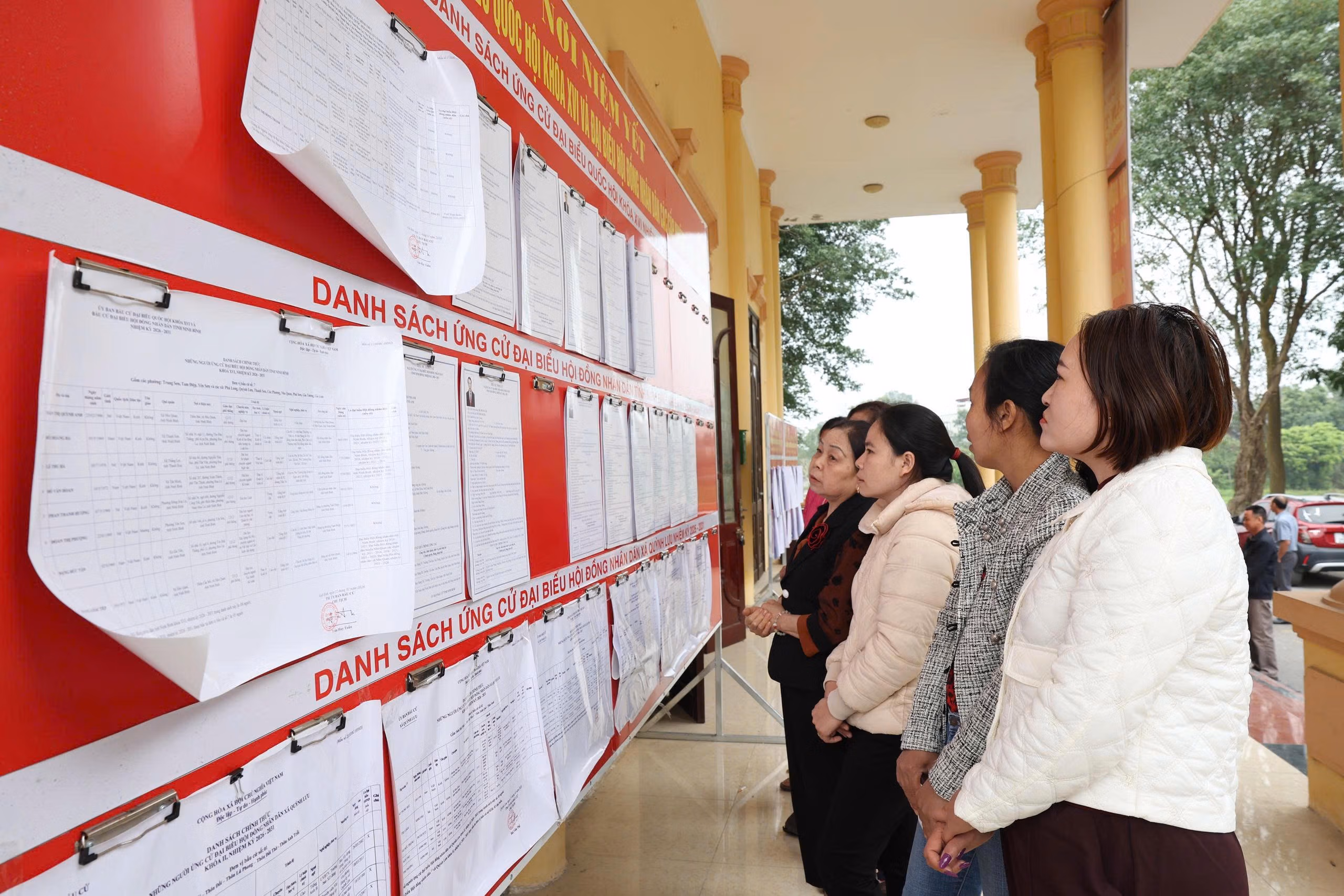 Cử tri xã Quỳnh Lưu xem hồ sơ ứng cử ĐBQH của ông Bùi Văn Mạnh và các ứng cử viên. Ảnh: Minh Quang