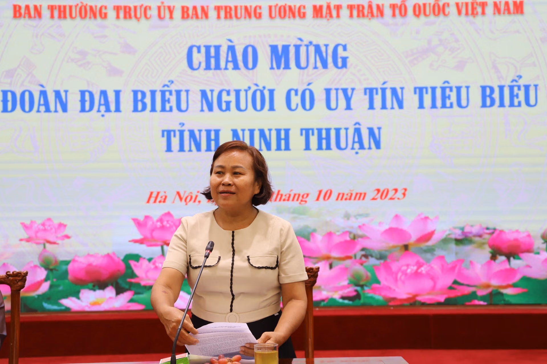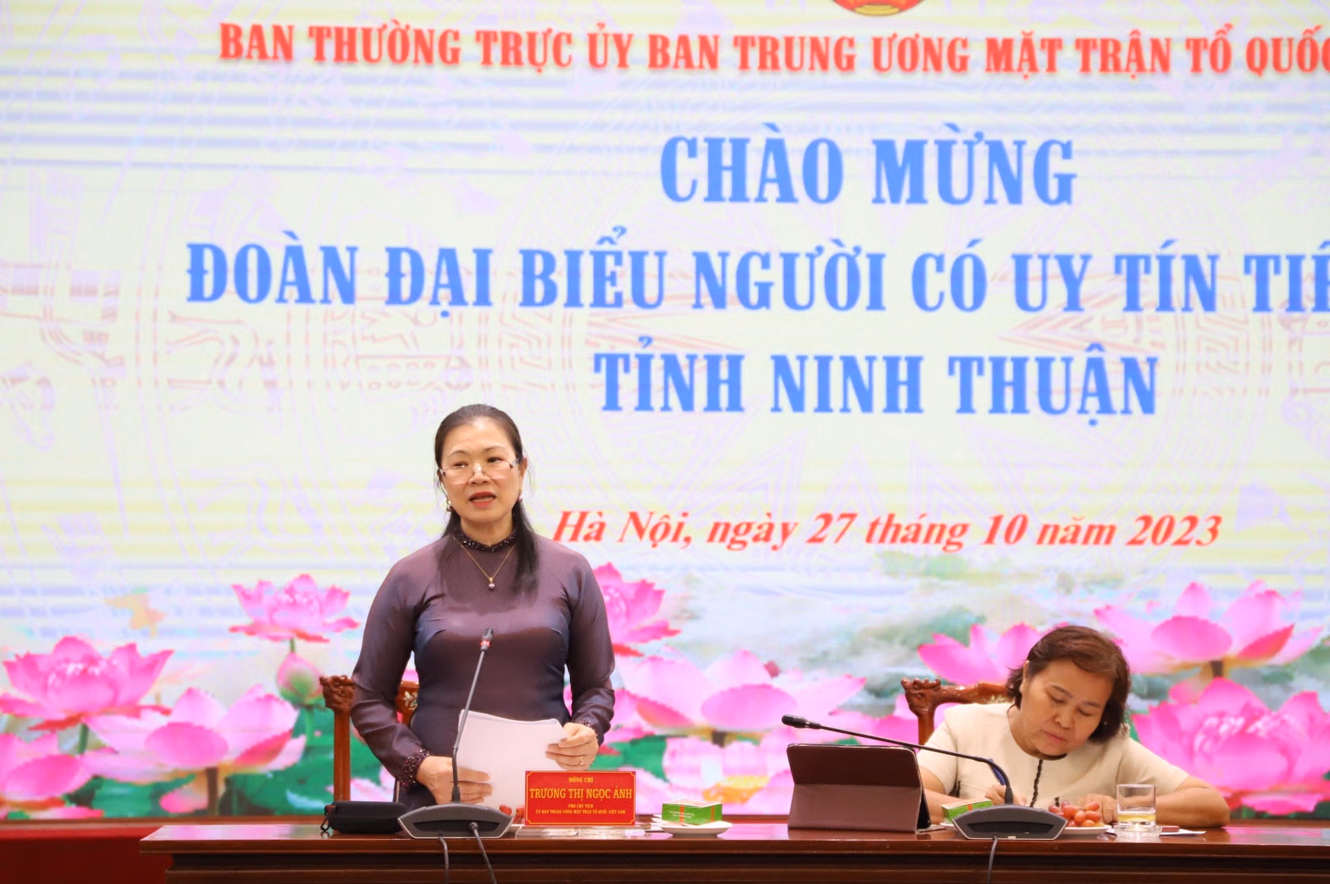 Phát biểu tại buổi gặp mặt, thay mặt Ban Thường trực UBTƯ MTTQ Việt Nam, Phó Chủ tịch Trương Thị Ngọc Ánh ghi nhận đánh giá cao nỗ lực cống hiến của đội ngũ người có uy tín tiêu biểu trong sự phát triển của tỉnh Ninh Thuận nói riêng cũng như đóng góp tích cực vào củng cố vững chắc khối đại đoàn kết toàn dân tộc.