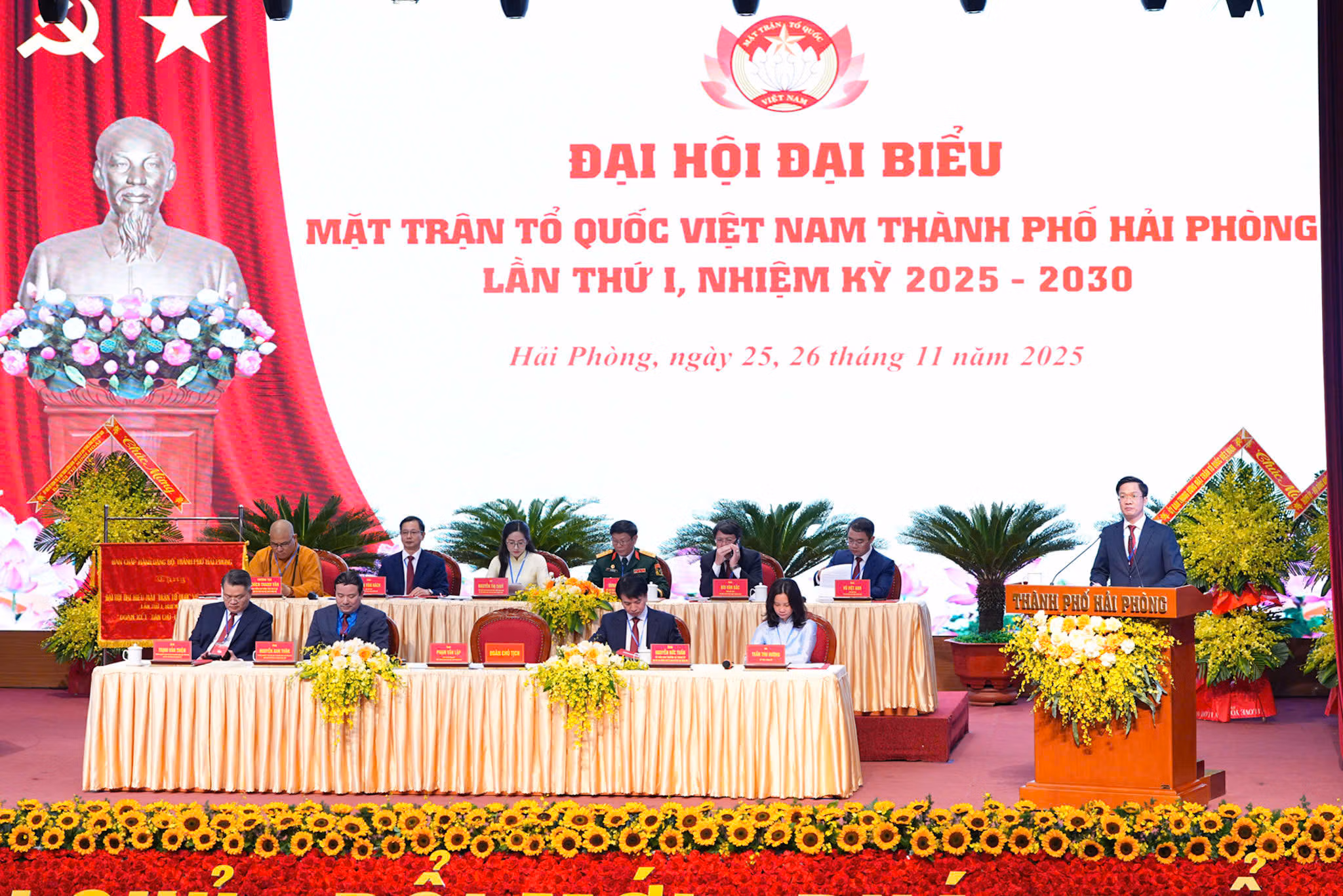Phiên làm việc thứ nhất Đại hội Đại biểu MTTQ Việt Nam TP Hải Phòng nhiệm kỳ mới Thứ Ba 25/11/2025 23:17 (GMT+7) Ngày 25/11, tại Cung Văn hóa lao động Hữu Nghị Việt - Tiệp, Đại hội Đại biểu MTTQ Việt Nam TP Hải Phòng lần thứ I, nhiệm kỳ 2025-2030 diễn ra phiên làm việc thứ nhất. Quang cảnh Đại hội Đại biểu MTTQ Việt Nam TP Hải Phòng lần thứ I, nhiệm kỳ 2025-2030. Ảnh: ĐT. Các đại biểu thực hiện nghi thức chào cờ. Ảnh: ĐT. Đoàn Chủ tịch điều hành Đại hội. Ảnh: ĐT.Ông Nguyễn Đức Tuấn, Phó Chủ tịch Thường trực Uỷ ban MTTQ Việt Nam TP Hải Phòng điều hành hiệp thương cử Uỷ ban MTTQ VN thành phố Hải Phòng khoá I, nhiệm kỳ 2025-2030. Ông Phạm Văn Lập, Phó Bí thư Thành uỷ, Chủ tịch Uỷ ban MTTQ Việt Nam thành phố thông qua nội dung hiệp thương cử Uỷ ban MTTQ VN thành phố Hải Phòng khoá I, nhiệm kỳ 2025-2030. . Ảnh: ĐT.Bà Trần Thị Lan, Chủ tịch Uỷ ban MTTQ Việt Nam phường Hồng Bàng phát biểu tham luận. Ảnh: ĐT. Trước đó, sáng 25/11, trước thềm Đại hội, Ban Thường trực Uỷ ban MTTQ Việt Nam thành phố dâng hoa, dâng hương viếng các Anh hùng Liệt sĩ tại Đài tưởng niệm thành phố; Tượng đài đồng chí Nguyễn Đức Cảnh. Ảnh: NH. Phương Thanh