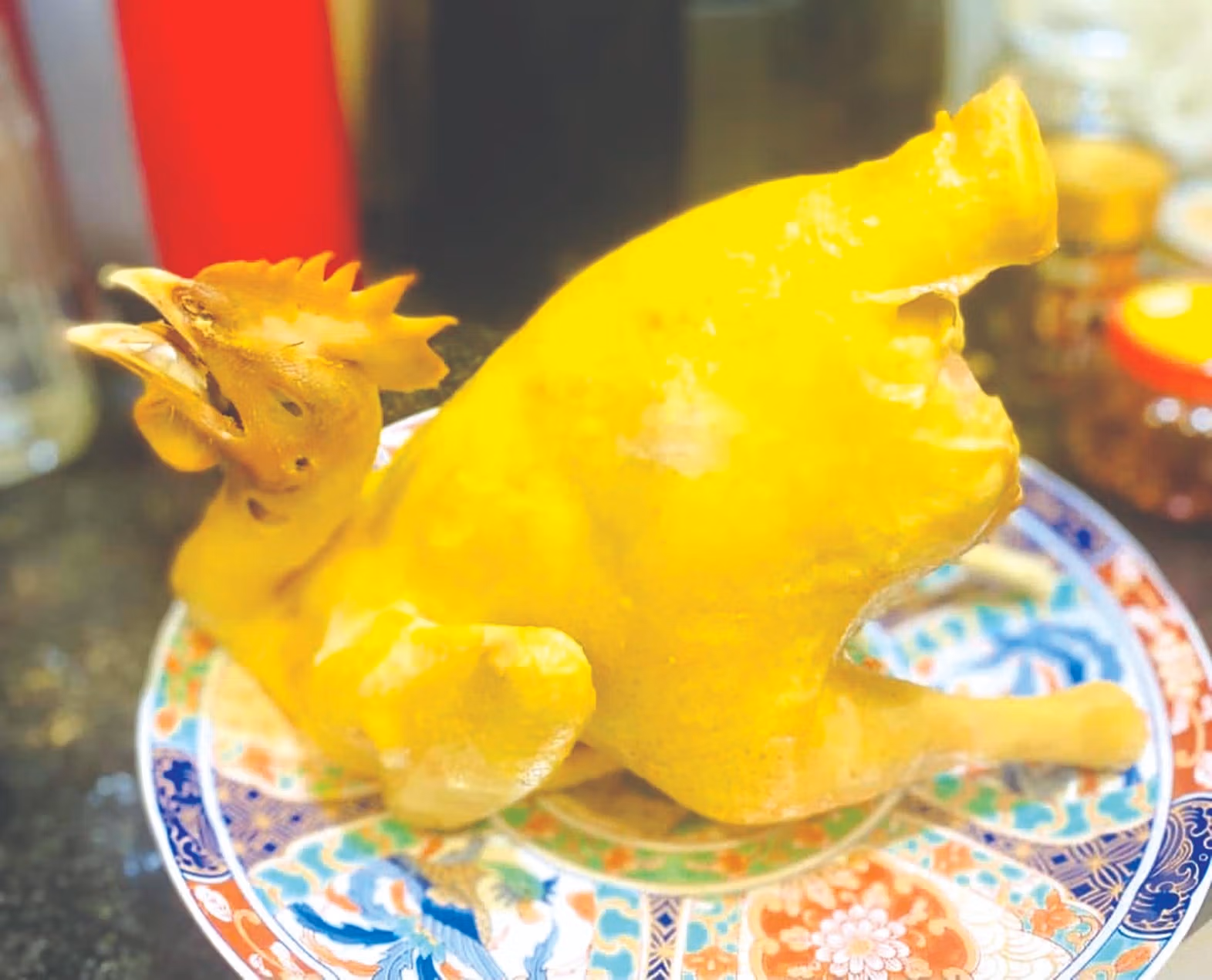 Nấu nước dùng: Sá sùng cắt đôi rửa sạch, phòng trường hợp có cát bên trong. Rửa sạch để ráo rồi rang vàng. Gừng, hành tây cho vào nồi chiên không dầu nướng thơm. Rễ hành củ, rễ mùi già rửa sạch cho vào cái giỏ hầm. Xương gà, chân gà rửa sạch trần nước sôi rồi cho ngập nước để ninh nước dùng cùng với bộ xương gà vừa lọc. Cho sá sùng rang vàng, gừng nướng, rễ hành, vỏ hành, rễ mùi vào nồi. Khi nồi sôi bùng, vớt bọt rồi hạ nhỏ lửa. Cho vào nồi một thìa muối hạt và luôn mở nắp cho nước trong. Hầm chừng nửa tiếng cho hành tây vào hầm thêm 30 phút nữa thì tắt bếp cho nguội bớt. Vớt xương ra bỏ đi, chân gà xếp ra đĩa để uống bia. Lọc lại nồi nước dùng lấy nước trong. Trộn nồi nước dùng với nồi nước luộc gà, đun nhỏ lửa, nêm hai thìa con nước mắm ngon và mấy viên đường phèn. Nhớ là đường phèn chứ không phải đường kính nhé. Đường phèn khiến nước dùng trong, cân bằng vị và không ngọt lợ như đường kính hoặc mì chính.