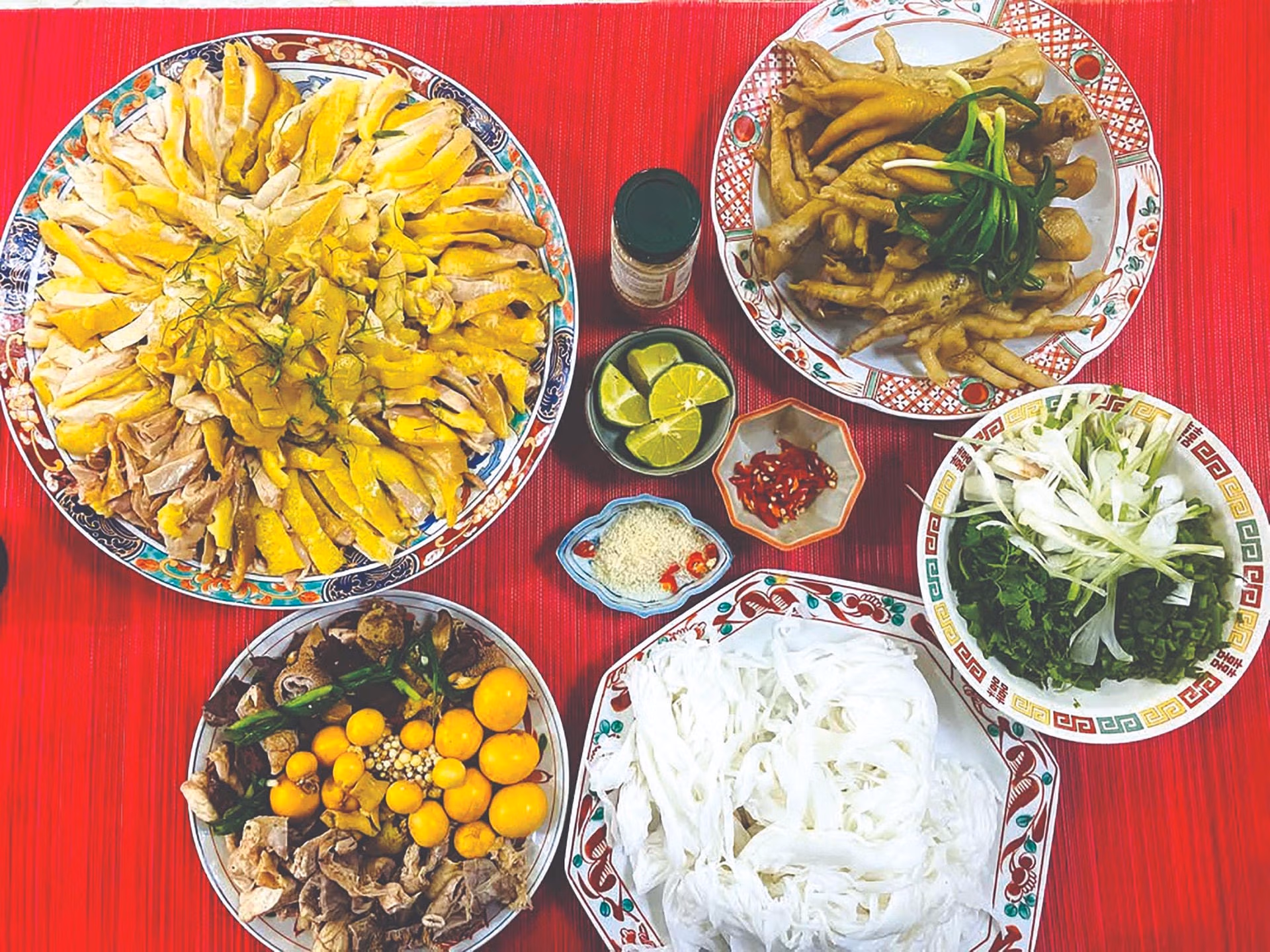 Sơ chế các nguyên liệu khác: Trong lúc nước dùng đang ninh thì rửa sạch hành củ, hành hoa, mùi Láng. Hành hoa lấy mấy củ chần qua nước sôi. Lòng, mề gà chia làm 5 rồi dùng hành chần này buộc lại. Tràng, trứng xếp ra đĩa. Hành củ chẻ mỏng, dọc hành thái nhỏ trộn với rau mùi thái nhỏ, lá chanh tuốt sống tháo chỉ, ớt tươi cắt miếng, chanh tươi bổ tư, gia vị, hạt tiêu sẵn sàng.