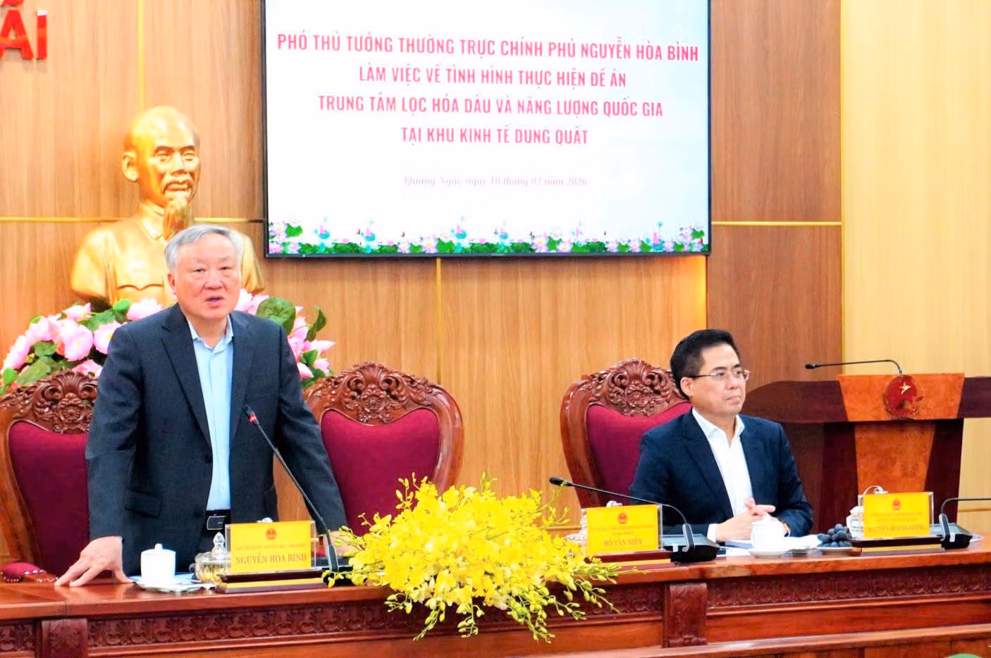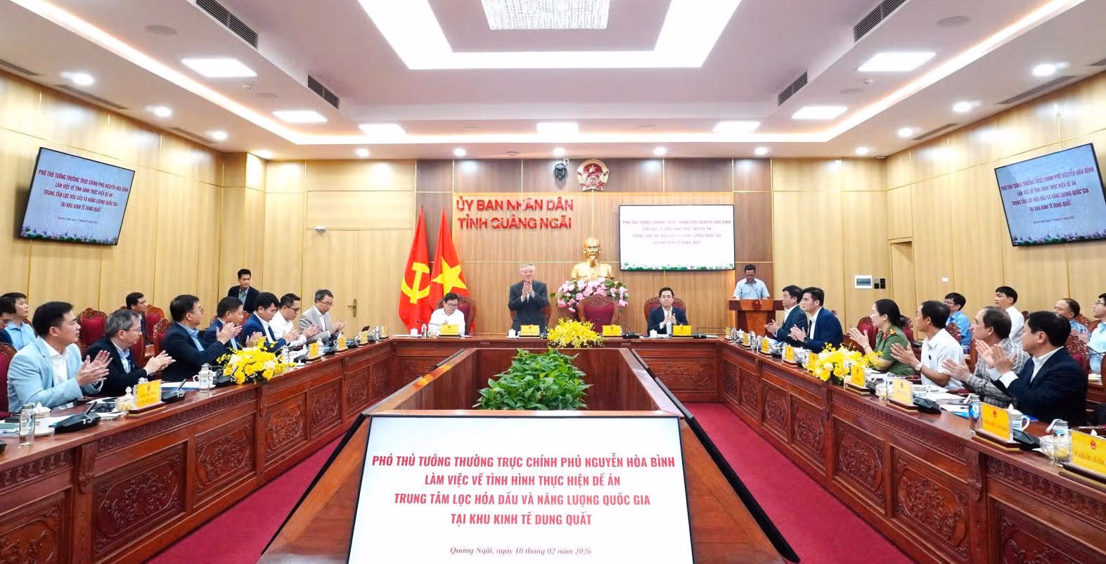 Ngày 10/2, Đoàn công tác của Chính phủ do Phó Thủ tướng Thường trực Chính phủ Nguyễn Hòa Bình dẫn đầu đã có buổi làm việc với tỉnh Quảng Ngãi về tình hình thực hiện Đề án Trung tâm lọc hóa dầu và năng lượng quốc gia tại Khu Kinh tế Dung Quất.