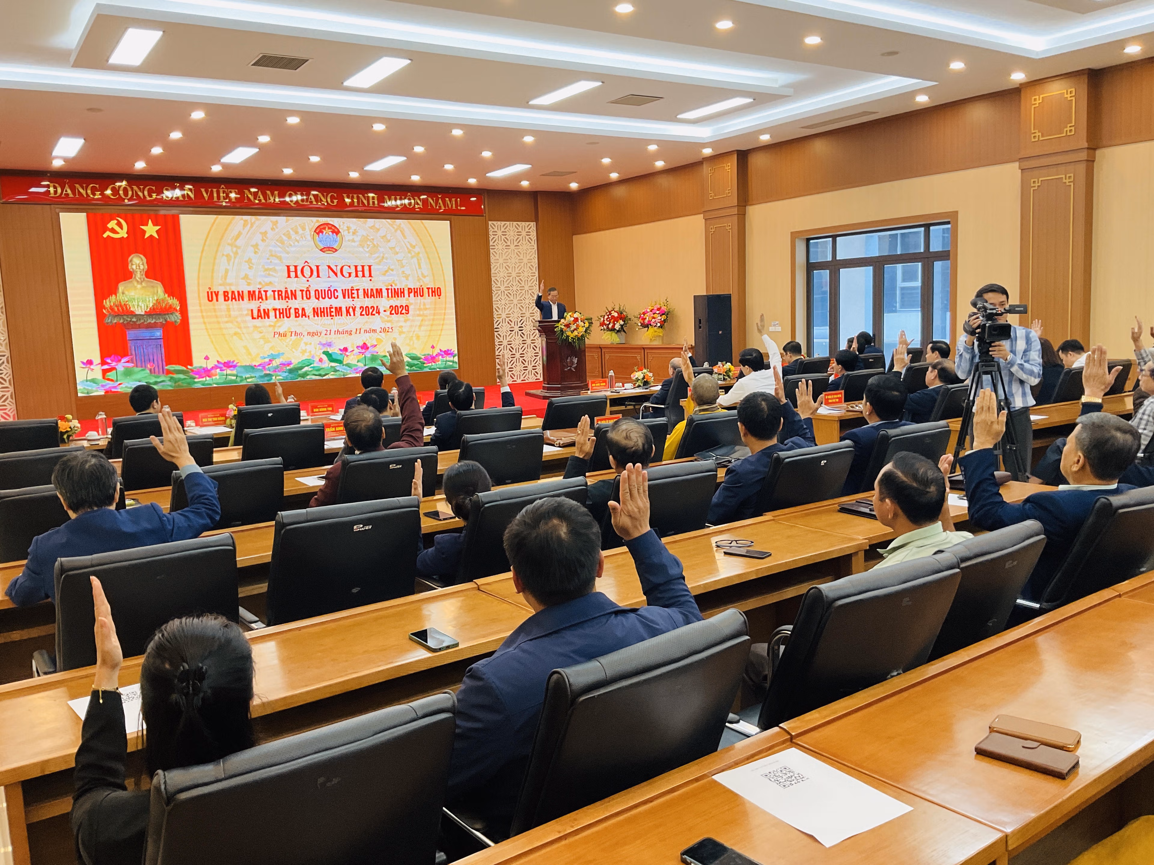Hội nghị Uỷ ban MTTQ Việt Nam tỉnh Phú Thọ lần thứ 3, nhiệm kỳ 2024-2029 diễn ra chiều nay đã thông qua Tờ trình về việc giới thiệu nhân sự hiệp thương cử Ủy viên Ủy ban và giữ chức Chủ tịch Ủy ban MTTQ Việt Nam tỉnh Phú Thọ nhiệm kỳ 2024 - 2029 với ý kiến nhất trí 100%.
