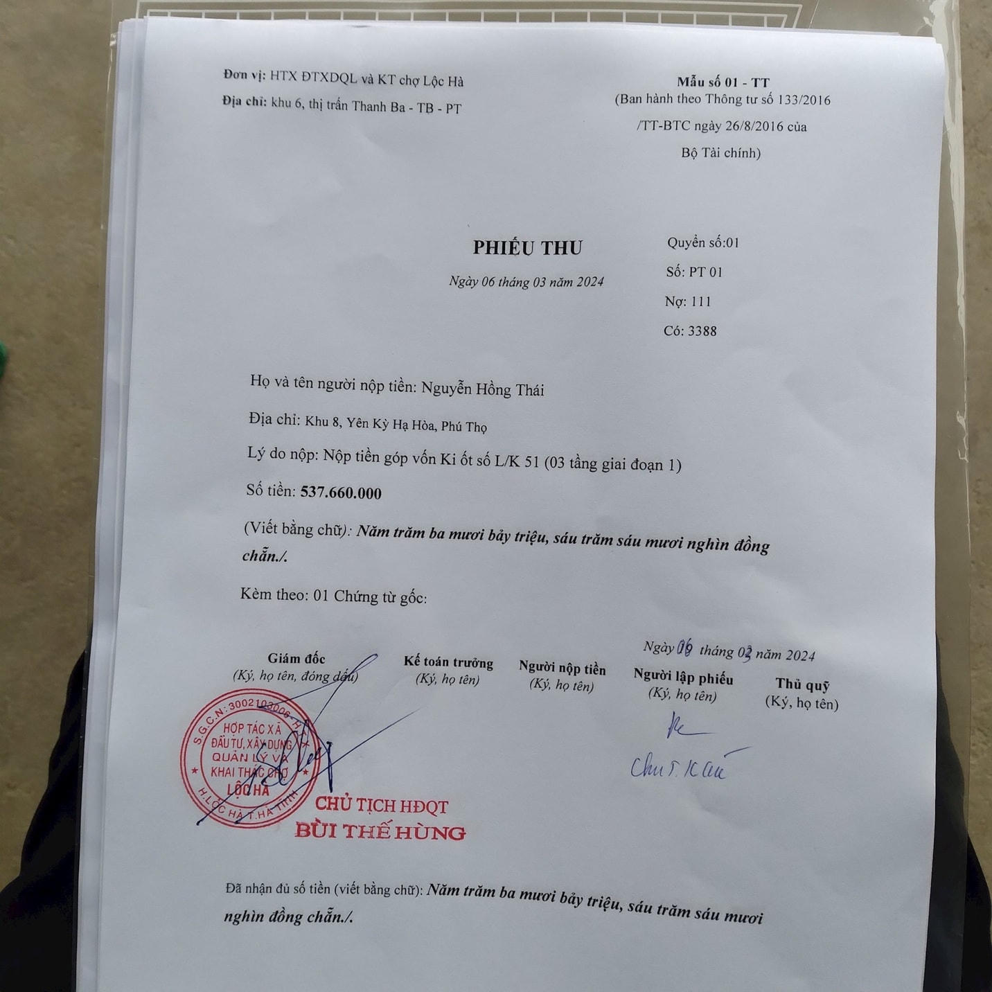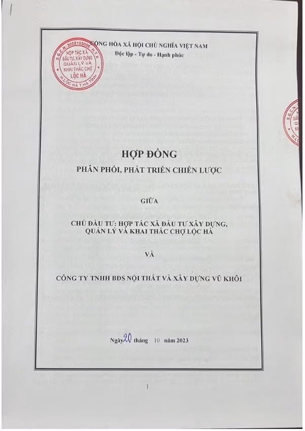 Để lấy được niềm tin, ngoài việc cung cấp Hợp đồng phân phối, phát triển giữa HTX Lộc Hà và Công ty Vũ Khôi, D. còn đưa ra “Hợp đồng góp vốn”, “Phiếu thu” tiền do ông Bùi Thế Hùng – Chủ tịch HĐQT HTX Lộc Hà ký.