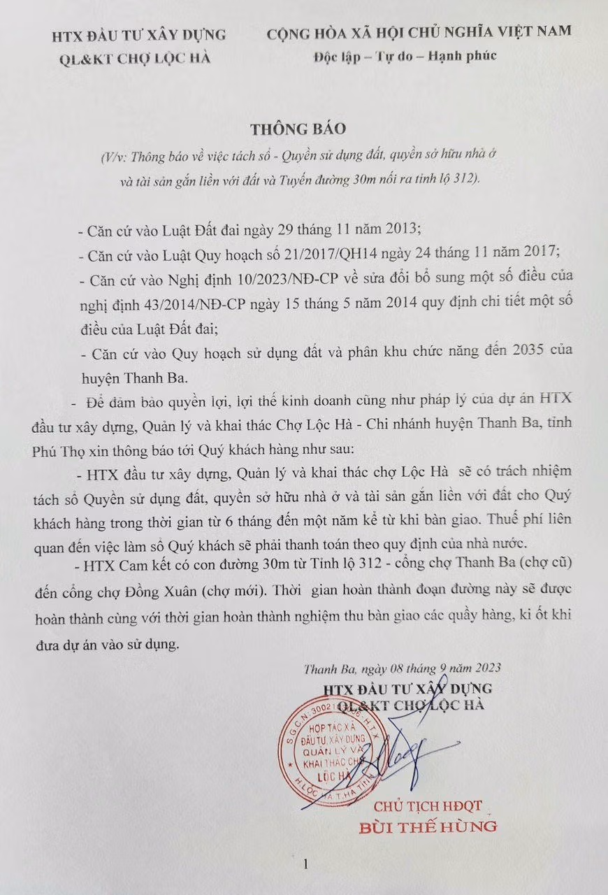 Ngoài ra, D. còn cung cấp thông báo đề ngày 8/9/2023 do ông Bùi Thế Hùng ký về việc tách sổ - Quyền sử dụng đất, quyền sở hữu nhà ở và tài sản gắn liền với đất. Theo thông báo này, HTX Lộc Hà có trách nhiệm tách sổ Quyền sử dụng đất, quyền sở hữu nhà ở và tài sản gắn liền với đất cho khách hàng trong thời gian từ 6 tháng đến 1 năm kể từ khi bàn giao. Thuế, phí liên quan đến việc làm sổ, khách hàng sẽ phải thanh toán theo quy định của nhà nước.