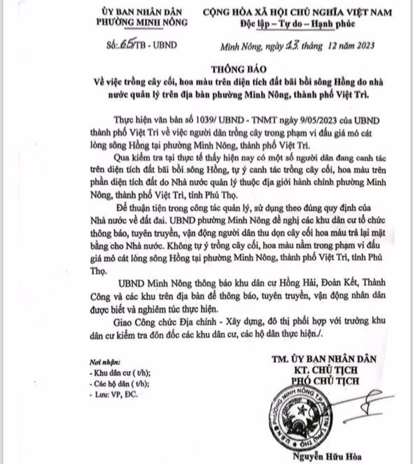 Tìm hiểu của PV được biết, trong các năm 2020, 2022, 2023, UBND phường Minh Nông liên tiếp có thông báo về việc trồng cây cối, hoa màu trên diện tích bãi bồi do Nhà nước quản lý trên địa bàn.