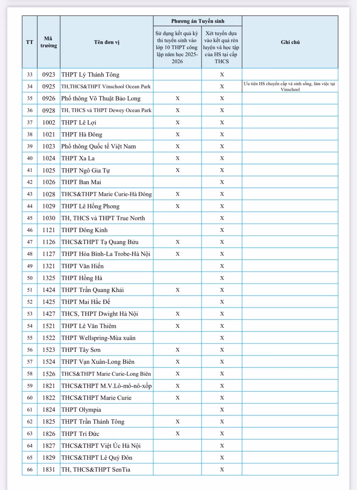Học sinh tra cứu phương án tuyển sinh của từng trường theo bảng dưới đây: