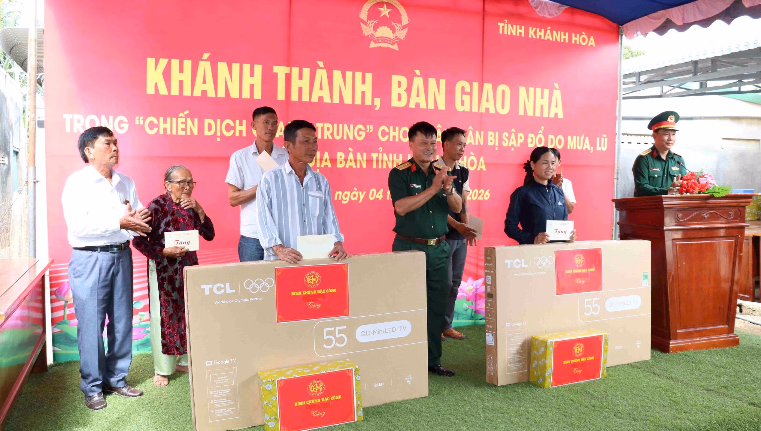 Tại Khánh Hòa, Quân khu 5 phối hợp với UBND tỉnh và các đơn vị liên quan bàn giao 6 căn nhà cho các hộ dân tại phường Đô Vinh, xã Phước Hậu và xã Tây Khánh Sơn. Các căn nhà do Bộ Chỉ huy quân sự (CHQS) tỉnh, Vùng 4 Hải quân và Lữ đoàn Đặc công nước 5 phối hợp xây dựng, bảo đảm tiến độ, chất lượng dù điều kiện thời tiết không thuận lợi.
