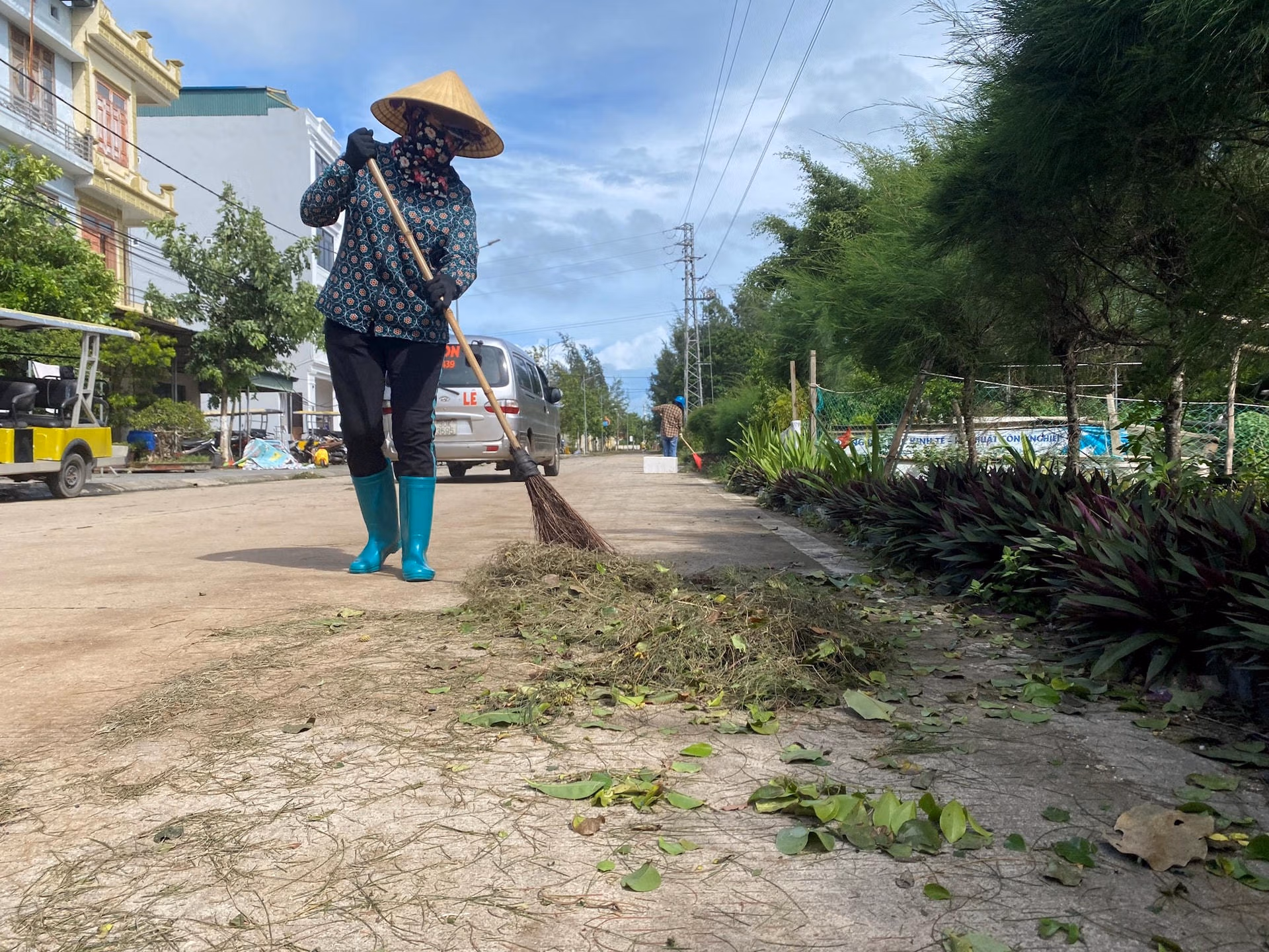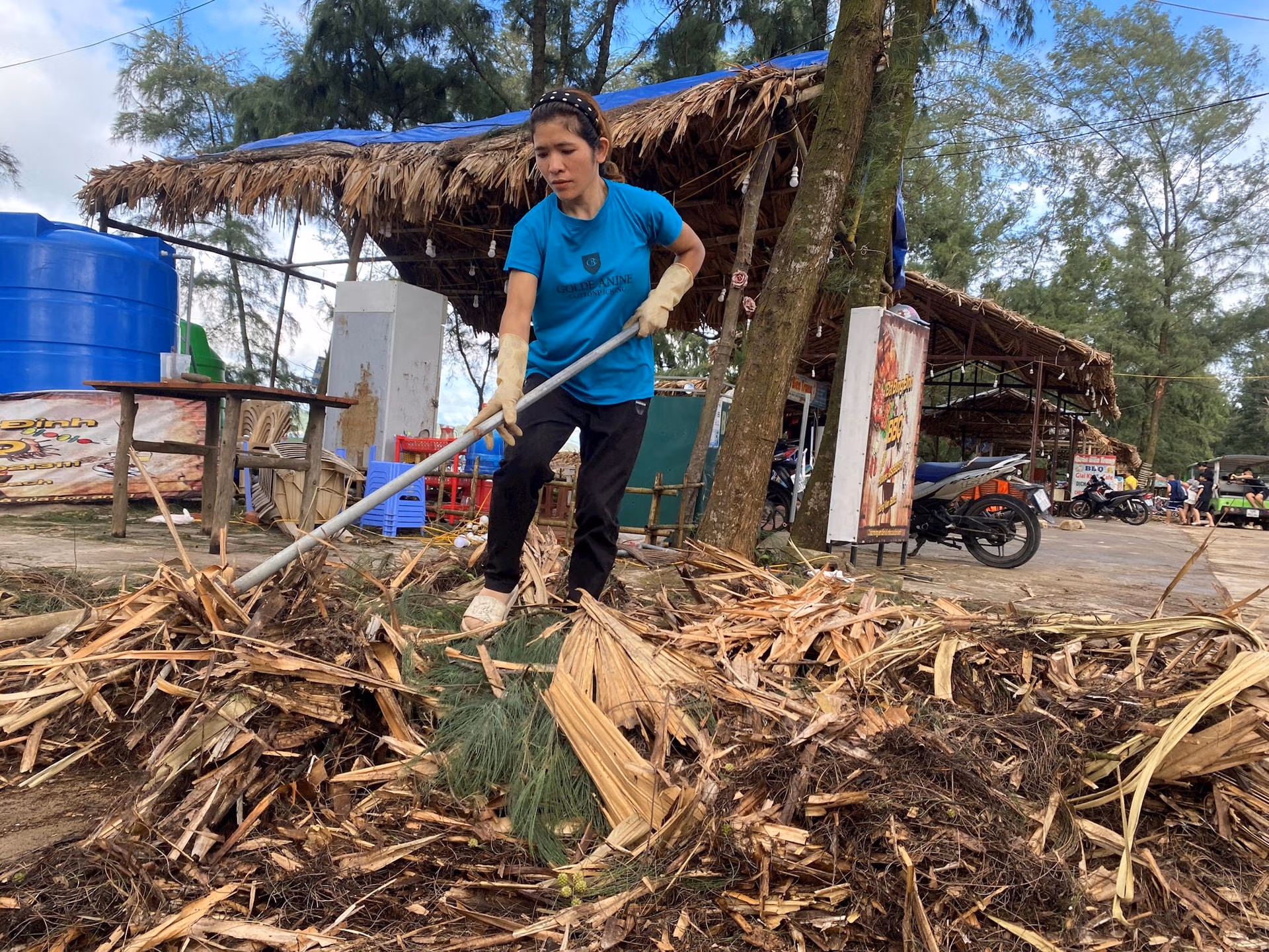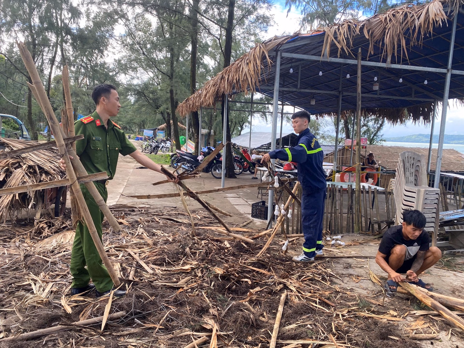 Chiều 23/7, bầu trời Cô Tô hửng nắng sau cơn giông bão, quân và dân đang cùng nhau hối hả dọn dẹp, vệ sinh môi trường trên huyện đảo.