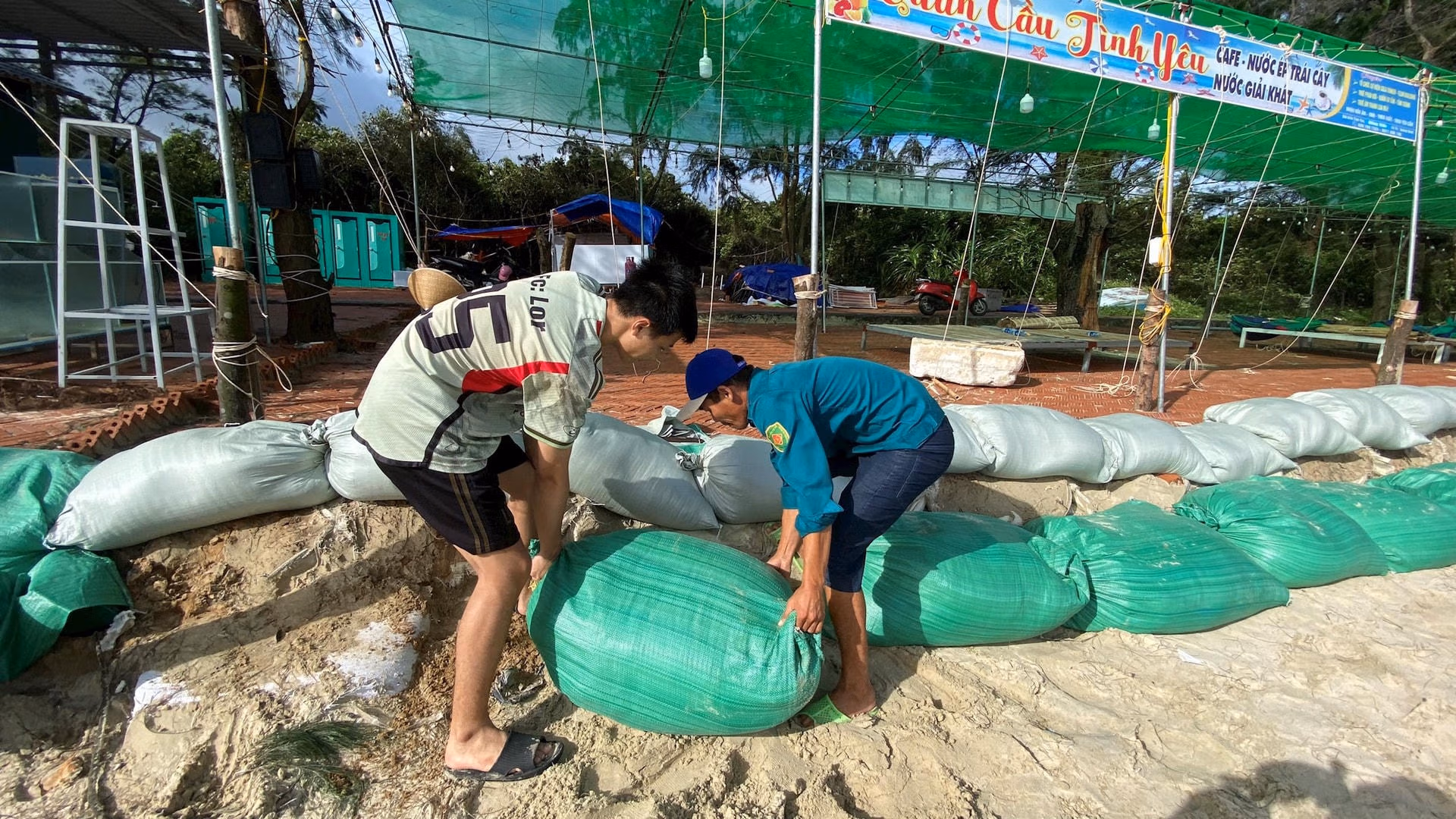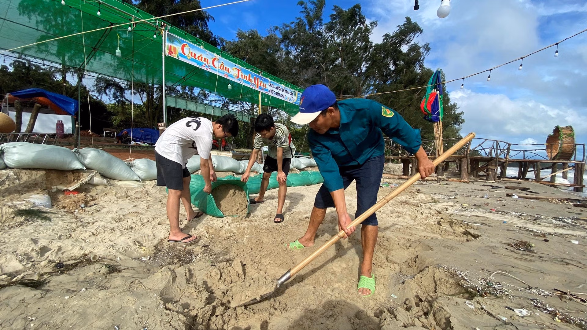 Đến chiều 23/7, bầu trời Cô Tô hửng nắng, gió giảm, tuy nhiên sóng Nam vẫn còn to. Tranh thủ thời tiết đẹp, quân và dân trên huyện đảo tập trung cùng nhau dọn dẹp "hậu quả" do cơn bão số 2 gây ra.