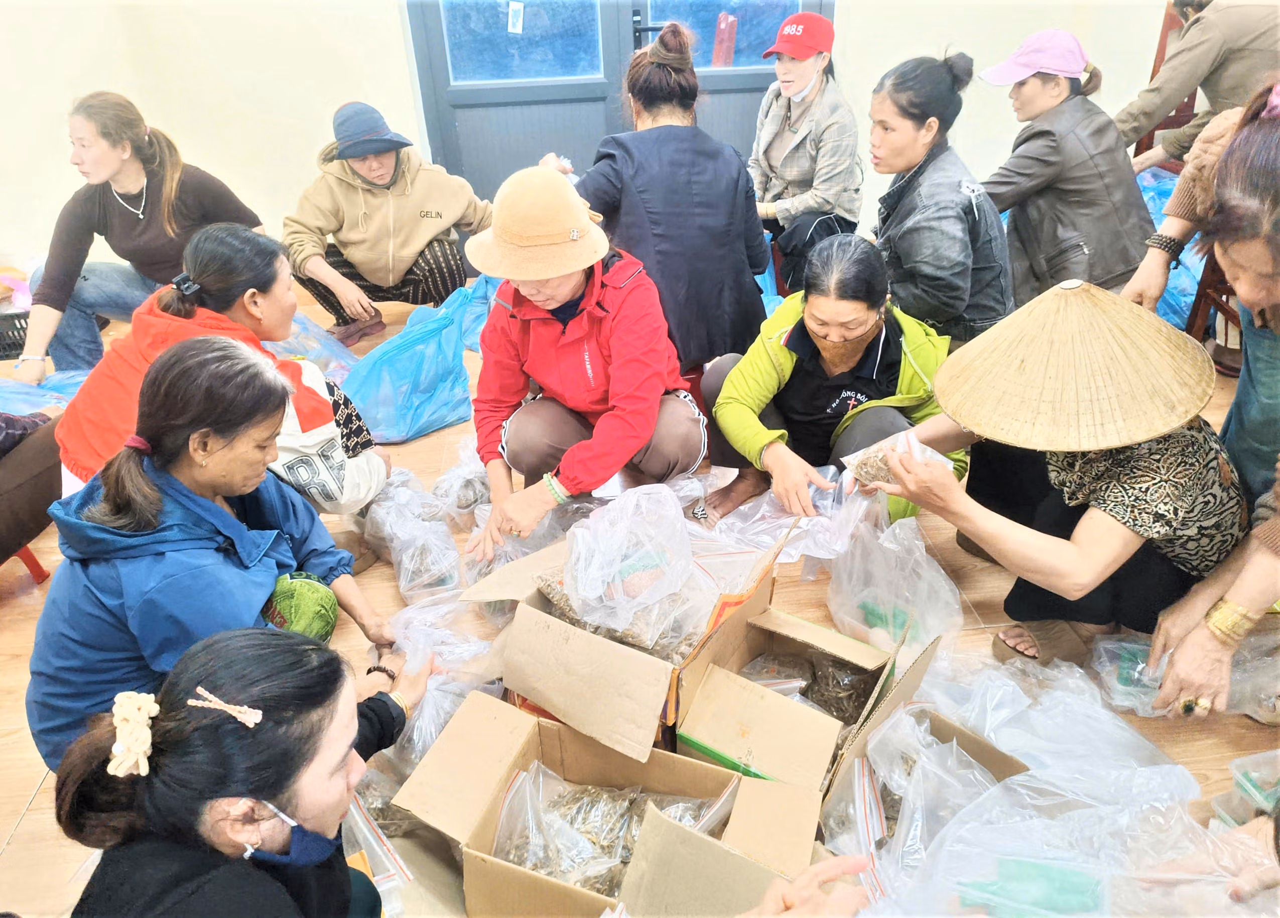 Hàng chục người trong thôn đang tiếp tục rim 200 phần cá, chuẩn bị quà để kịp cho chuyến xe cứu trợ xuất phát đi Đắk Lắk trong chiều 24/11.