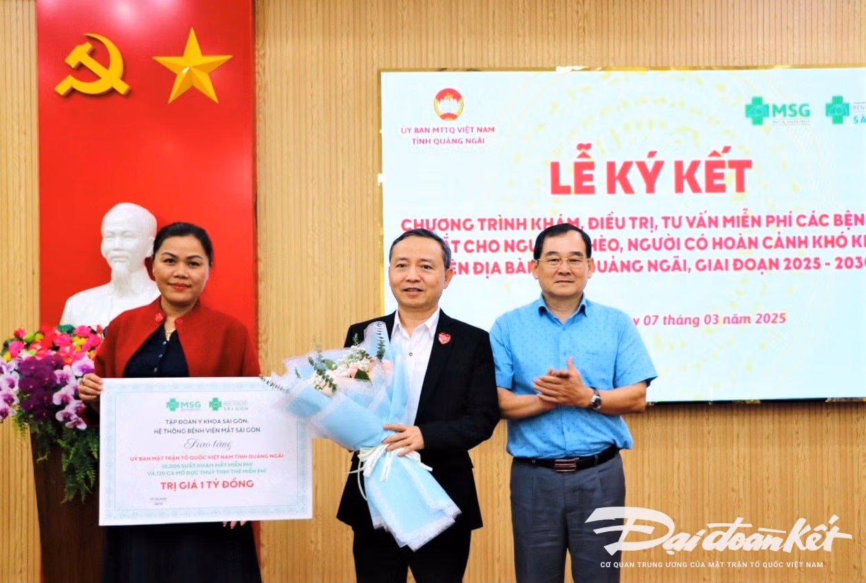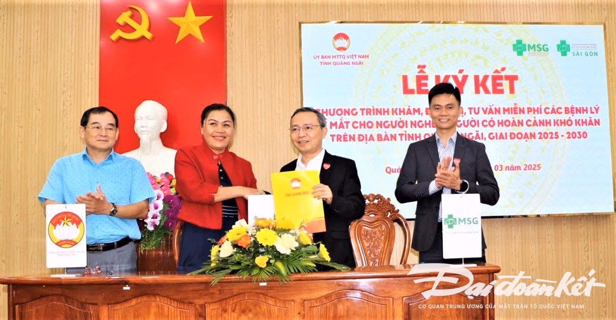 Chiều 7/3, Ủy ban Mặt trận Tổ quốc Việt Nam tỉnh Quảng Ngãi phối hợp với Tập đoàn Y khoa Sài Gòn tổ chức lễ ký kết thực hiện chương trình khám, điều trị, tư vấn miễn phí các bệnh lý về mắt cho người nghèo, người có hoàn cảnh khó khăn trên địa bàn tỉnh, giai đoạn 2025 - 2030.