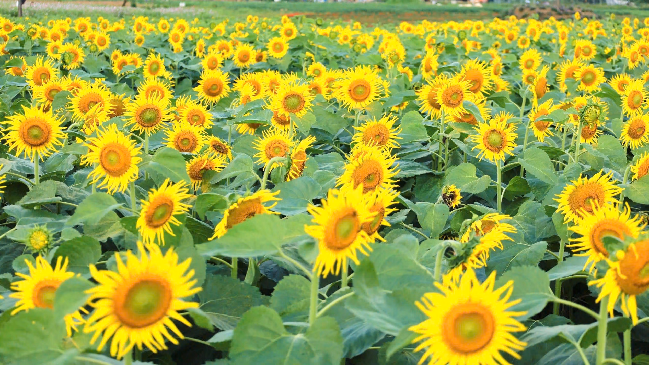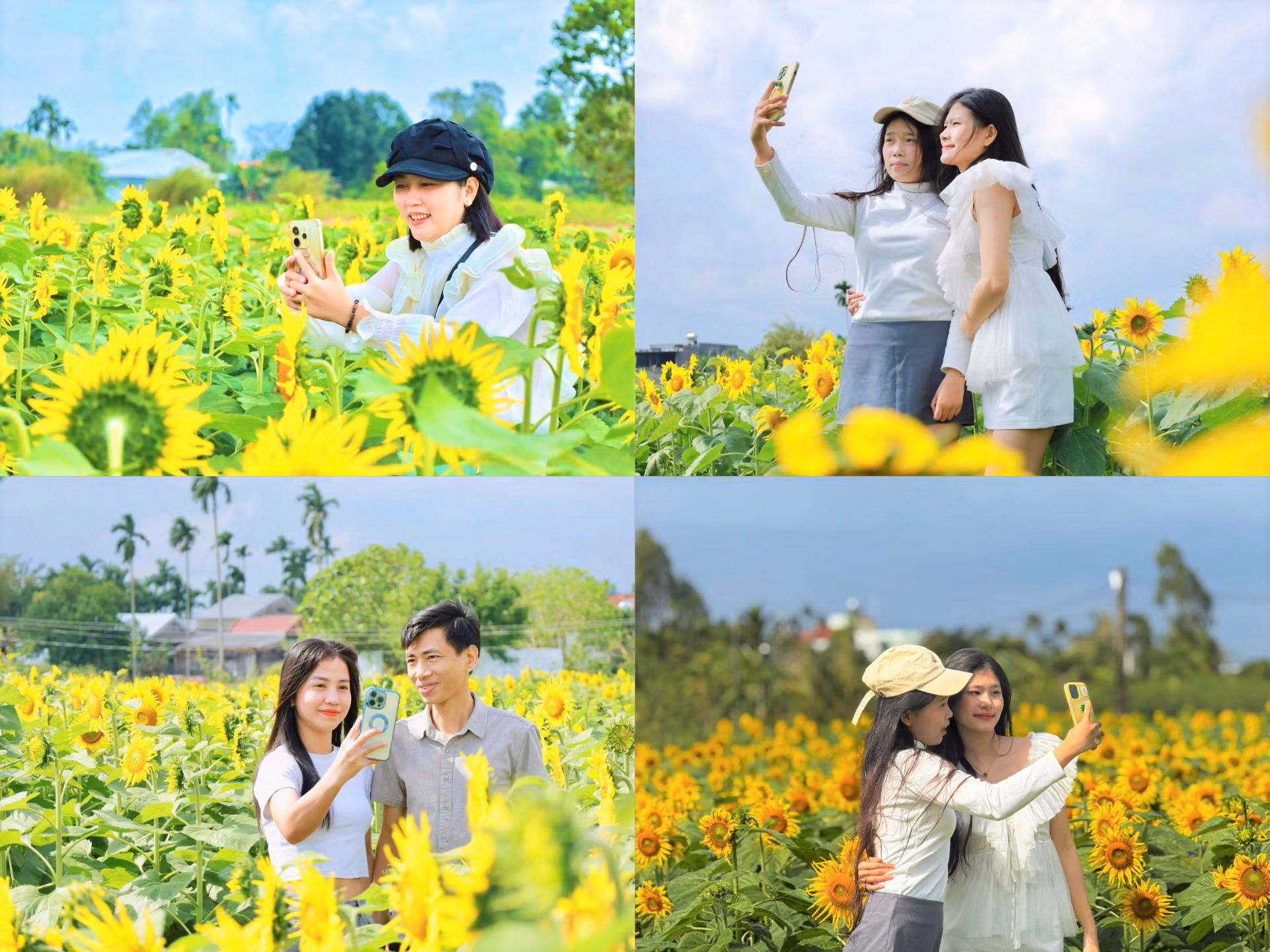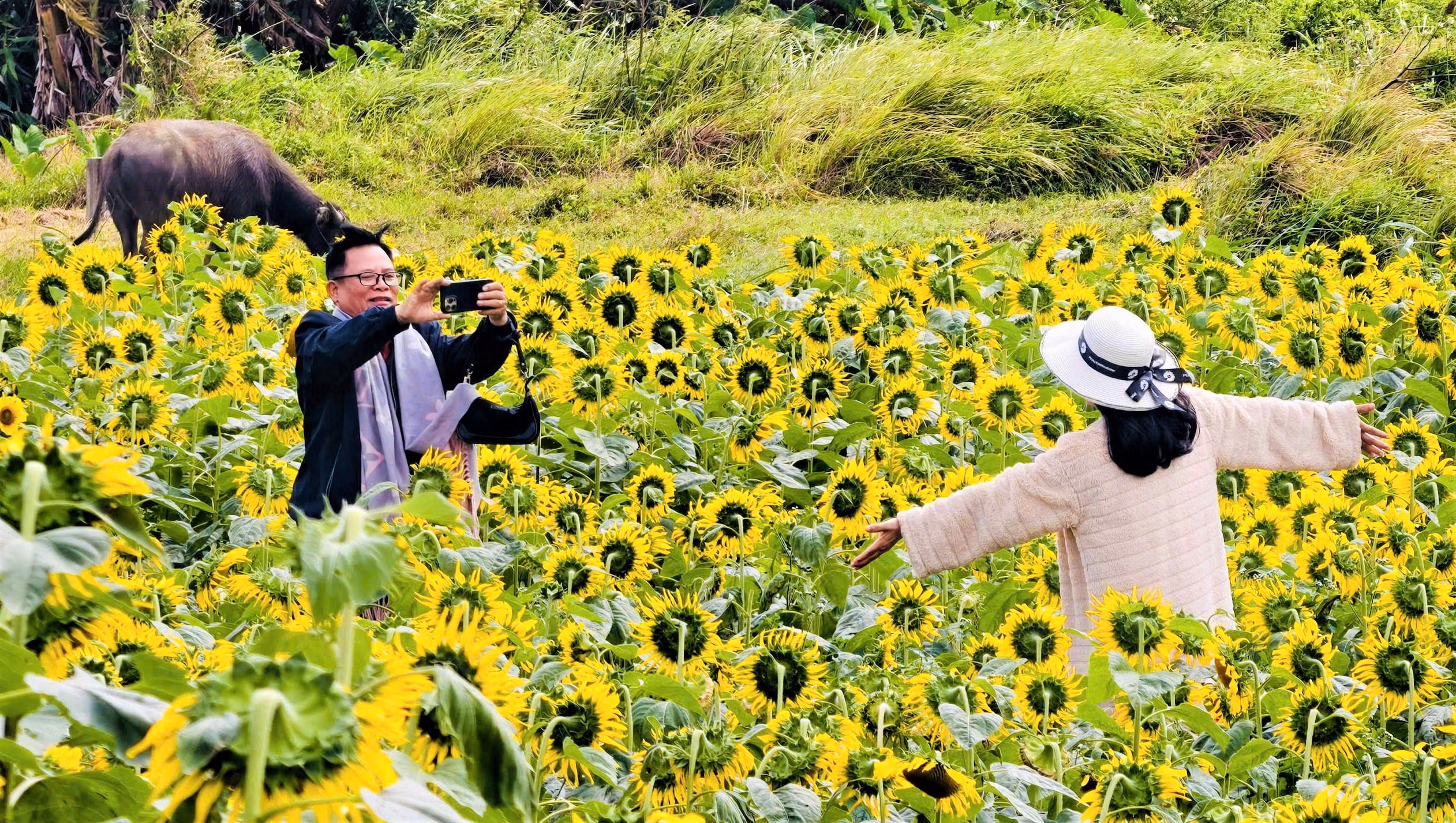 Từ sáng sớm đến chiều muộn, trên những lối đi giữa cánh đồng hoa hướng dương vàng rực rỡ, từng nhóm người dạo bước, hít thở bầu không khí trong lành và tận hưởng bầu không khí trong lành và yên bình.