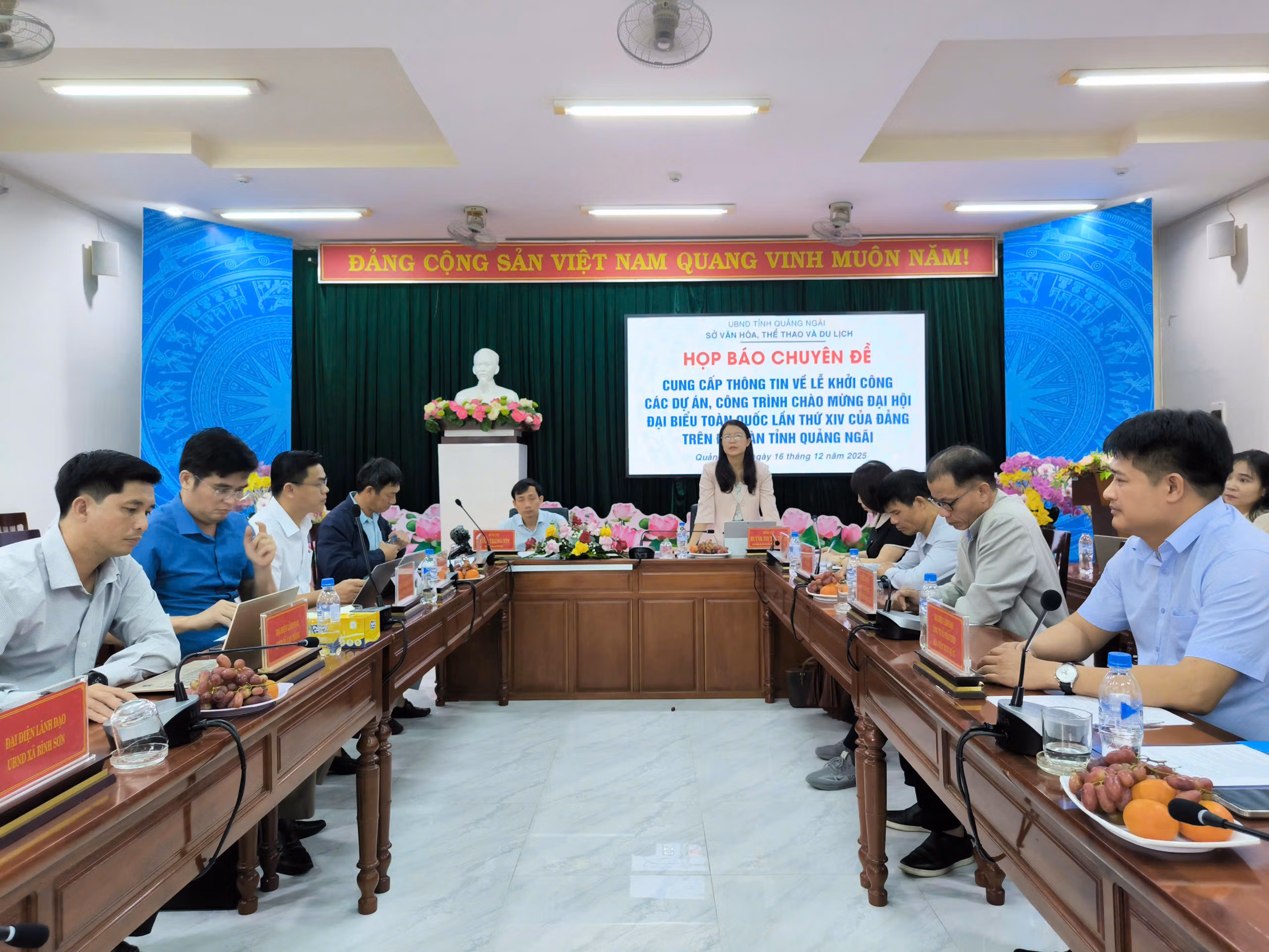 Chiều 16/12, Sở Văn hóa, Thể thao và Du lịch (VHTTDL) tỉnh Quảng Ngãi phối hợp với các cơ quan, đơn vị liên quan tổ chức họp báo chuyên đề để cung cấp thông tin cho báo chí về các nội dung Lễ khởi công các dự án, công trình chào mừng Đại hội đại biểu toàn quốc lần thứ XIV của Đảng trên địa bàn tỉnh Quảng Ngãi.