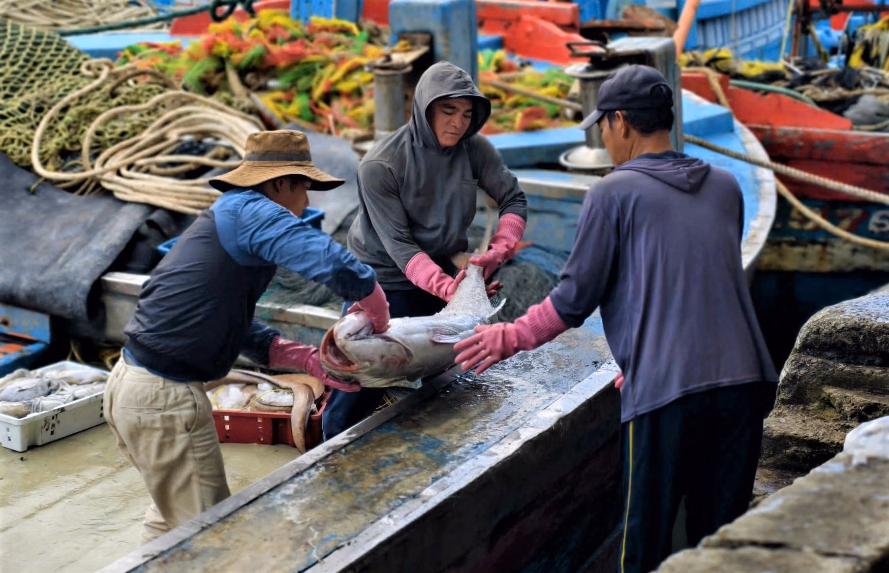 Cùng thời điểm, tàu của ngư dân Nguyễn Thưởng vừa trở về từ Hoàng Sa với hơn 30 tấn cá ngừ, ước thu trên 650 triệu đồng; mỗi thuyền viên được chia trên dưới 12 triệu đồng.