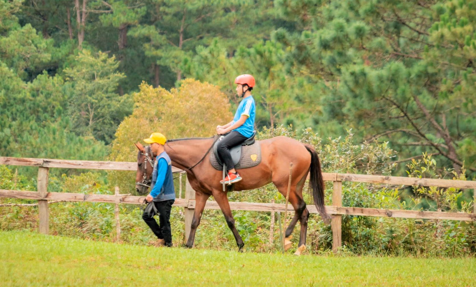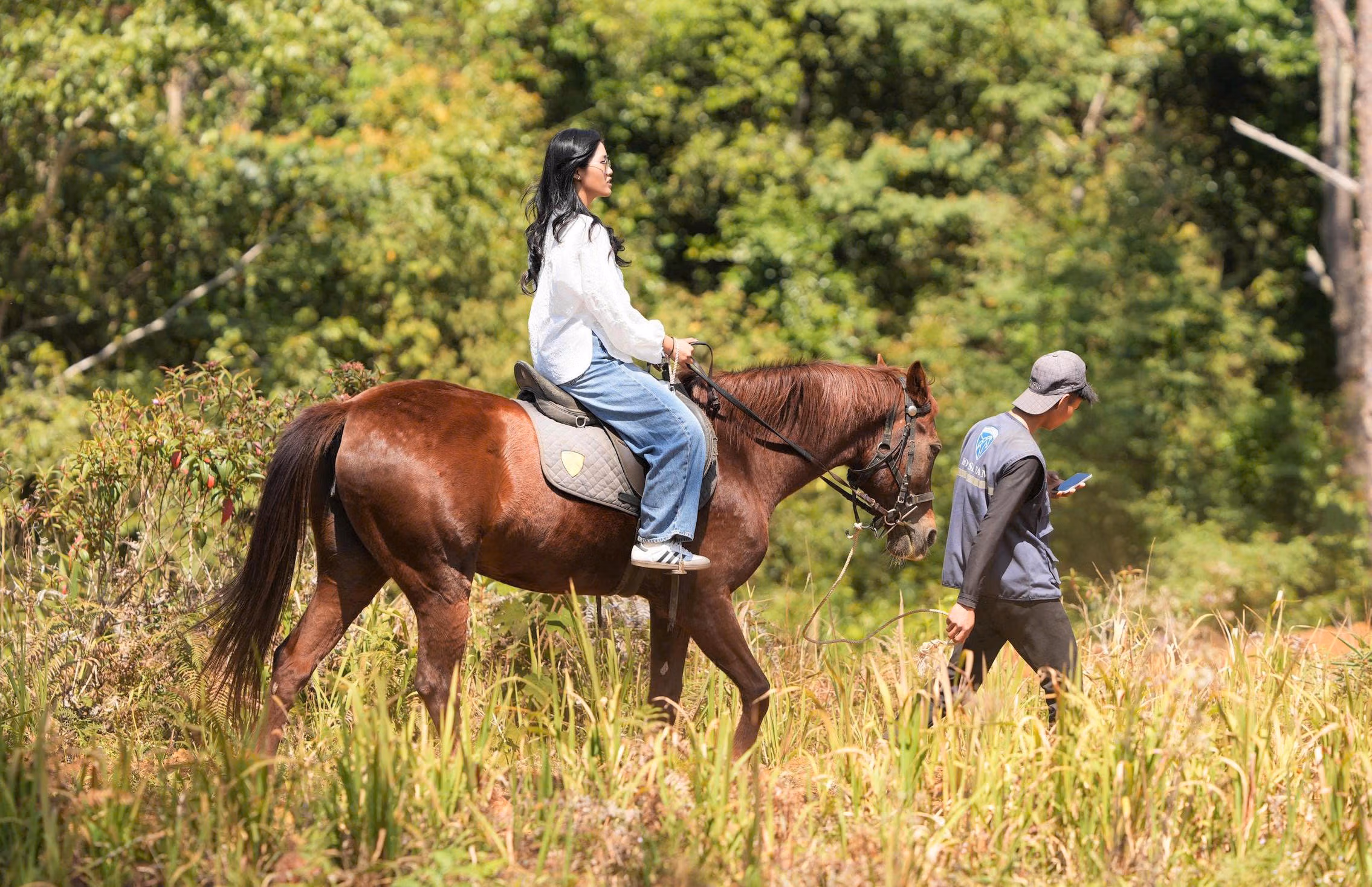 Giữa những triền thông bạt ngàn, rừng cổ thụ xanh mát và các vạt hoa anh đào khoe sắc, du khách cưỡi ngựa len theo những cung đường giữa đại ngàn, tận hưởng bầu không khí trong lành, yên bình.