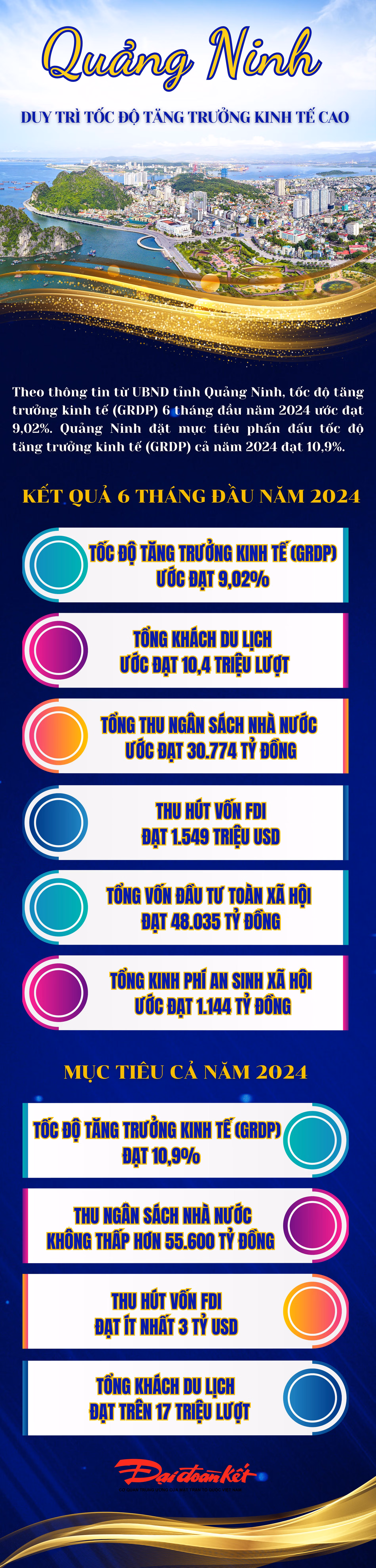 Theo thông tin từ UBND tỉnh Quảng Ninh, tốc độ tăng trưởng kinh tế (GRDP) 6 tháng đầu năm 2024 ước đạt 9,02%. Quảng Ninh đặt mục tiêu phấn đấu tốc độ tăng trưởng kinh tế (GRDP) cả năm 2024 đạt 10,9%.