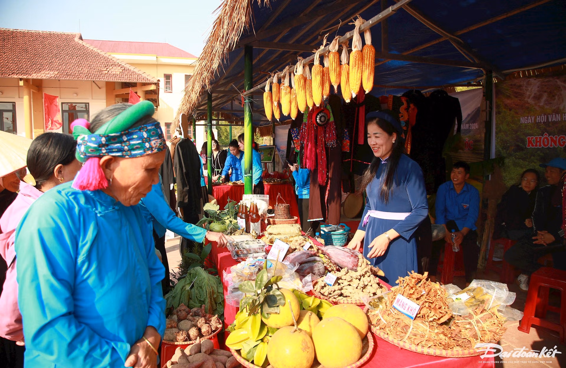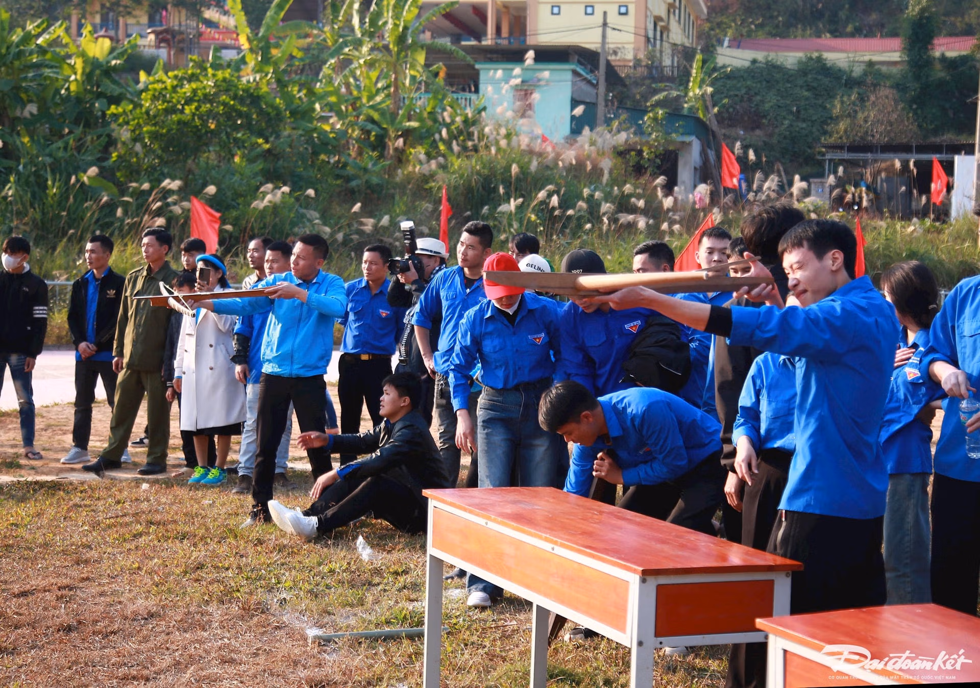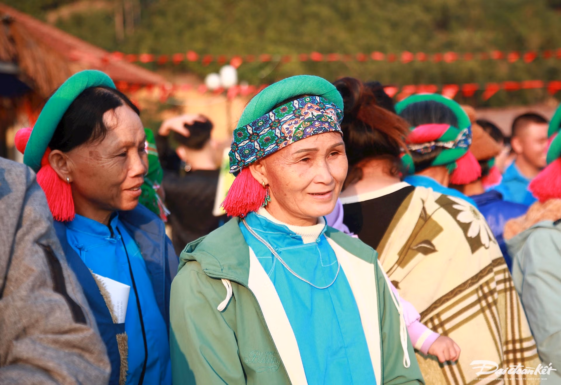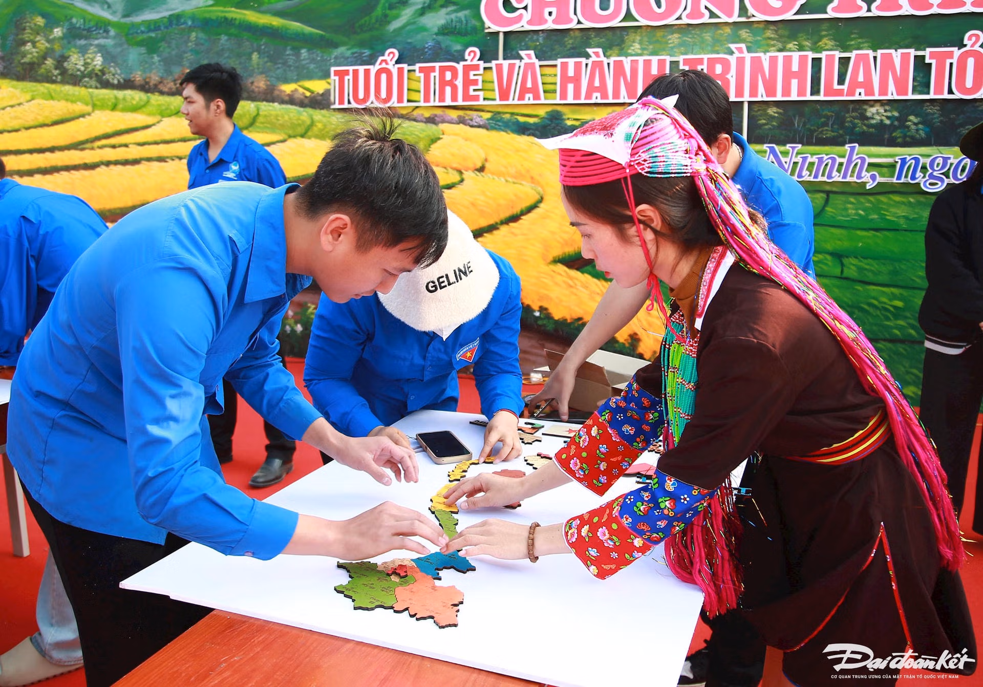 Màu áo xanh của hơn 500 đoàn viên viên thanh niên hòa lẫn với màu áo xanh truyền thống của phụ nữ người Sán Chỉ, tạo nên khung cảnh hiếm có ở thung lũng Đại Dực, huyện Tiên Yên (Quảng Ninh).
