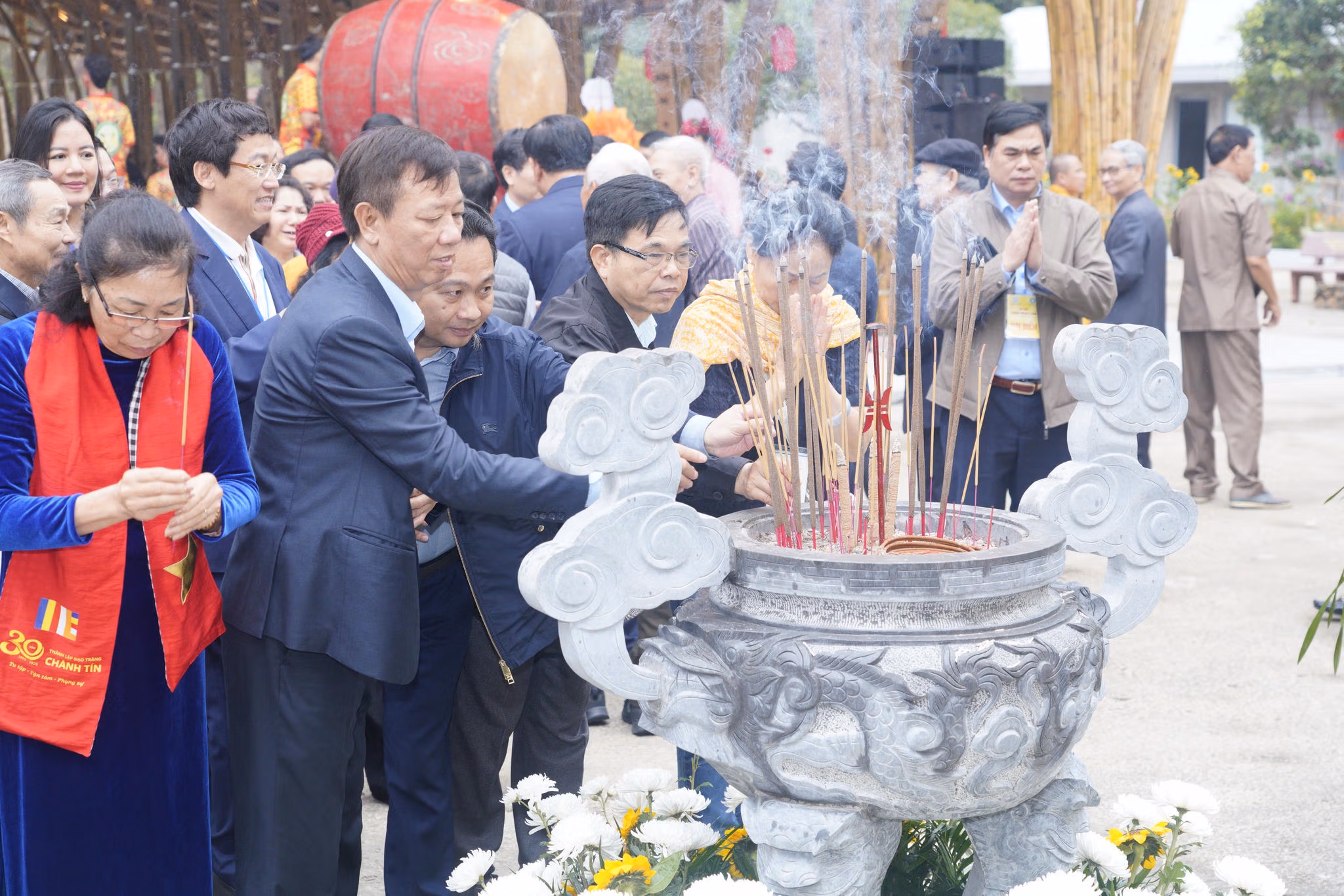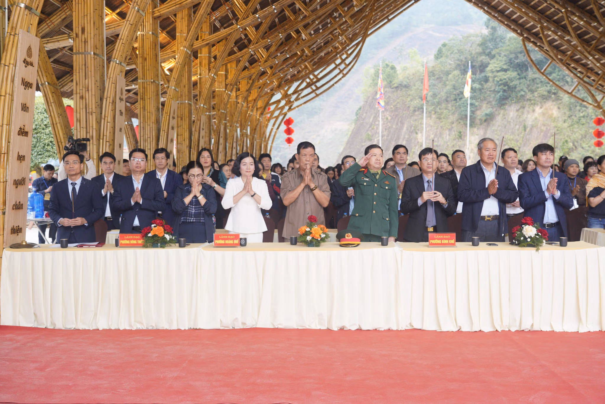 Các đại biểu, tăng ni, phật tử cùng đông đảo nhân dân thực hiện nghi thức cầu Quốc thái dân an, gửi gắm ước nguyện bình an, thịnh vượng cho đất nước và mỗi gia đình trong năm Bính Ngọ 2026.
