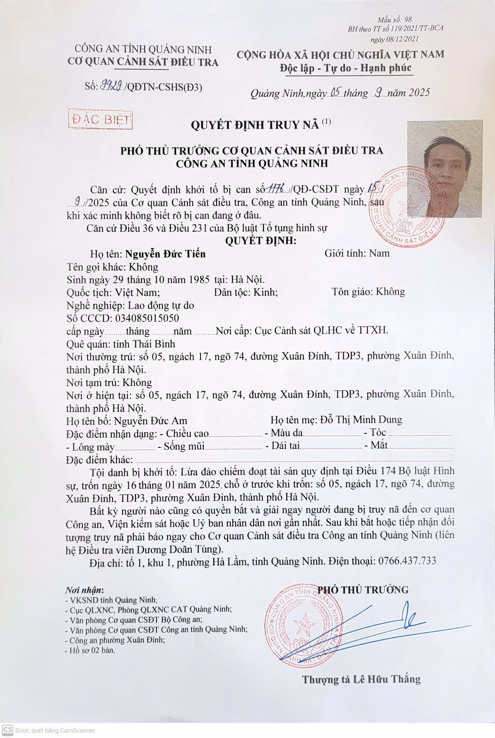 Công an tỉnh Quảng Ninh kêu gọi Nguyễn Đức Tiến nhanh chóng ra đầu thú để được hưởng khoan hồng của pháp luật. Người dân khi phát hiện thông tin về đối tượng truy nã liên hệ Điều tra viên Dương Doãn Tùng, số điện thoại 0766.437.733; đồng thời cảnh báo người dân nâng cao cảnh giác, tuyệt đối không cho mượn hoặc cho thuê tài khoản ngân hàng, không cung cấp thông tin cá nhân cho các đối tượng không rõ lai lịch. Mọi hành vi bao che, giúp đỡ người bị truy nã sẽ bị xử lý nghiêm theo quy định.