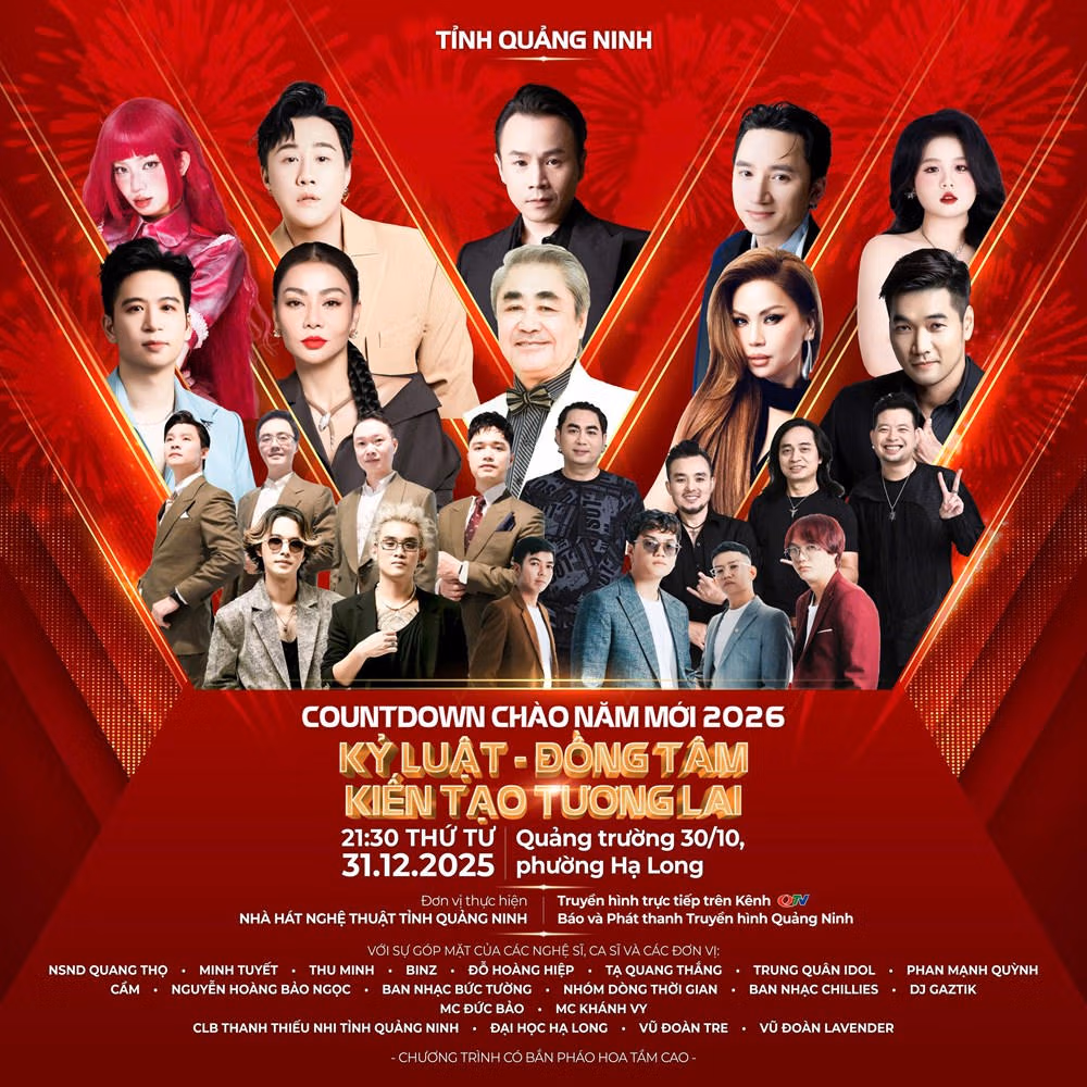 Sự kiện khởi đầu dịp Tết Dương lịch tại Quảng Ninh là chương trình Countdown Chào năm mới 2026 với chủ đề “Kỷ luật - Đồng Tâm, Kiến tạo tương lai”, bắt đầu từ 21h30 tối nay (31/12) tại Quảng trường 30/10, phường Hạ Long, với thời lượng 180 phút, quy mô 50.000 khán giả.