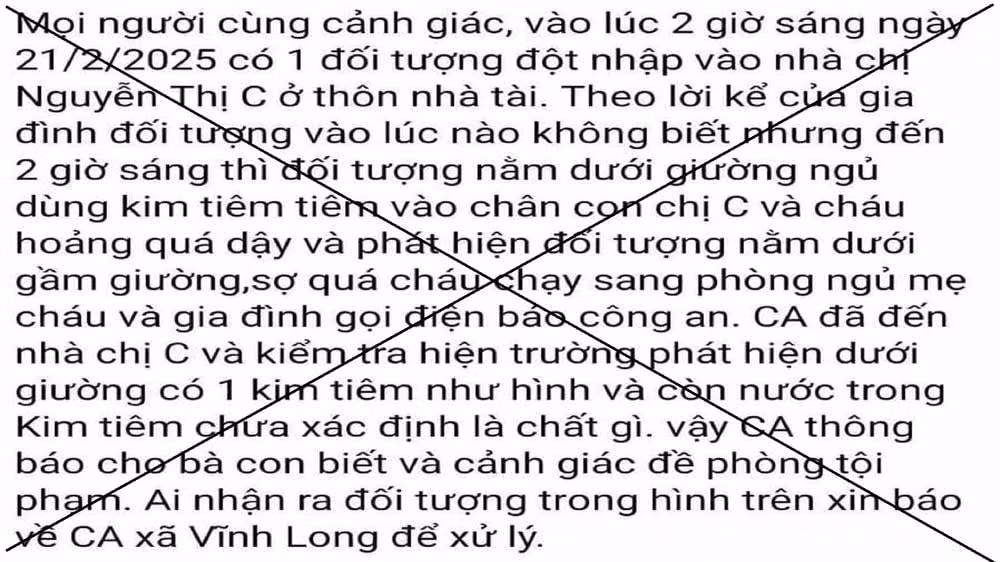 Đến chiều 21/2, qua xác minh, lực lượng Công an xác định, thông tin người lạ đột nhập vào nhà chị C., trốn dưới gầm giường và chích kim tiêm vào con gái chị C. là sai sự thật.