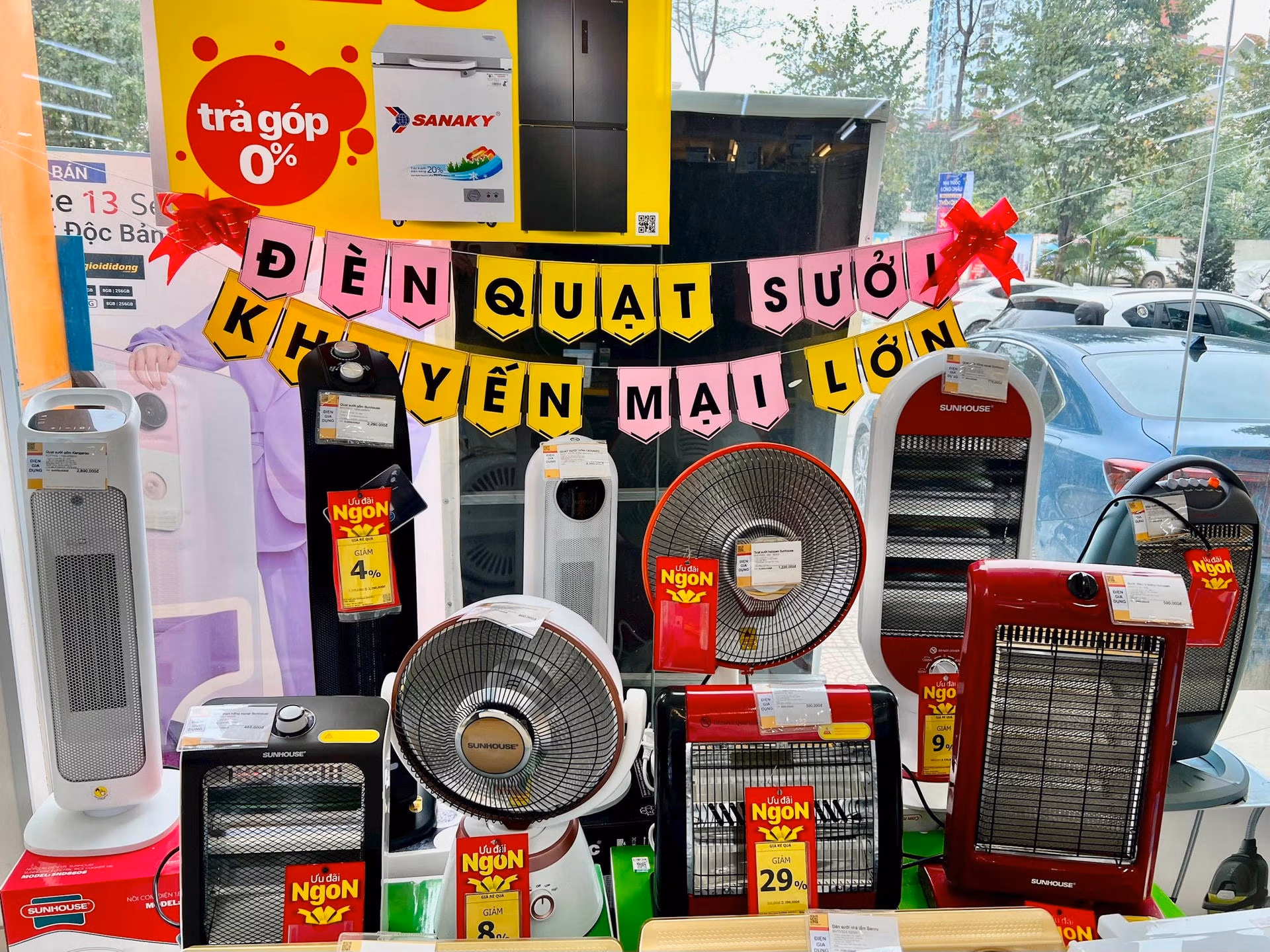 Theo ghi nhận của PV, tại một siêu thị Điện máy Xanh trên phố Nguyễn Hoàng (quận Nam Từ Liêm, Hà Nội), hàng loạt thiết bị sưởi ấm như đèn sưởi ấm, máy sưởi gốm ceramic được ưu tiên trưng bày ở ngay cửa ra vào với dòng chữ "khuyến mại lớn".