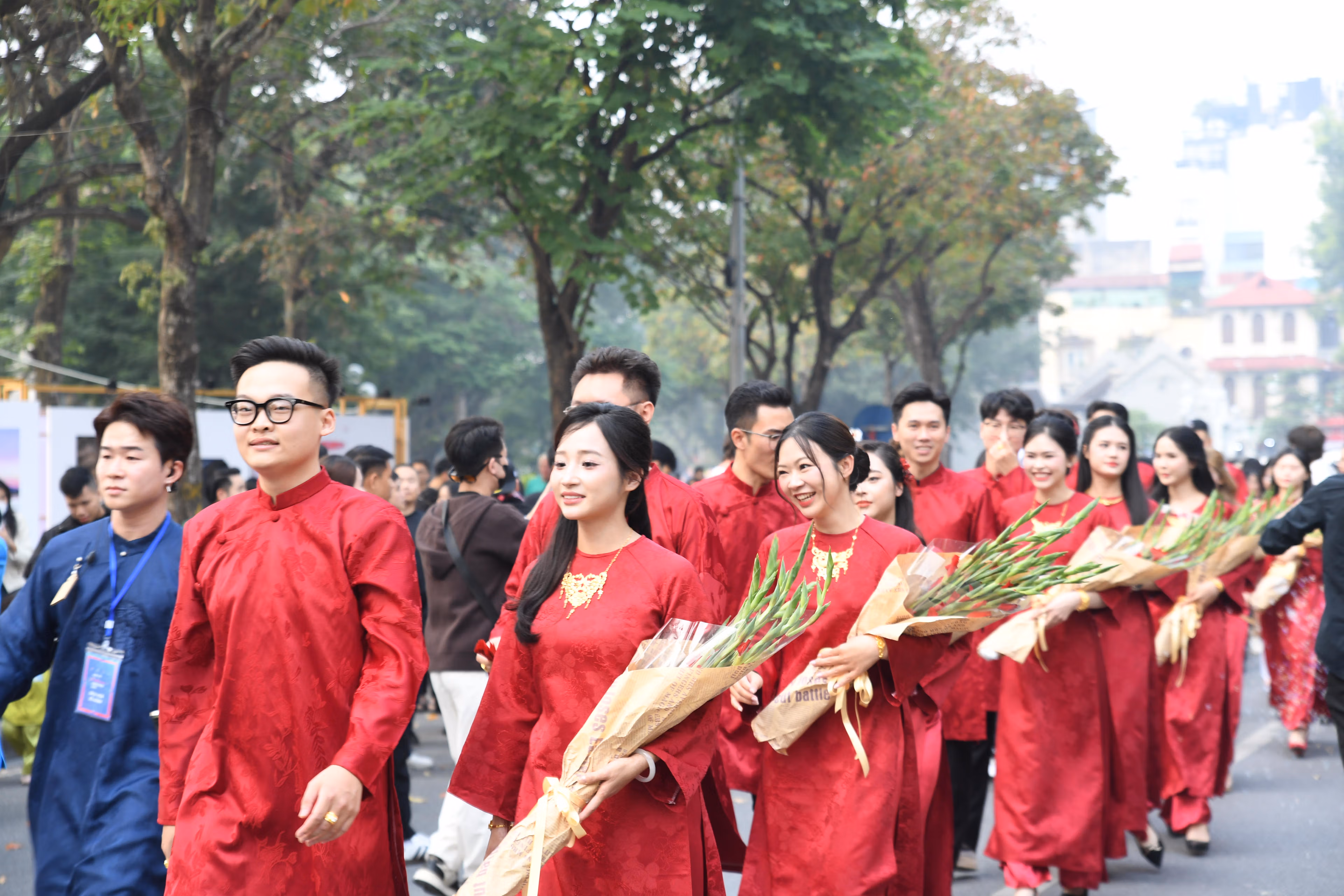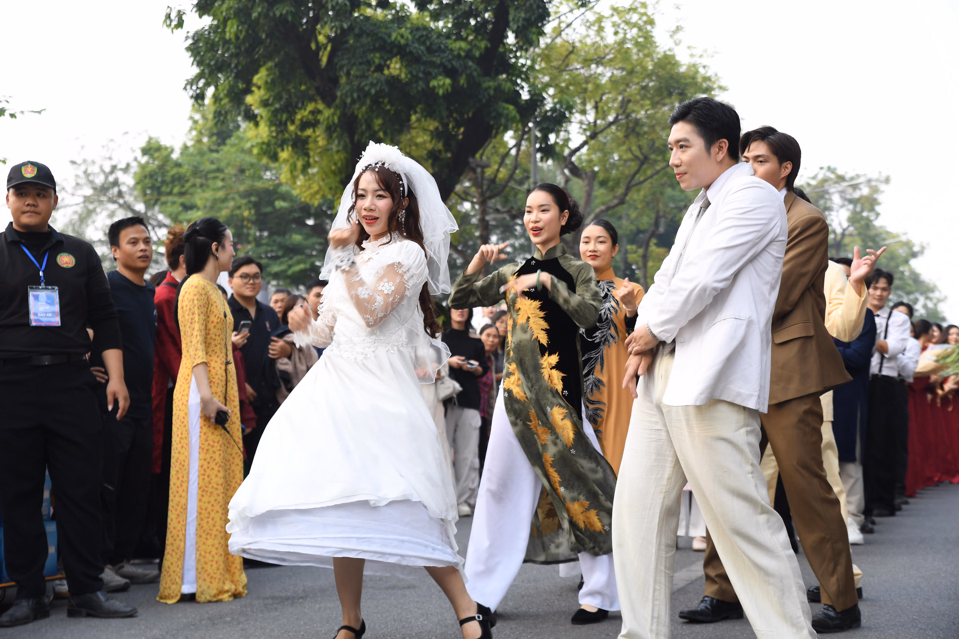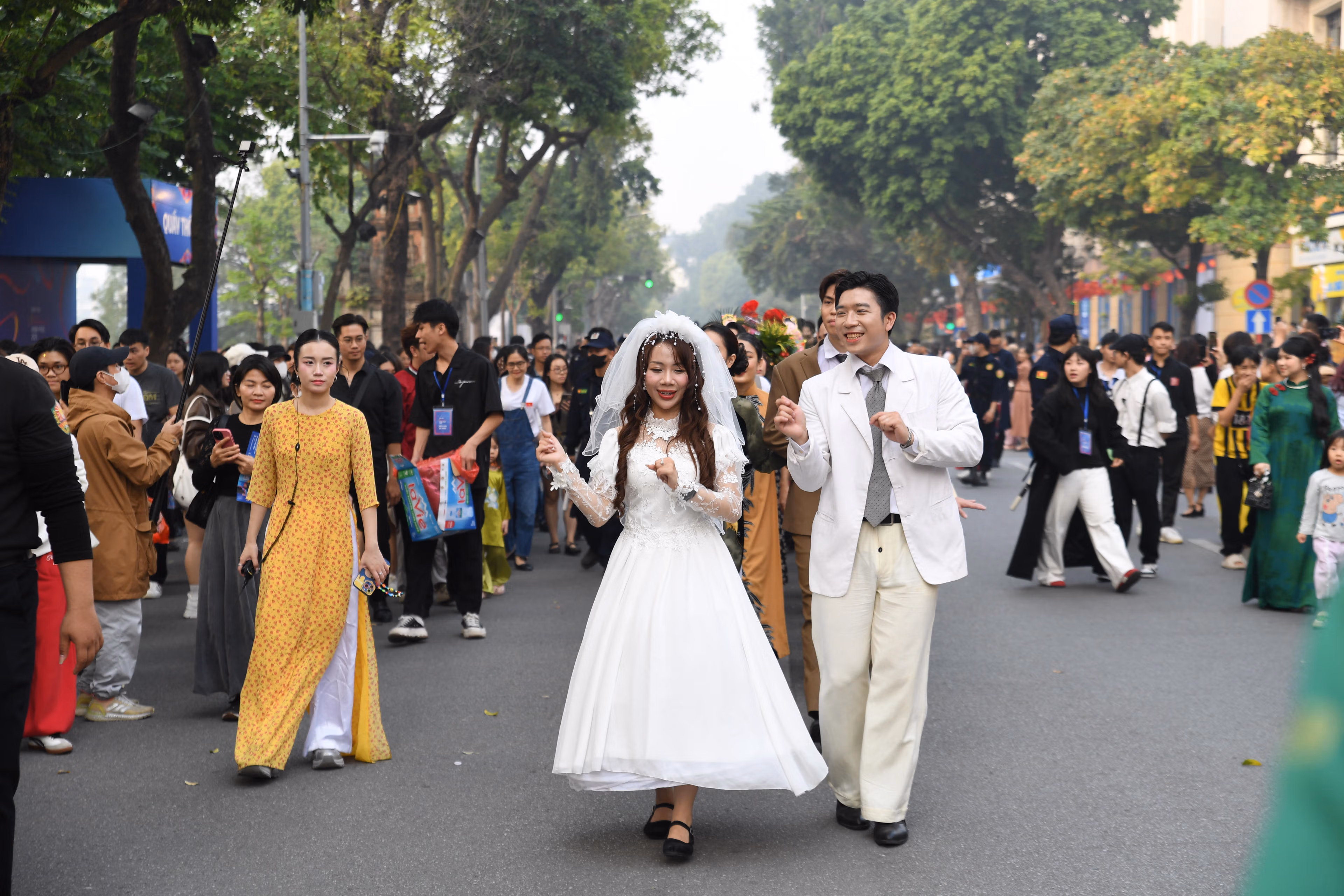 Rộn ràng lễ cưới xưa trên phố đi bộ Hồ Gươm Chủ Nhật 07/12/2025 20:11 (GMT+7) Chiều ngày 7/12, trong khuôn khổ “Ngày hội Việt Nam hạnh phúc - Vietnam Happy Fest 2025”, đã diễn ra hoạt động diễu hành Việt phục "Bách hoa Hỷ sự" tại phố đi bộ Hồ Hoàn Kiếm (Hà Nội). Những điệu nhảy huyền thoại của đám cưới thập niên 90, đã được tái hiện ở phố đi bộ Hoàn Kiếm (Hà Nội). Video: Phạm Sỹ. Khoảng 800 người trong trang phục Việt truyền thống đã cùng hòa mình vào chương trình diễu hành “Bách hoa Hỷ sự”, tạo nên bức tranh sống động tái hiện nghi lễ cưới xưa một cách trang trọng và rực rỡ, gợi nhớ những giá trị đẹp của phong tục Việt. Ảnh: Phạm Sỹ.Các cặp đôi đã tỉ mỉ chuẩn bị cho nghi lễ cưới truyền thống; người chỉnh khăn, người sửa áo, trao nhau những cử chỉ ân cần và ánh mắt hạnh phúc, tạo nên khung cảnh ấm áp và đầy ý nghĩa trước giờ rước lễ. Ảnh: Phạm Sỹ.Đoàn diễu hành khởi bước từ Quảng trường Đông Kinh Nghĩa Thục, xuôi theo Hàng Dầu, rẽ Tràng Tiền, Hàng Khay rồi uyển chuyển vòng quanh hồ Gươm trước khi trở lại sân khấu trung tâm, tạo nên một hành trình rực rỡ giữa lòng phố cổ. Ảnh: Phạm Sỹ.Những chàng trai, cô gái trong bộ trang phục truyền thống trong đoàn rước dâu. Ảnh: Phạm Sỹ.Màn trình diễn lấy cảm hứng từ nghi lễ rước dâu truyền thống của triều Nguyễn với đầy đủ thành phần: gia tộc, quan viên, tân lang - tân nương, đội bưng lễ, đội nhạc… Ảnh: Phạm Sỹ.Chàng trai trong tà áo dài đội lễ. Ảnh: Phạm Sỹ.Các phong tục nghi lễ được tái hiện trang trọng và chỉn chu. Ảnh: Phạm Sỹ.Việc đưa cổ phục và nghi lễ truyền thống ra không gian phố đi bộ không chỉ là hành động tôn vinh vẻ đẹp văn hóa Việt, mà còn mở ra cách tiếp cận gần gũi hơn, để cộng đồng – đặc biệt là người trẻ – có thể “chạm” vào di sản một cách tự nhiên, sinh động và đầy hứng thú. Ảnh: Phạm Sỹ.Chủ đề đám cưới thập niên 90 cũng là một trong những điểm nhấn đặc biệt trong Lễ hội Việt phục “Bách Hoa Hỷ Sự”, góp phần tái hiện một lát cắt quen thuộc của đời sống Việt Nam xưa với nhiều cảm xúc gợi nhớ. Ảnh: Phạm Sỹ.Những cô gái, chàng trai trong bộ trang phục áo dài thập niên 90. Ảnh: Phạm Sỹ.Những điệu nhảy Zumba, lambada cổ điển trong đám cưới xưa. Ảnh: Phạm Sỹ.Cô dâu, chú rể cũng hoà cùng vào những điệu nhảy, tạo nên một không khí sôi động. Ảnh: Phạm Sỹ.Các cặp đôi hạnh phúc khi tham gia hoạt động đặc biệt này. Ảnh: Phạm Sỹ.Những em bé cũng được bố mẹ đưa đi tham gia diễu hành Việt phục "Bách hoa Hỷ sự". Ảnh: Phạm Sỹ.Hoạt động đặc biệt này đã thu hút sự quan tâm đặc biệt của người dân và du khách. Ảnh: Phạm Sỹ. Phạm Sỹ