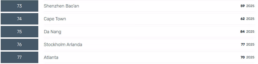 Cảng hàng không quốc tế Nội Bài vươn lên vị trí thứ 71 trong Top 100, tăng 8 bậc so với vị trí 79 năm 2025 và lần đầu vào top 10 sân bay tốt nhất thế giới trong nhóm công suất 30-40 triệu hành khách.
