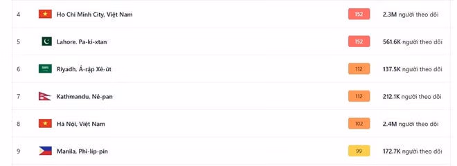 TP Hồ Chí Minh trong nhóm có chất lượng không khí ở mức màu đỏ "không lành mạnh" với chỉ số AQI là 152, xếp thứ 4.