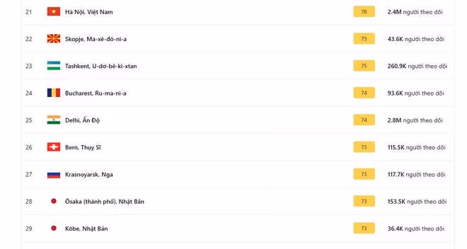 Với chỉ số AQI ở mức 78 và 67, màu vàng "trung bình," Hà Nội và Thành phố Hồ Chí Minh lần lượt đứng thứ 21 và 380 trong danh sách 126 thành phố ô nhiễm trên thế giới.
