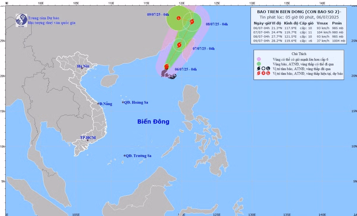 Theo Trung tâm Dự báo Khí tượng Thủy văn Quốc gia, vào 4h ngày 6/7, vị trí tâm bão ở vào khoảng 21,3 độ Vĩ Bắc; 117,9 độ Kinh Đông. Sức gió mạnh nhất vùng gần tâm bão mạnh cấp 10 (89-102km/h), giật cấp 12; di chuyển chậm theo hướng Bắc với tốc độ khoảng 5km/h.