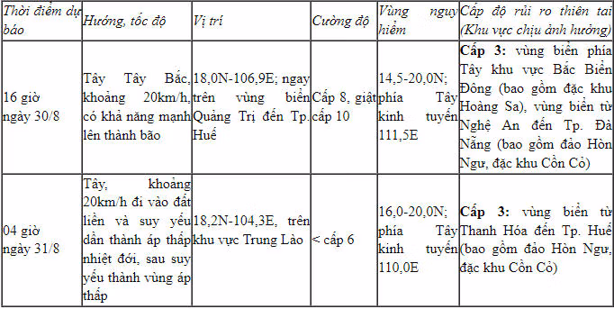 Trên đất liền: Từ trưa 30/8, ven biển Nghệ An – Quảng Trị: gió mạnh dần lên cấp 6, giật cấp 8.