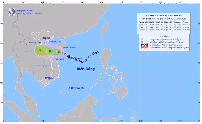 Theo Trung tâm dự báo khí tượng thủy văn Quốc gia thông tin vào lúc 6h, vị trí tâm áp thấp nhiệt đới (ATNĐ): Khoảng 17.7 độ Vĩ Bắc; 109.0 độ Kinh Đông, cách phía bắc Quảng Trị khoảng 270km về phía Đông, cách TP. Huế khoảng 210km về phía Đông Bắc.