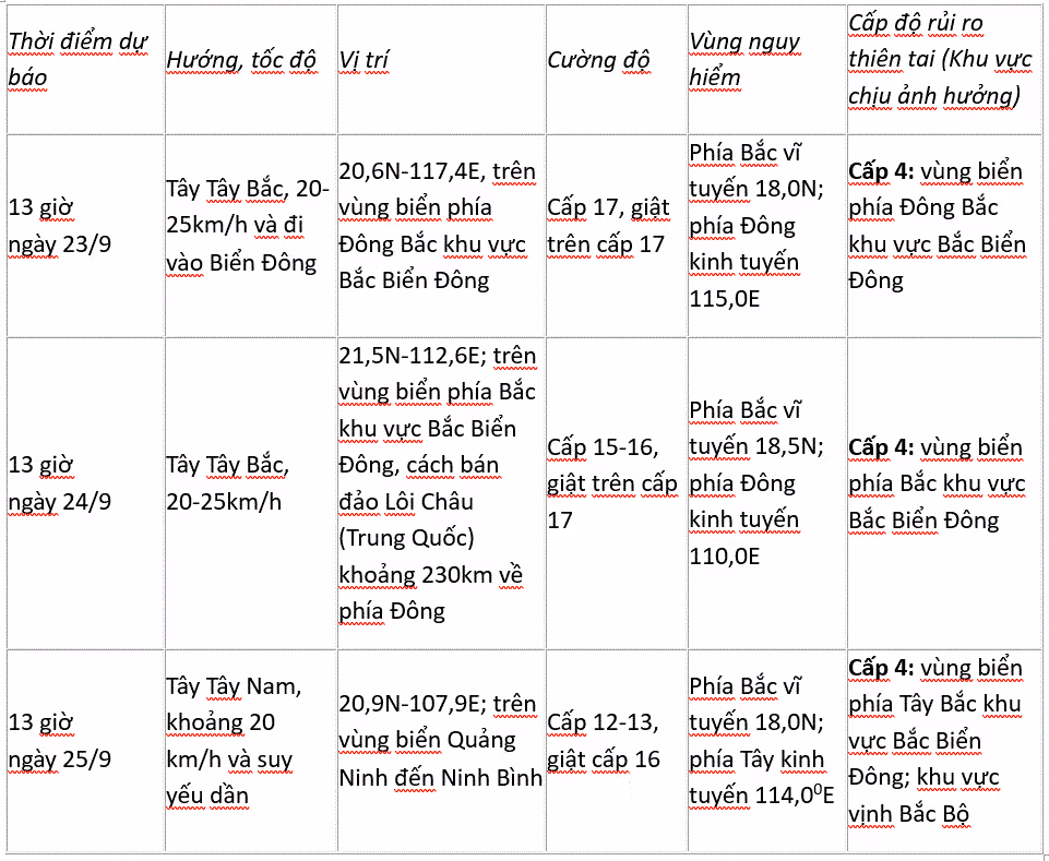Từ ngày 24/9, khu vực vịnh Bắc Bộ gió mạnh dần lên cấp 6-7, sau tăng lên cấp 8-10, vùng gần tâm bão đi qua cấp 11-13, giật trên cấp 16, sóng biển cao 5,0-7,0 m; biển động dữ dội. Tàu thuyền trong khu vực nguy hiểm có khả năng chịu tác động của dông, lốc, gió rất mạnh, sóng rất lớn.